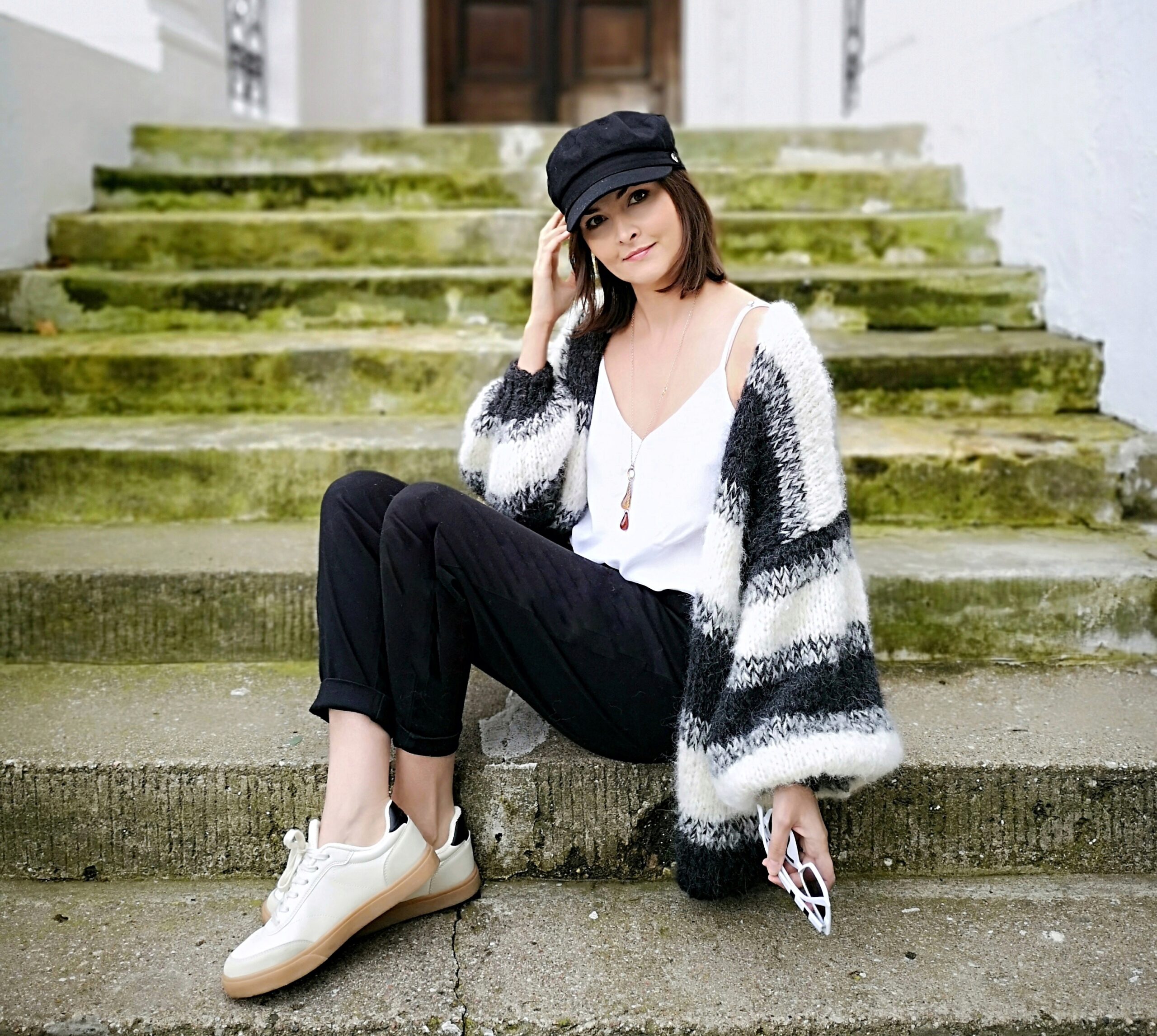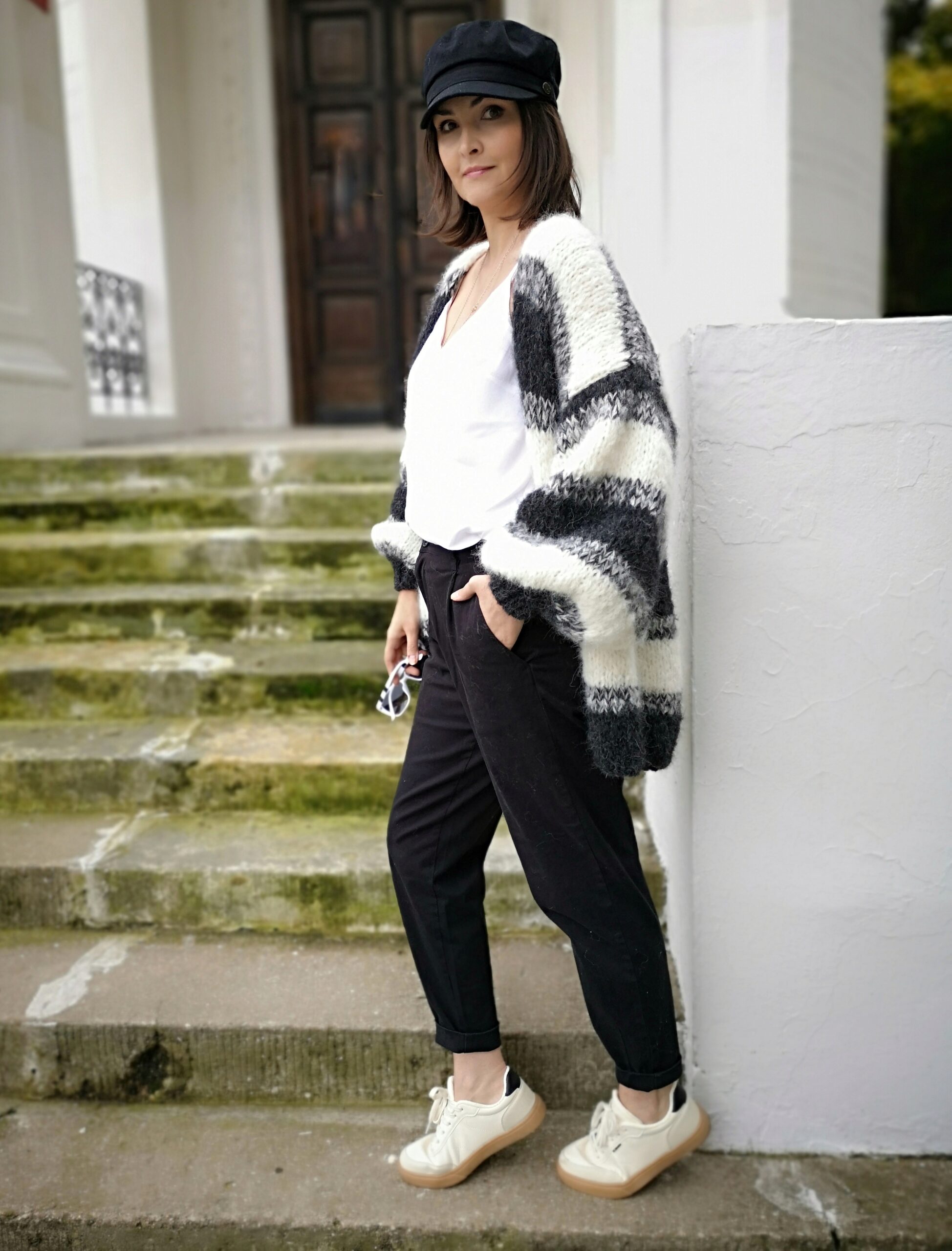 Kardigan Black&White spleciony z podwójnej nitki alpaki 71%, wełny 25% i poliamidu 4% to propozycja dla osób lubiących klasykę, elegancję z odrobiną fantazji. Kardigan jest lekki, puszysty ,a szerokie lekko balonowe rękawy dodają mu uroku i charakteru.