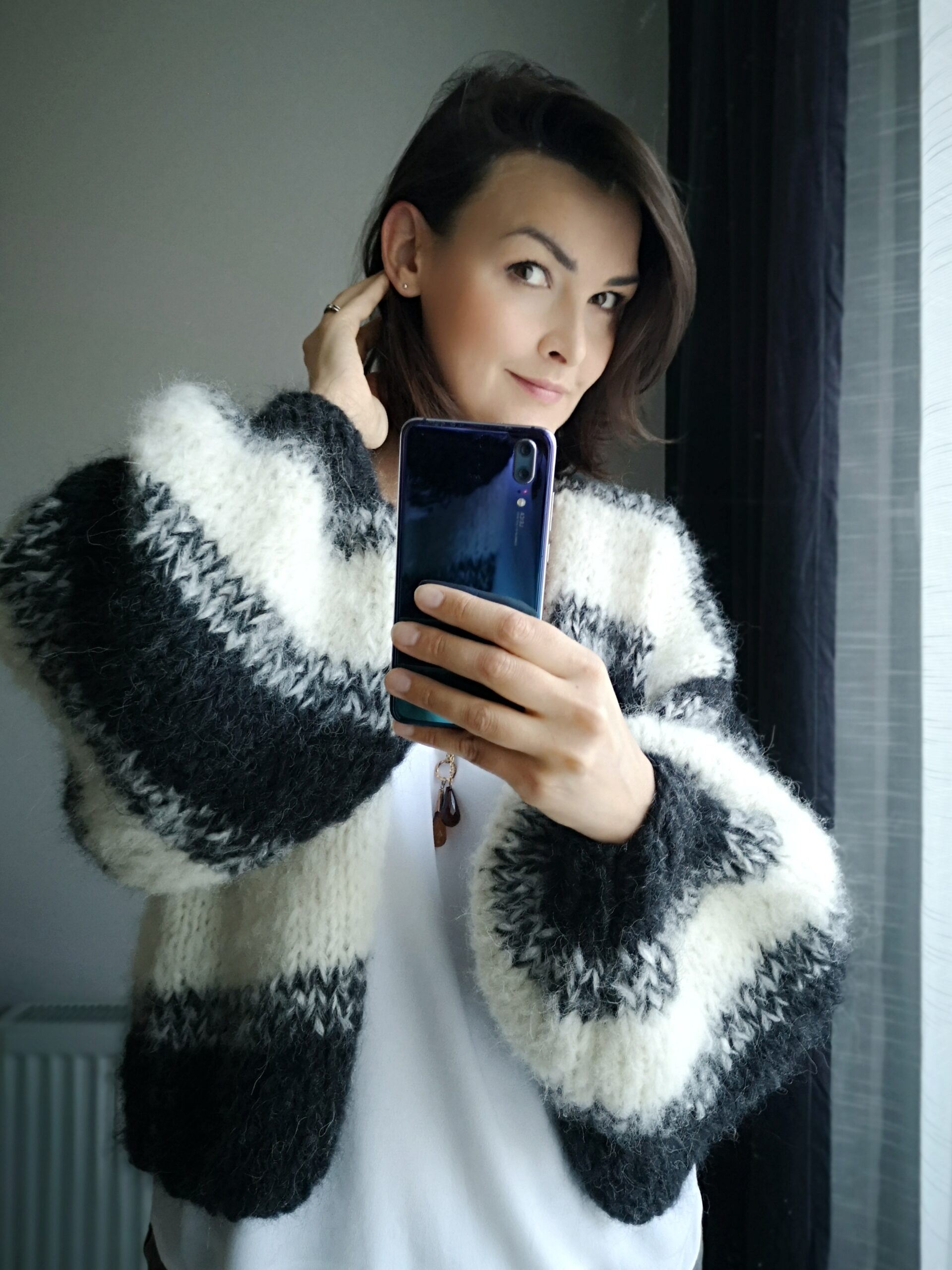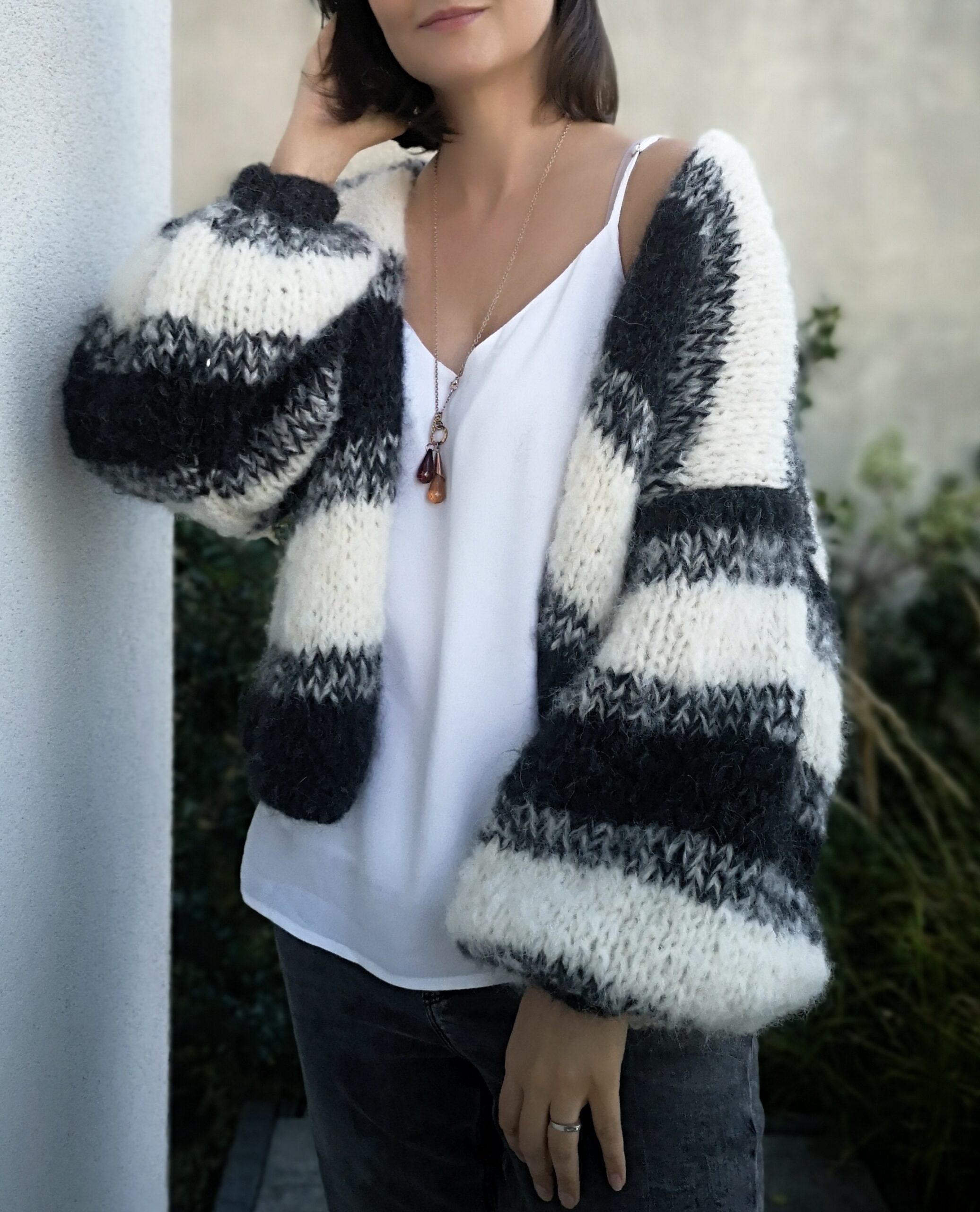 Kardigan Black&White spleciony z podwójnej nitki alpaki 71%, wełny 25% i poliamidu 4% to propozycja dla osób lubiących klasykę, elegancję z odrobiną fantazji. Kardigan jest lekki, puszysty ,a szerokie lekko balonowe rękawy dodają mu uroku i charakteru.