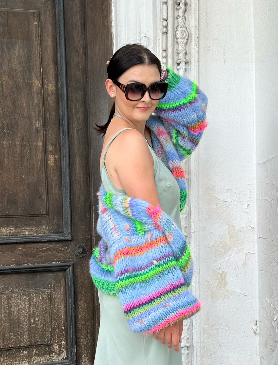 Kardigan Blue Butterfly to energetyczne połączenie włóczek: alpaki, merino, jedwabiu , moheru z minimalną domieszką akrylu. Fantazyjne włóczki z kolorowymi nopkami dodają mu charakteru i oryginalności.Kardigan jest niezwykle kolorowy (w przewagą odcieni niebieskiego), puszysty i cudownie miękki. To całoroczny model , dla kobiet które lubią naturalne materiały, wygodę i uwielbiają być zauważone.
