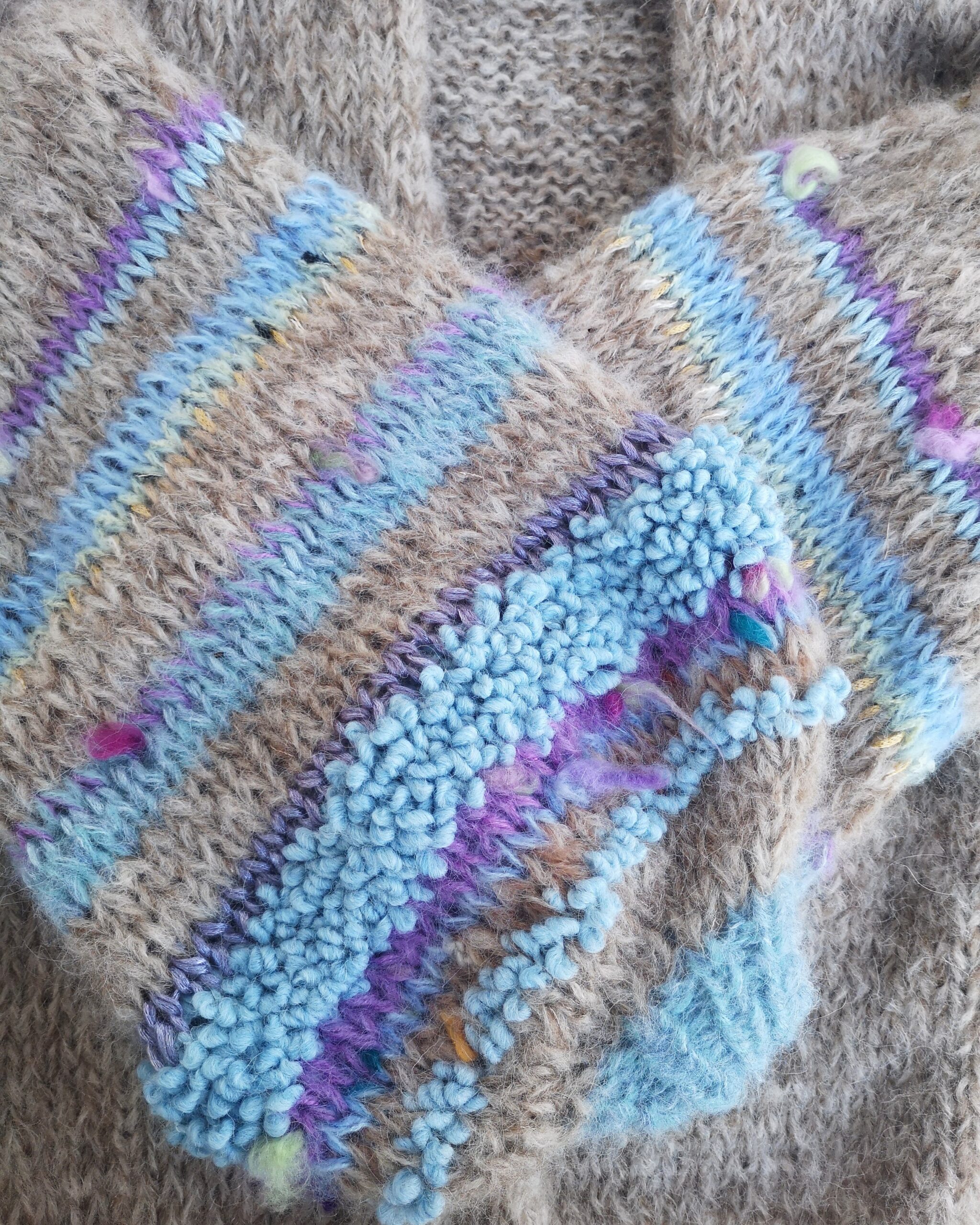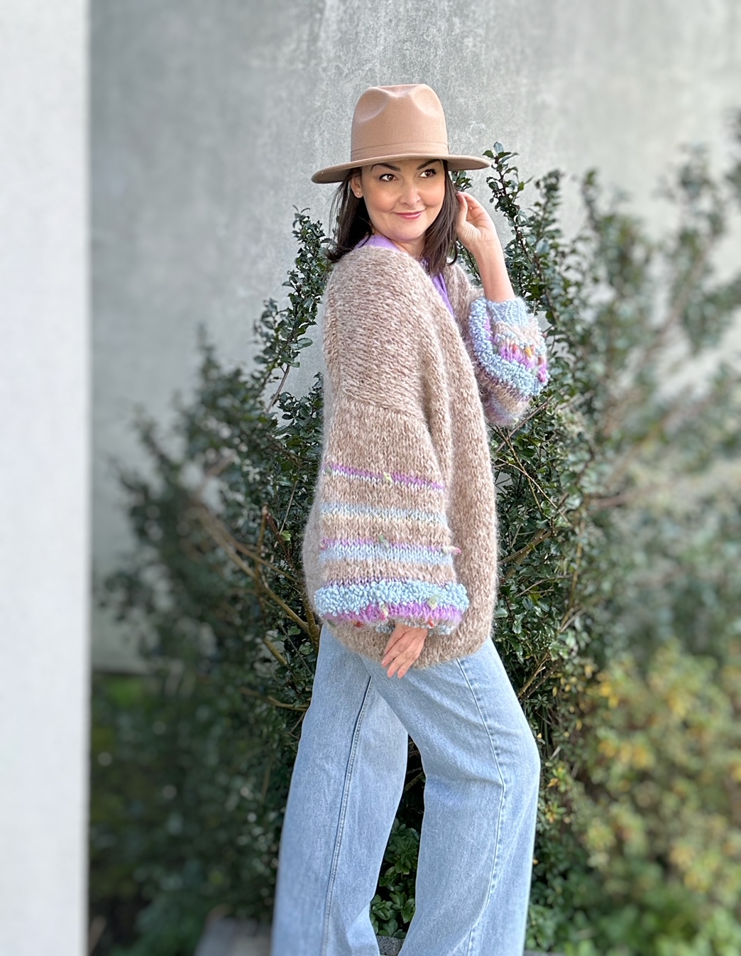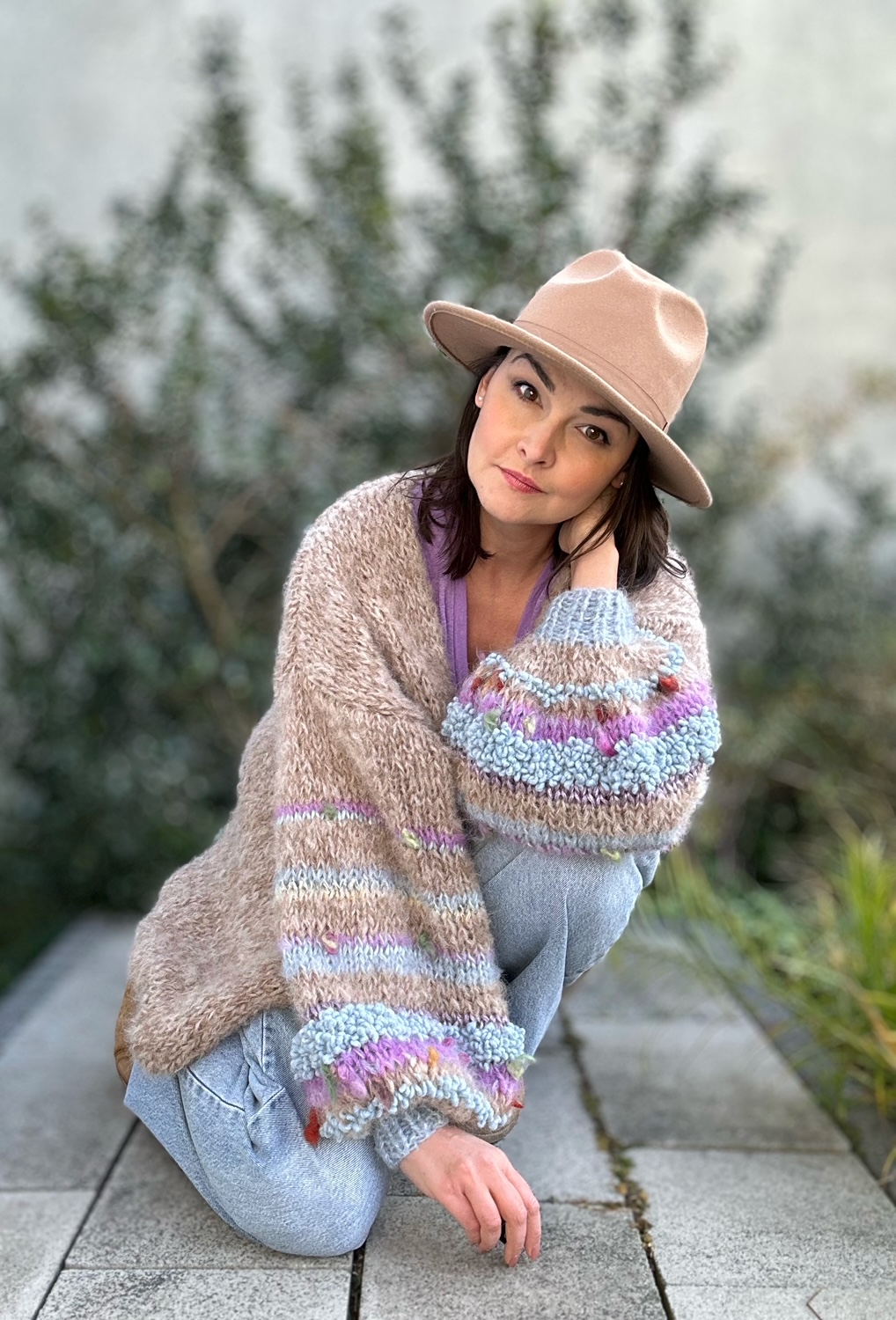 Kardigan Blue Pearl spleciony ręcznie na drutach z podwójnej nitki włóczek z alpaki, merino i jedwabiu w kolorze brązowo beżowym. Kardigan ma efektowne, szerokie rękawy , w które wplecione są włóczki fantazyjne. Kardigan jest miękki, naturalny i przewiewny. Idealny do jeansów, sukienek i spódnic. Bardzo efektowny i oryginalny.