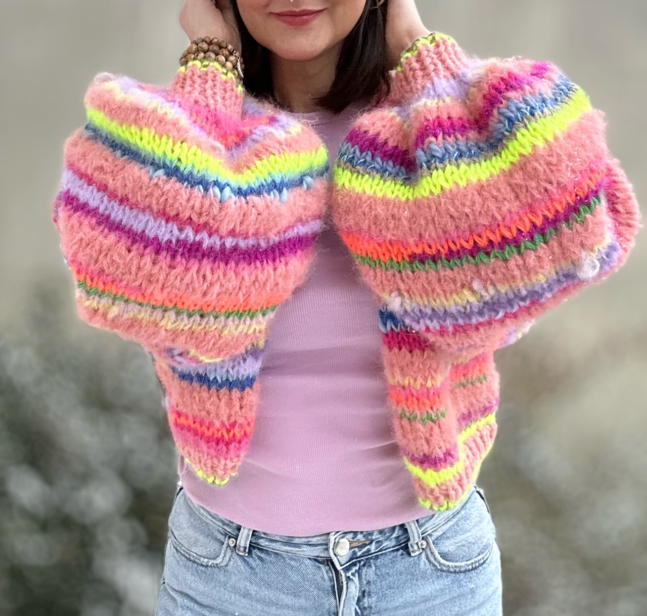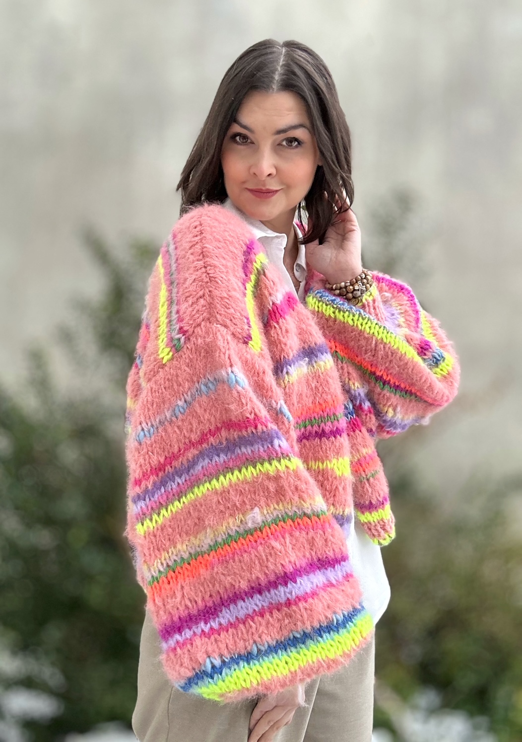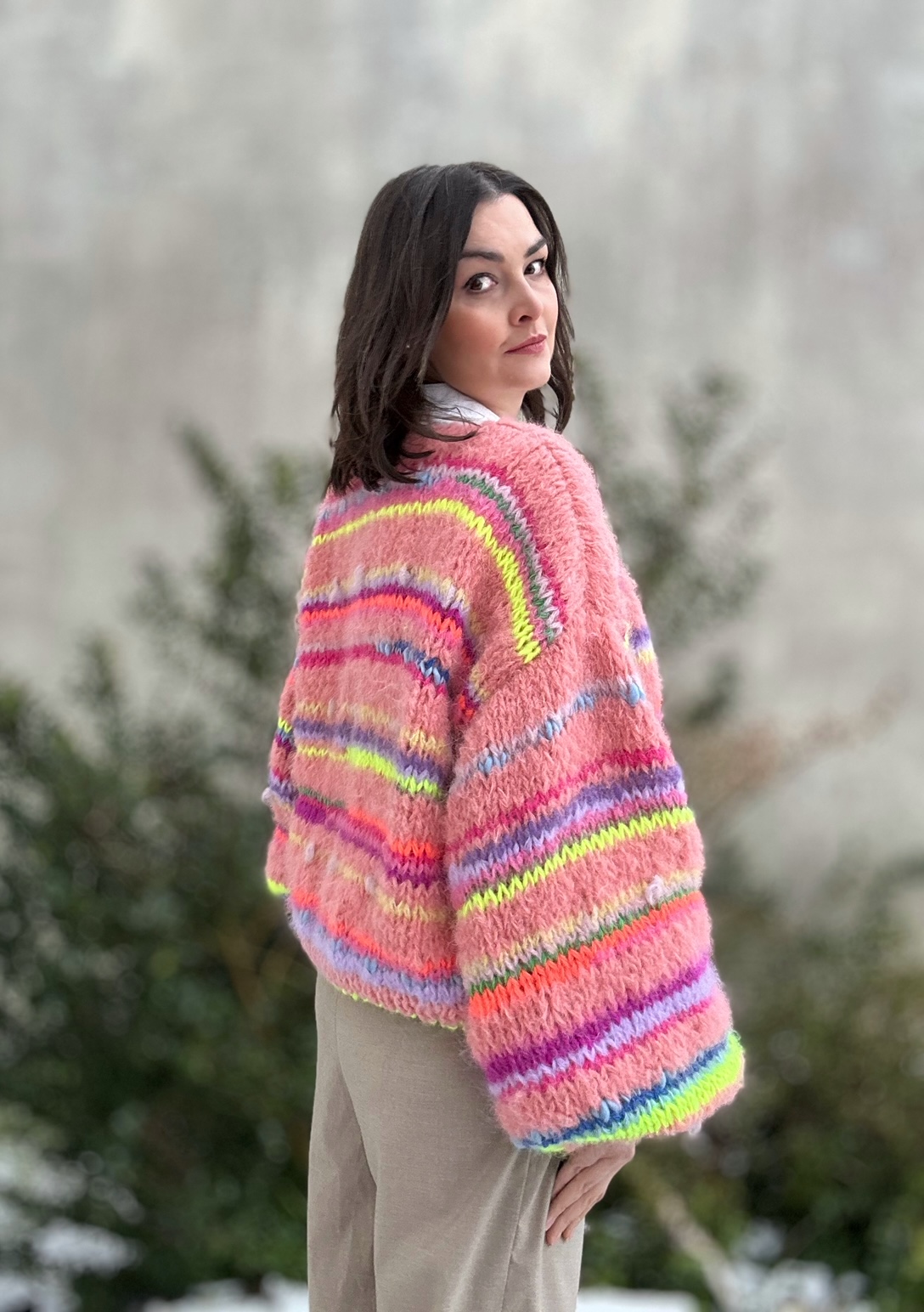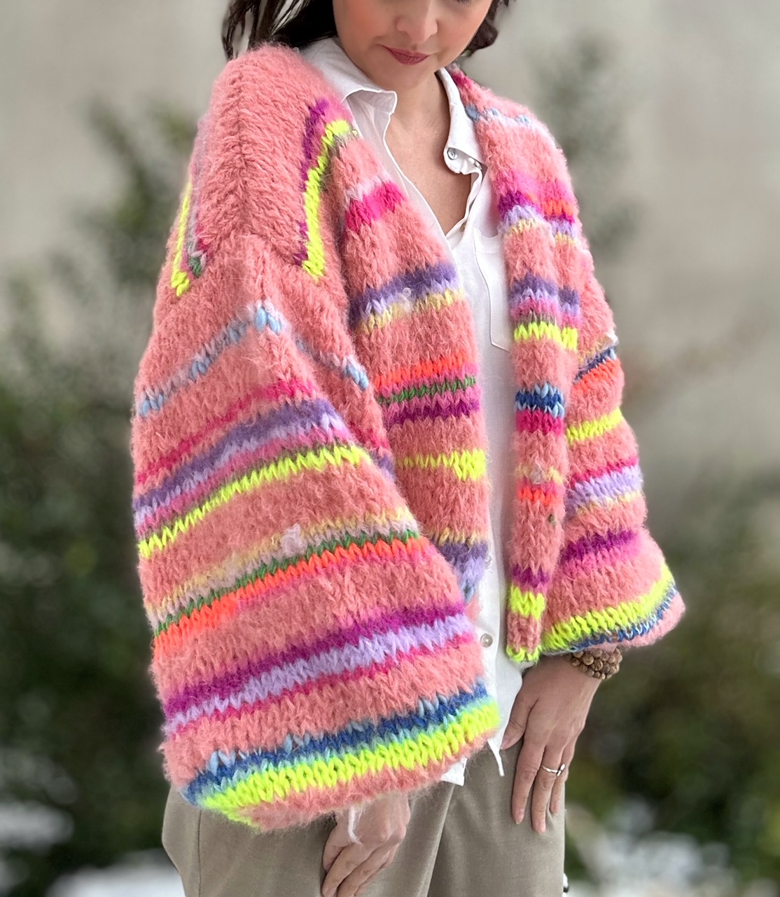 Kardigan Peach Butterfly to energetyczne połączenie włóczek: alpaki, merino, jedwabiu , moheru z minimalną domieszką akrylu. Fantazyjne , neonowe włóczki dodają mu charakteru i oryginalności. Kardigan jest niezwykle kolorowy (w przewagą odcieni brązu), puszysty i cudownie  miękki. To całoroczny model , dla kobiet które lubią naturalne materiały, wygodę i uwielbiają być zauważone.
