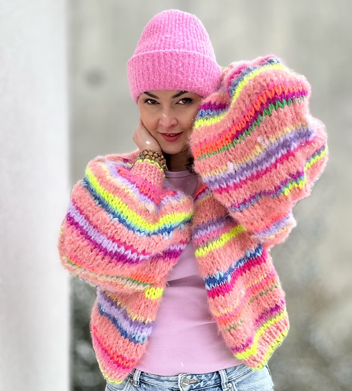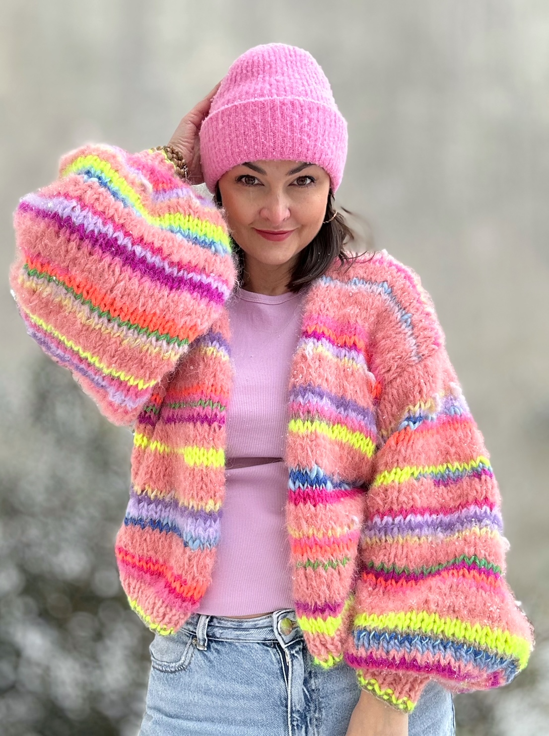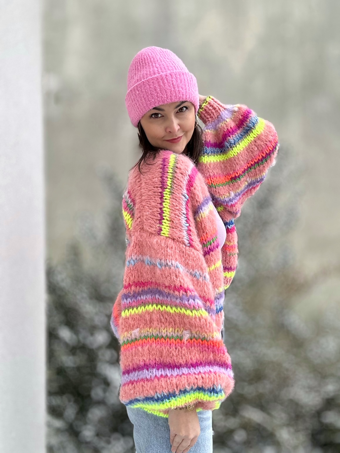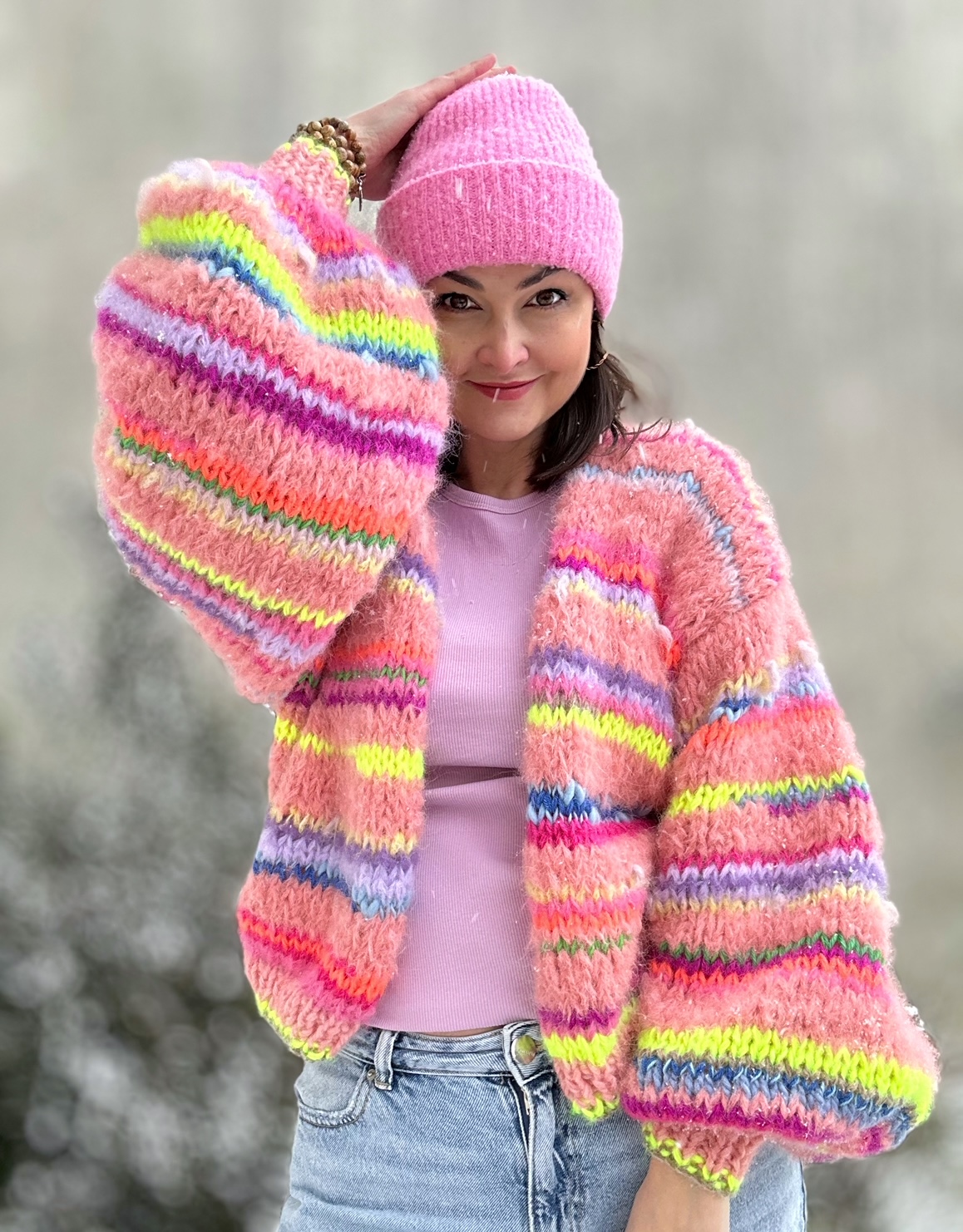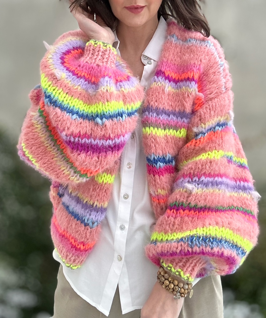 Kardigan Peach Butterfly to energetyczne połączenie włóczek: alpaki, merino, jedwabiu , moheru z minimalną domieszką akrylu. Fantazyjne , neonowe włóczki dodają mu charakteru i oryginalności. Kardigan jest niezwykle kolorowy (w przewagą odcieni brązu), puszysty i cudownie  miękki. To całoroczny model , dla kobiet które lubią naturalne materiały, wygodę i uwielbiają być zauważone.