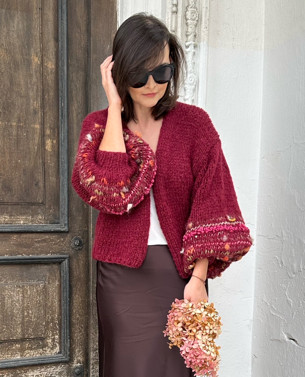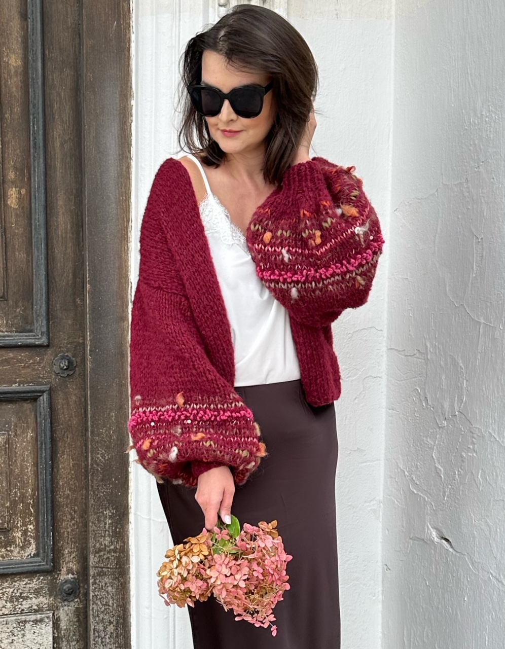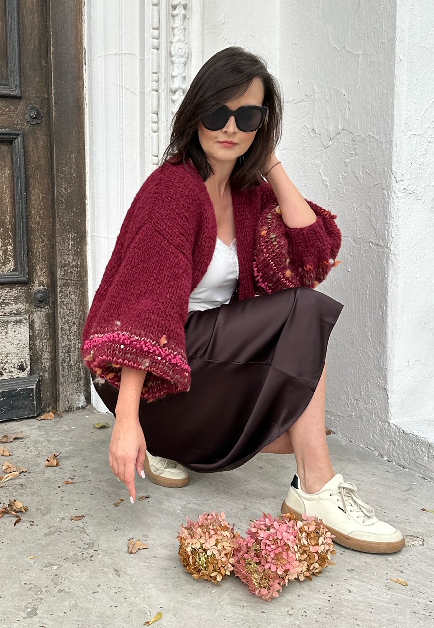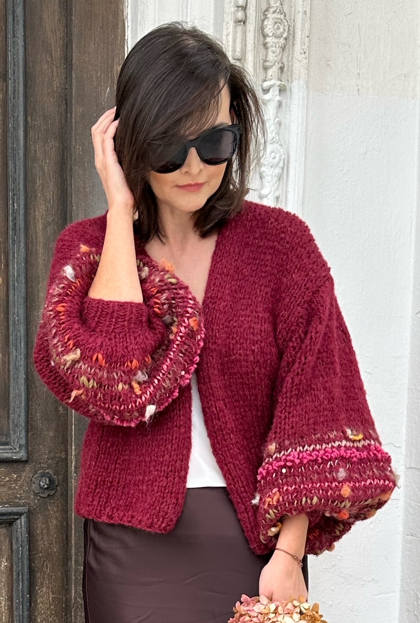 Lekki , przewiewny i efektowny kardigan Burgundy Flowerto przepiękna propozycja na każdą porę roku. Kardigan ma szerokie rękawy,  z dodatkiem efektownych i fantazyjnych włóczek. Kardigan jest w pięknym , szalenie modnym w obecnym sezonie odcieniu bordo. Kobiecy i oryginalny. Spleciony na drutach jest z naturalnych włóczek.