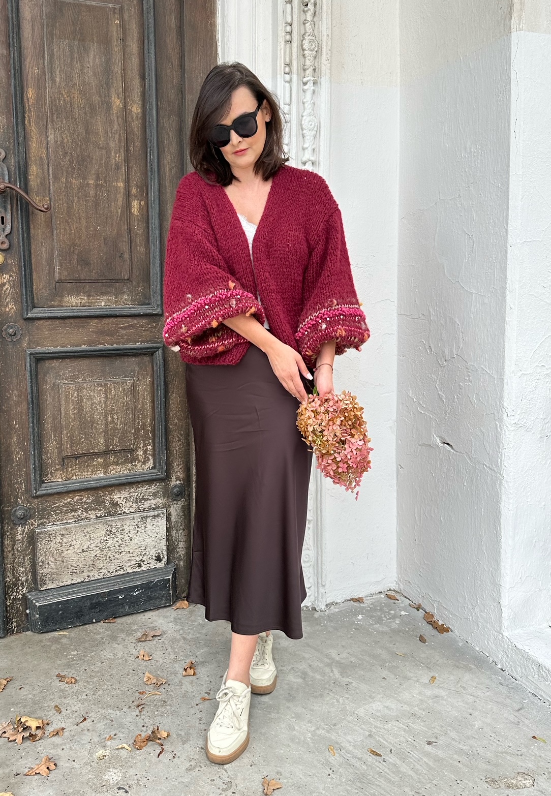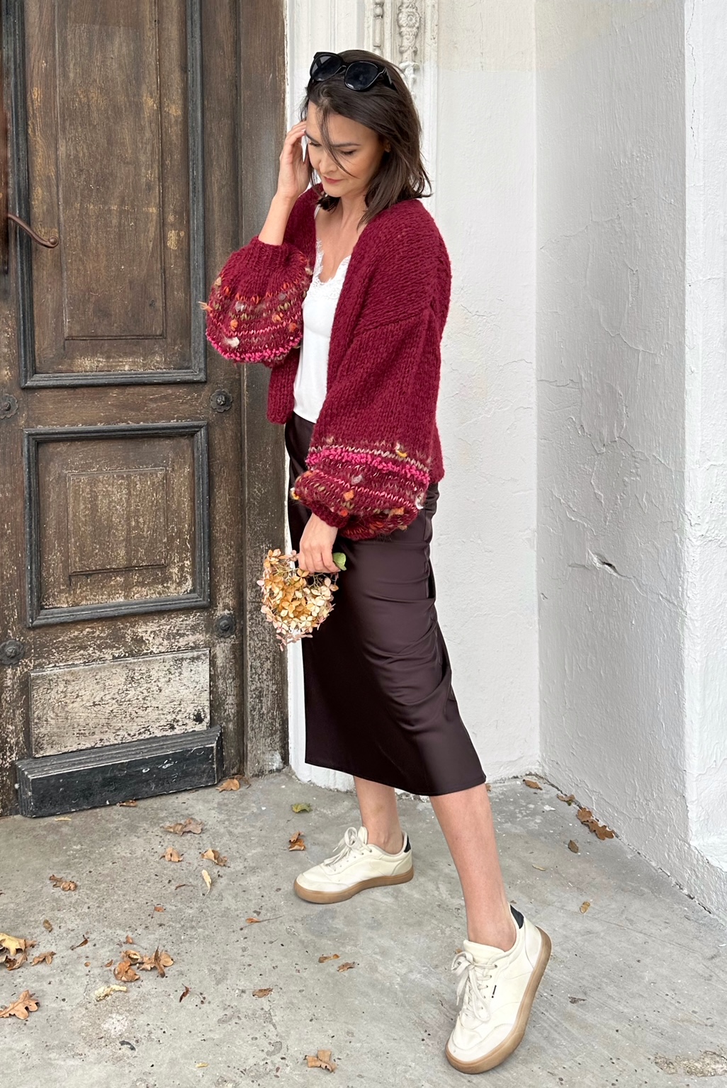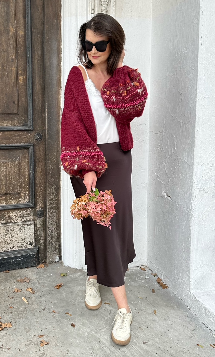 Lekki , przewiewny i efektowny kardigan Burgundy Flowerto przepiękna propozycja na każdą porę roku. Kardigan ma szerokie rękawy,  z dodatkiem efektownych i fantazyjnych włóczek. Kardigan jest w pięknym , szalenie modnym w obecnym sezonie odcieniu bordo. Kobiecy i oryginalny. Spleciony na drutach jest z naturalnych włóczek.