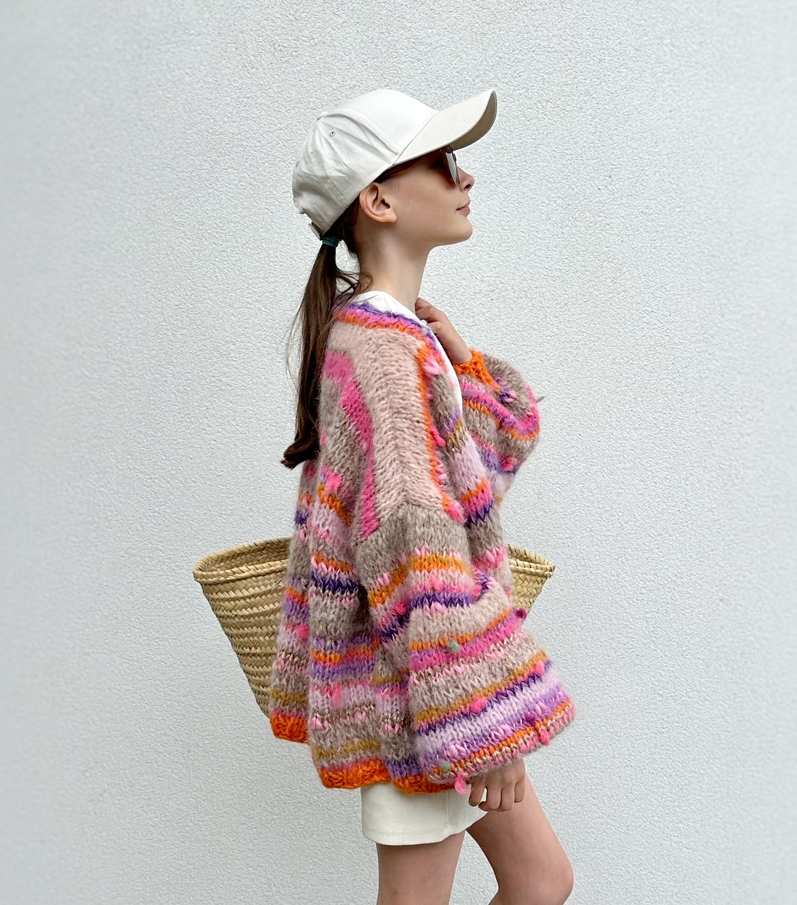 Kardigan Carola, całoroczny, niezwykle efektowny, kobiecy, delikatny i puszysty kardigan spleciony ręcznie w przeważającej większości z naturalnych przędz, ozdobiony efektownymi włóczkami fantazyjnymi, pełen koloru i fantazji.