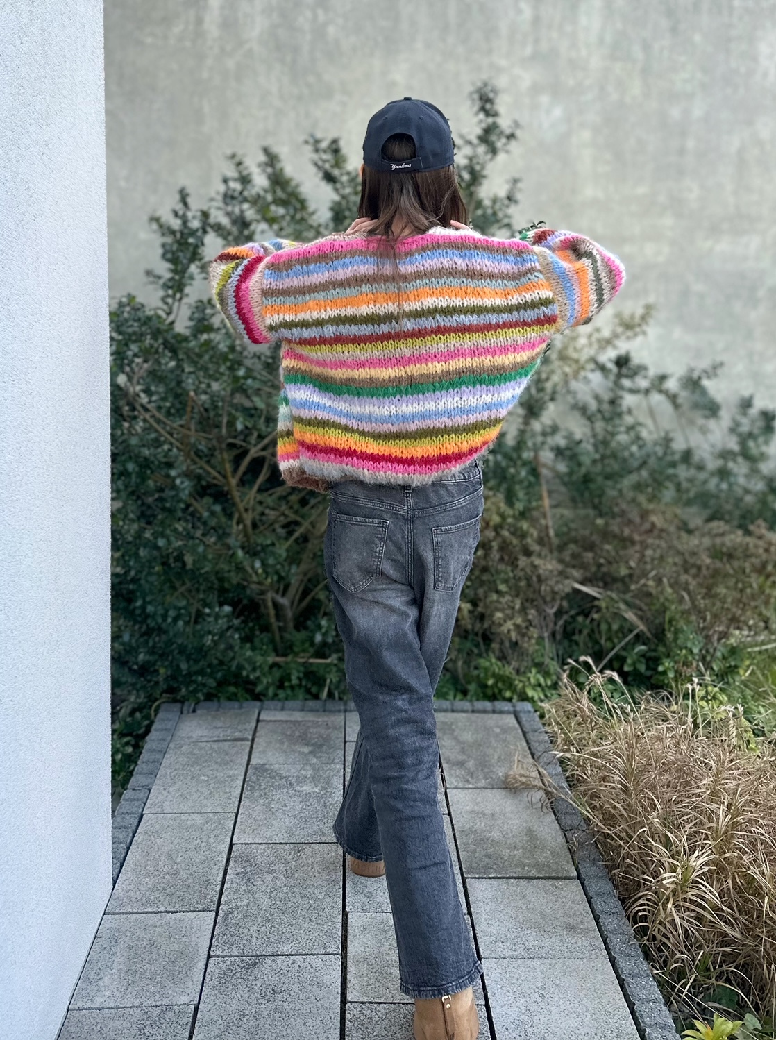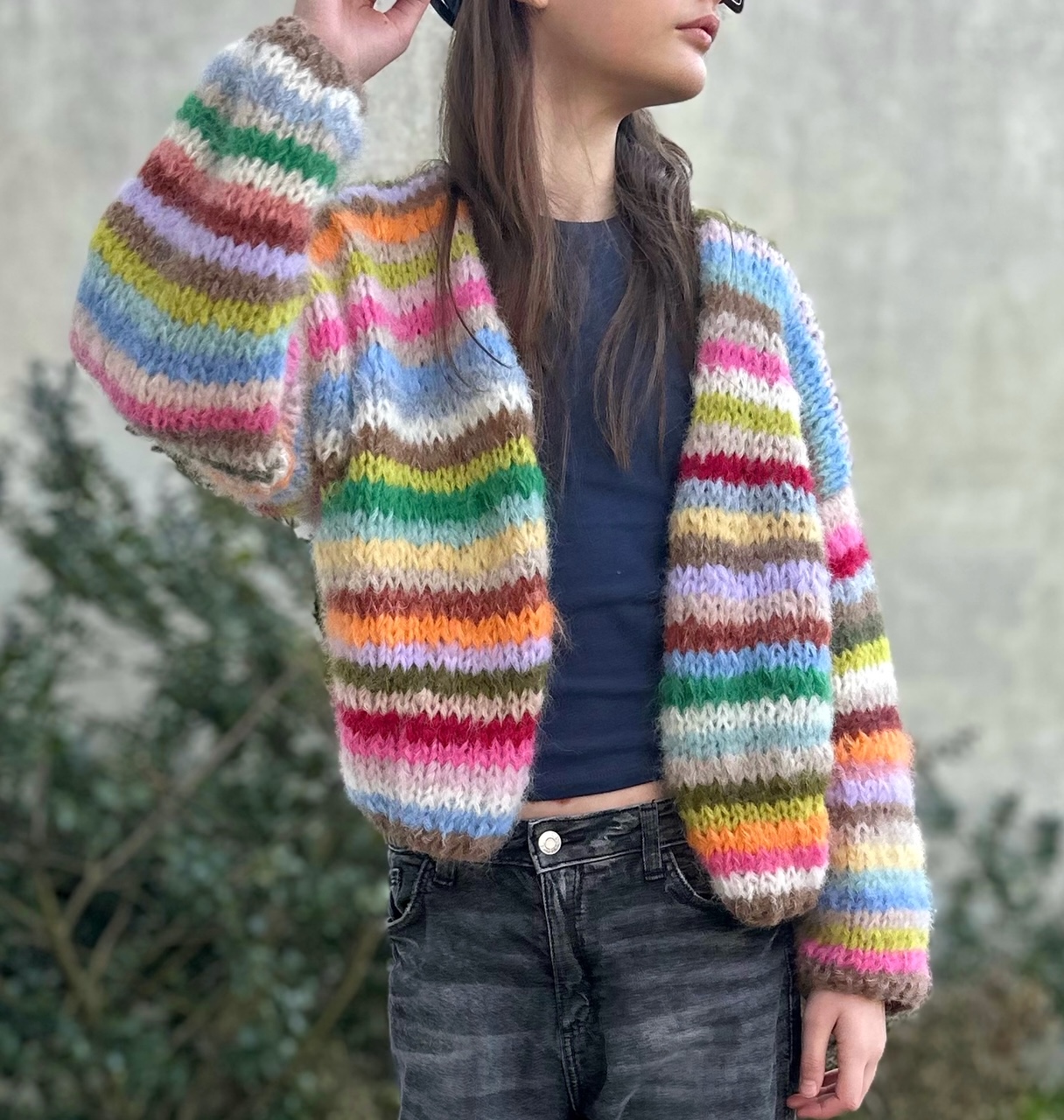 Kardigan Colorina zrobiony na drutach z alpaki , wełny merino, jedwabiu i moherku ze śladową ilością akrylu. lekki, kolorowy, wygodny. To całoroczna propozycja dla osób ceniących komfort i naturalne przędze. Układ pasków może róznić się od tych na zdjęciach.