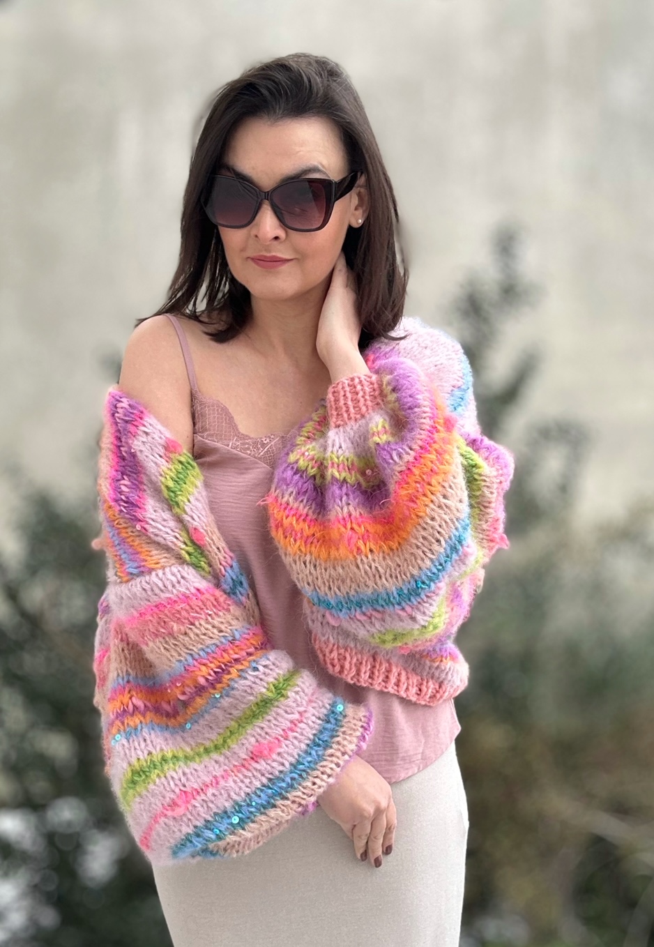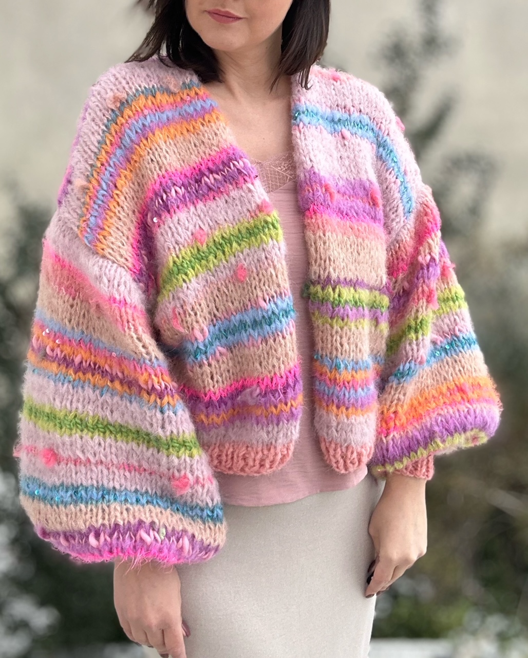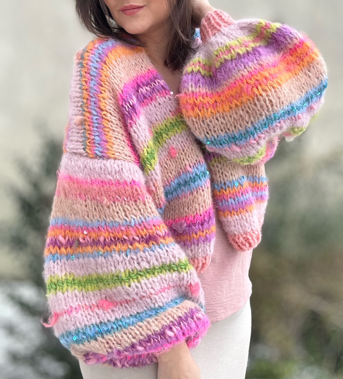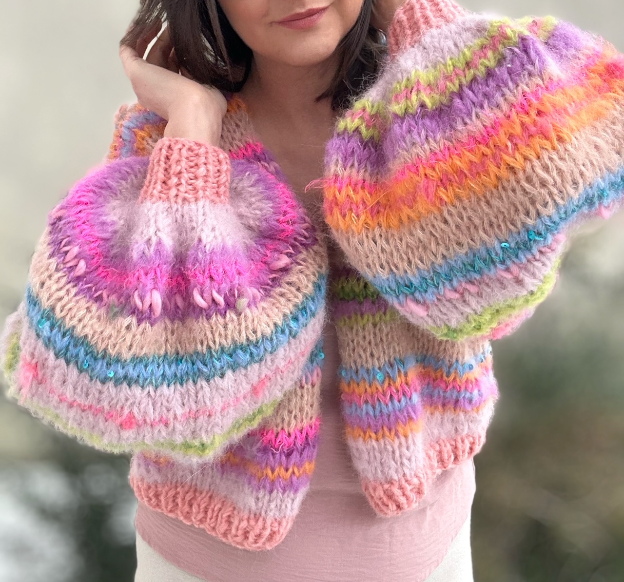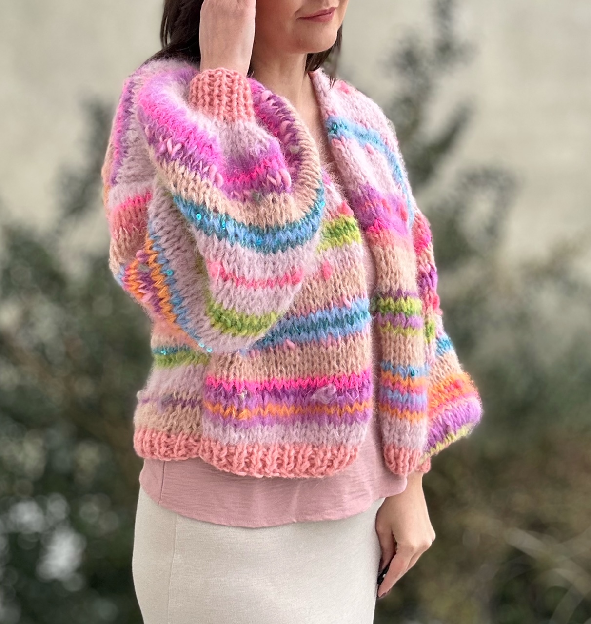 Cudowne połączenie beżu , różu, odcieni zieleni, niebieskości , fioletu, beżu, z włóczkami fantazyjnymi, oraz gdzieniegdzie drobnymi cekinkami, sprawia ,że zachwyca oryginalnością.