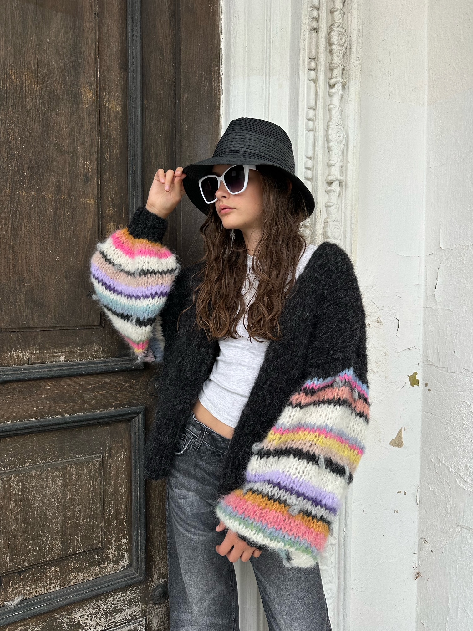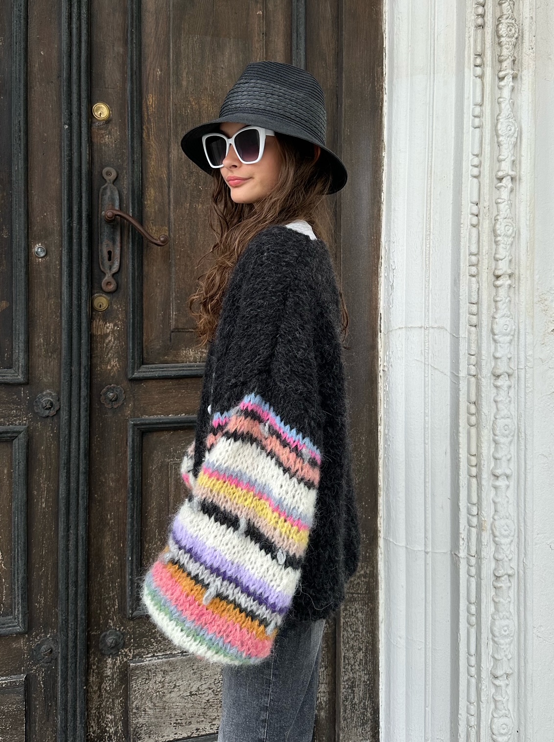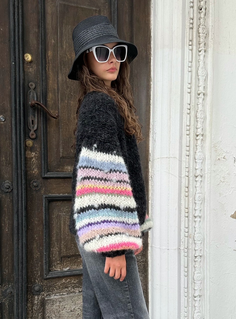 Kardigan Laura w kolorze czarnym ( czerń z jaśniejszymi niteczkami przędzy , jak na zdjęciach) z szerokimi rękawami , ozdobionymi kolorowymi . również gdzieniegdzie włóczkami fantazyjnymi, został spleciony ręcznie z naturalnych włóczek (pierwsza to 77% Alpaka, 23% Jedwab, druga to:71% Alpaka, 25% Wełna, 4% Poliamid) Kardigan jest miękki , puszysty i efektowny. Pasuje do wielu stylizacji.