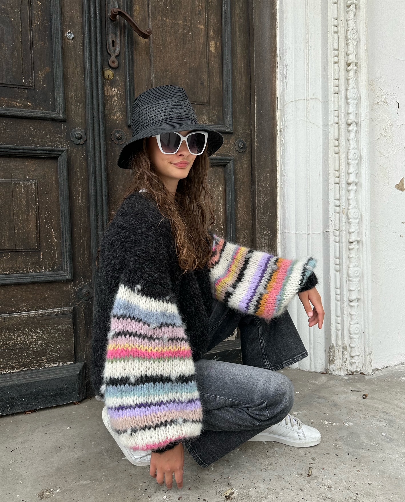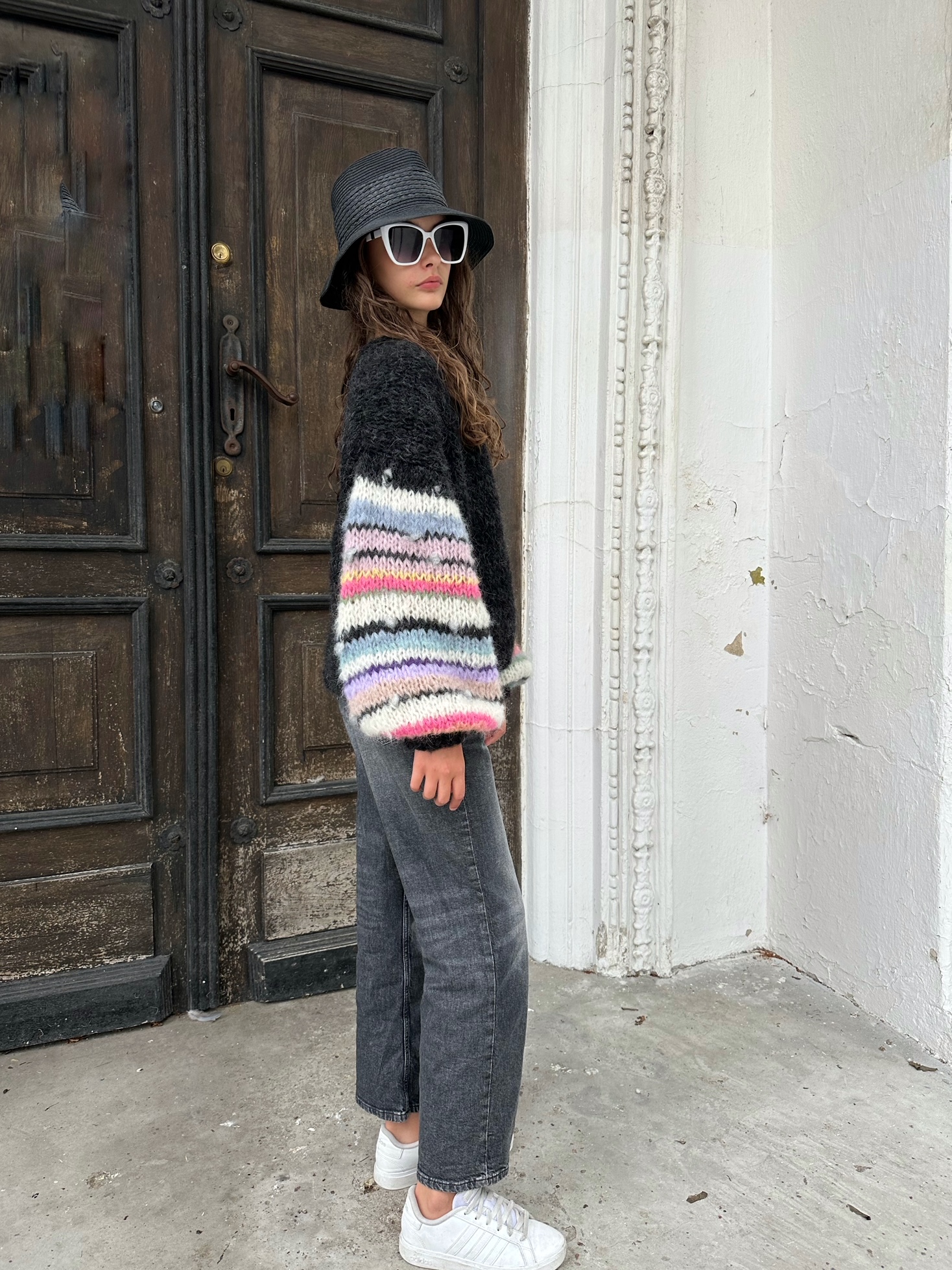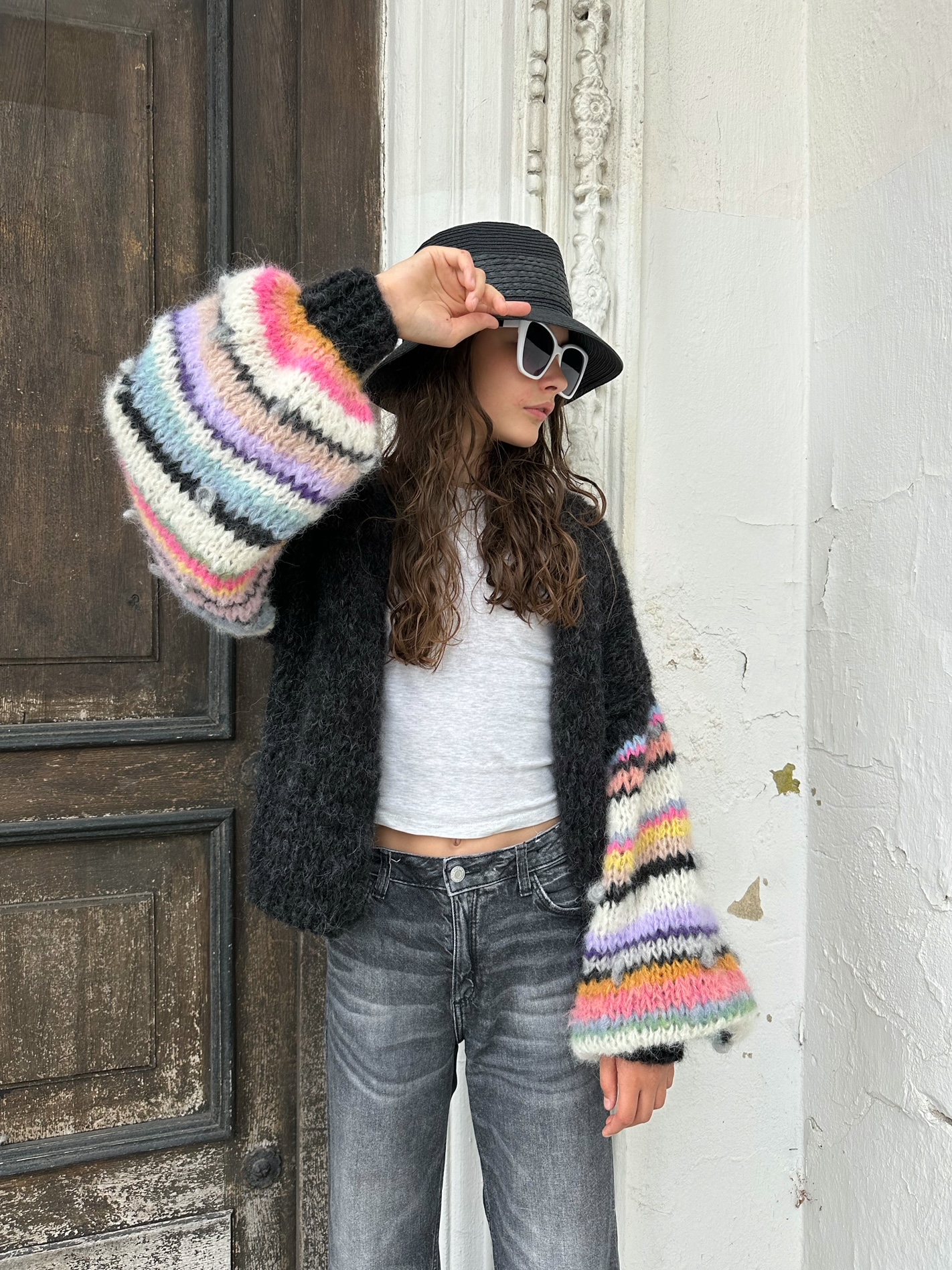 Kardigan Laura w kolorze czarnym ( czerń z jaśniejszymi niteczkami przędzy , jak na zdjęciach) z szerokimi rękawami , ozdobionymi kolorowymi . również gdzieniegdzie włóczkami fantazyjnymi, został spleciony ręcznie z naturalnych włóczek (pierwsza to 77% Alpaka, 23% Jedwab, druga to:71% Alpaka, 25% Wełna, 4% Poliamid) Kardigan jest miękki , puszysty i efektowny. Pasuje do wielu stylizacji.