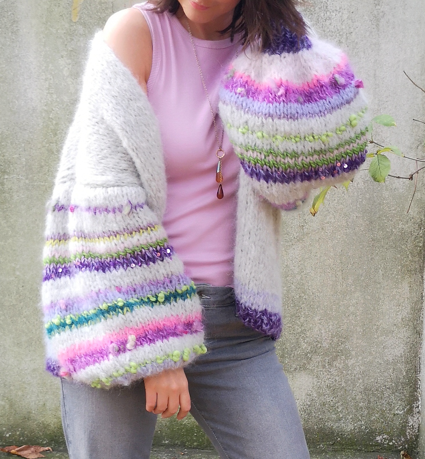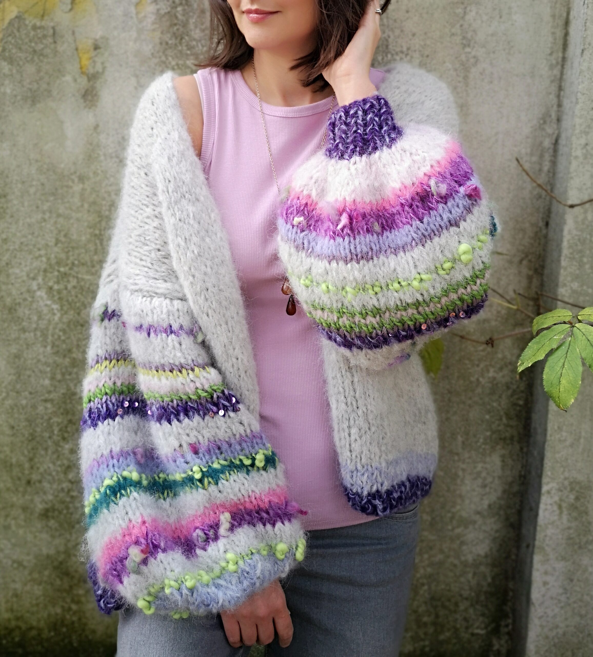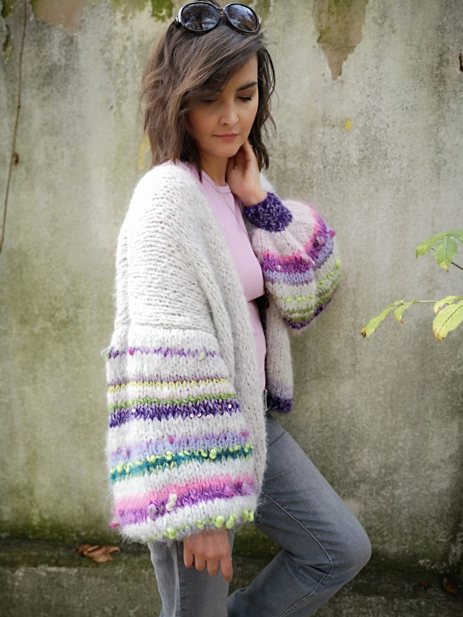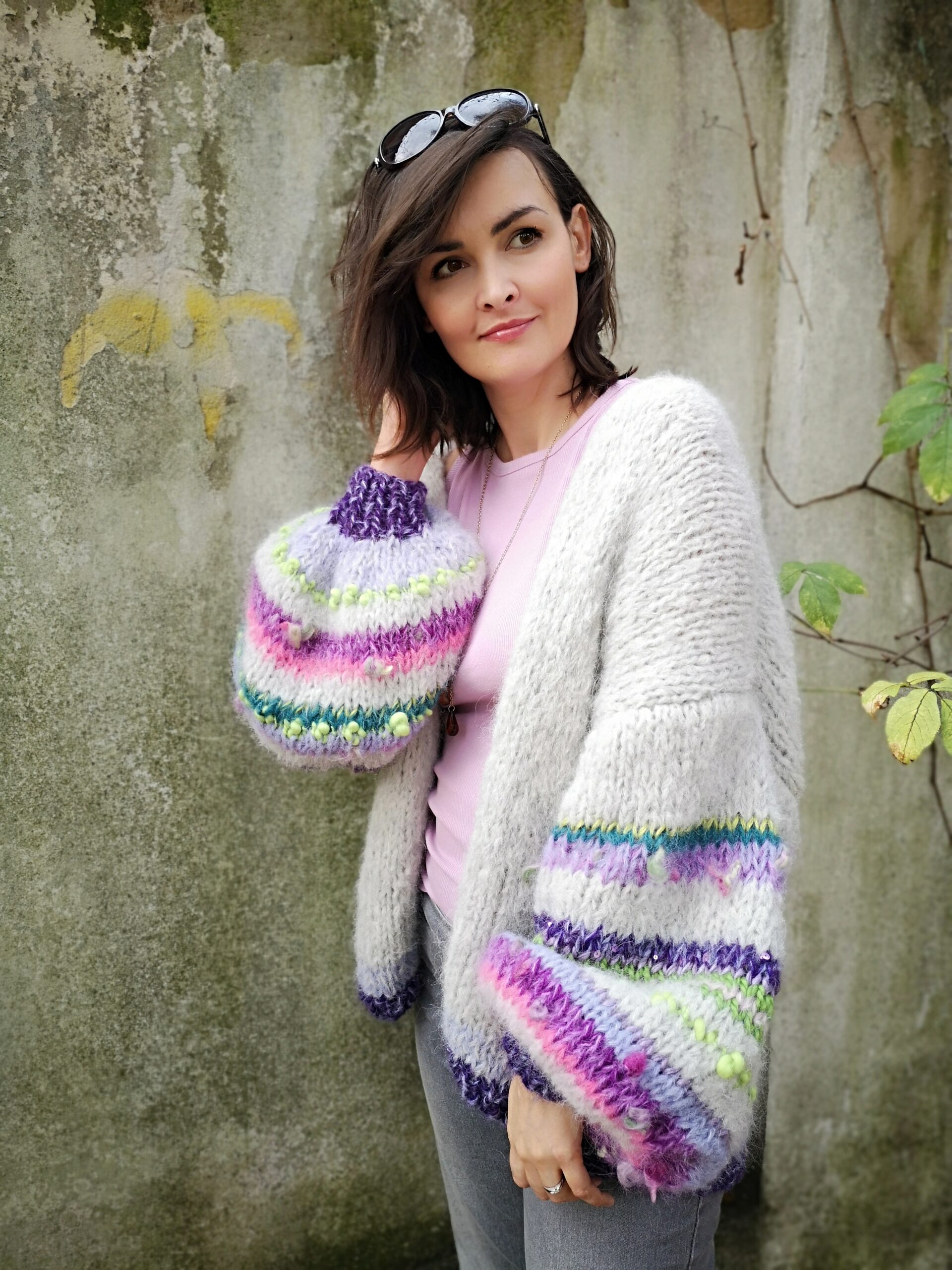 Kardigan Lea spleciony z podwójnej nitki alpaki 71%, wełny 25% i poliamidu 4% z dodatkiem włóczek fantazyjnych to propozycja dla osób lubiących klasykę, elegancję z odrobiną fantazji. Kardigan jest lekki, puszysty ,a szerokie lekko balonowe rękawy dodają mu uroku i charakteru.