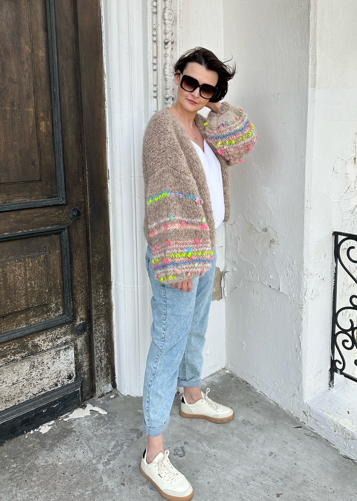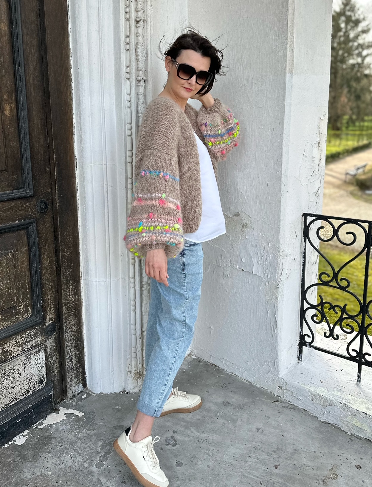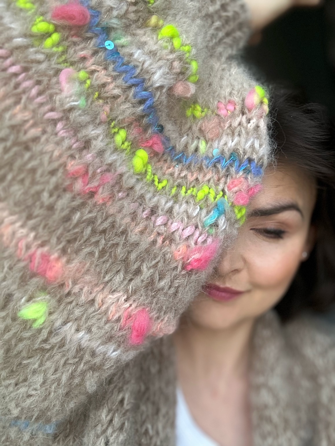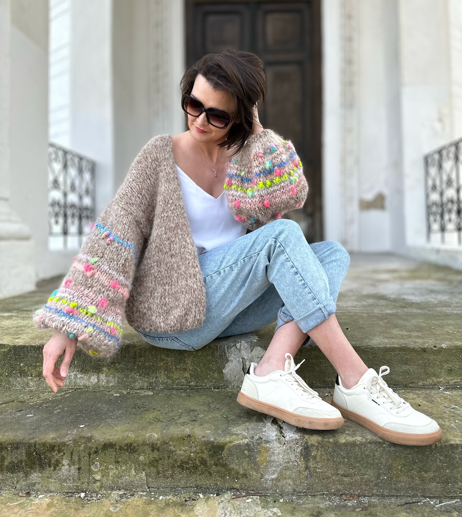 Kardigam Lime Flower z szerokimi rękawami, spleciony na drutach z alpaki, merino i jedwabiu , z dodatkiem fantazyjnej włóczki na rękawach. Modny, efektowny, naturalny. Idealny do wielu stylizacji i do wielu kolorów bazowych Twojej stylizacji.