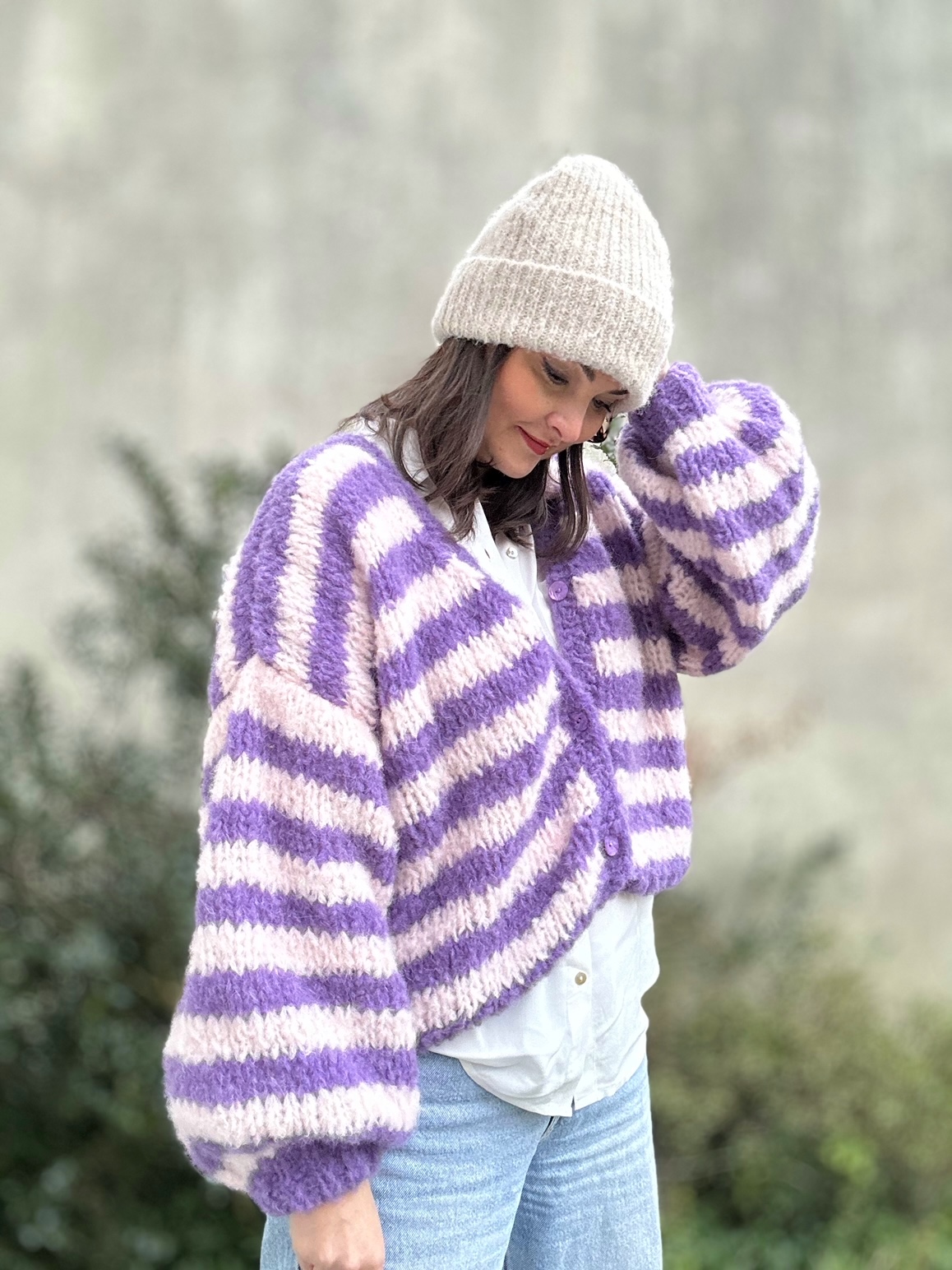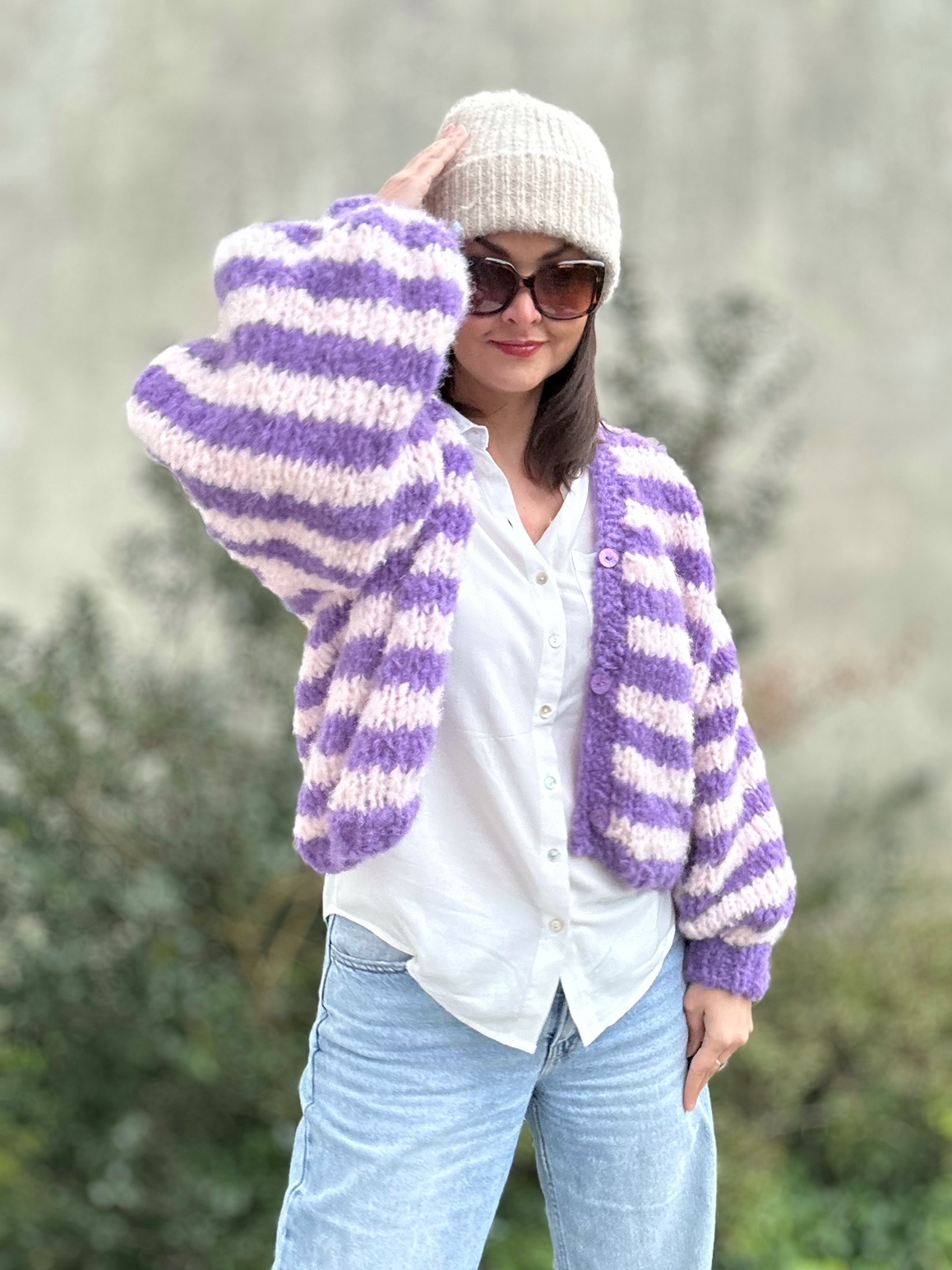 Kardigan Linda to całoroczny kardigan spleciony na drutach z naturalnej włóczki w paski koloru fioletowego i blado różowego. Jest lekki , miękki , puszysty, ma szersze rękawy i można go zapiac na dwa guziczki. Skład:55% alpaka , 40% wełna, 5% nylon.
