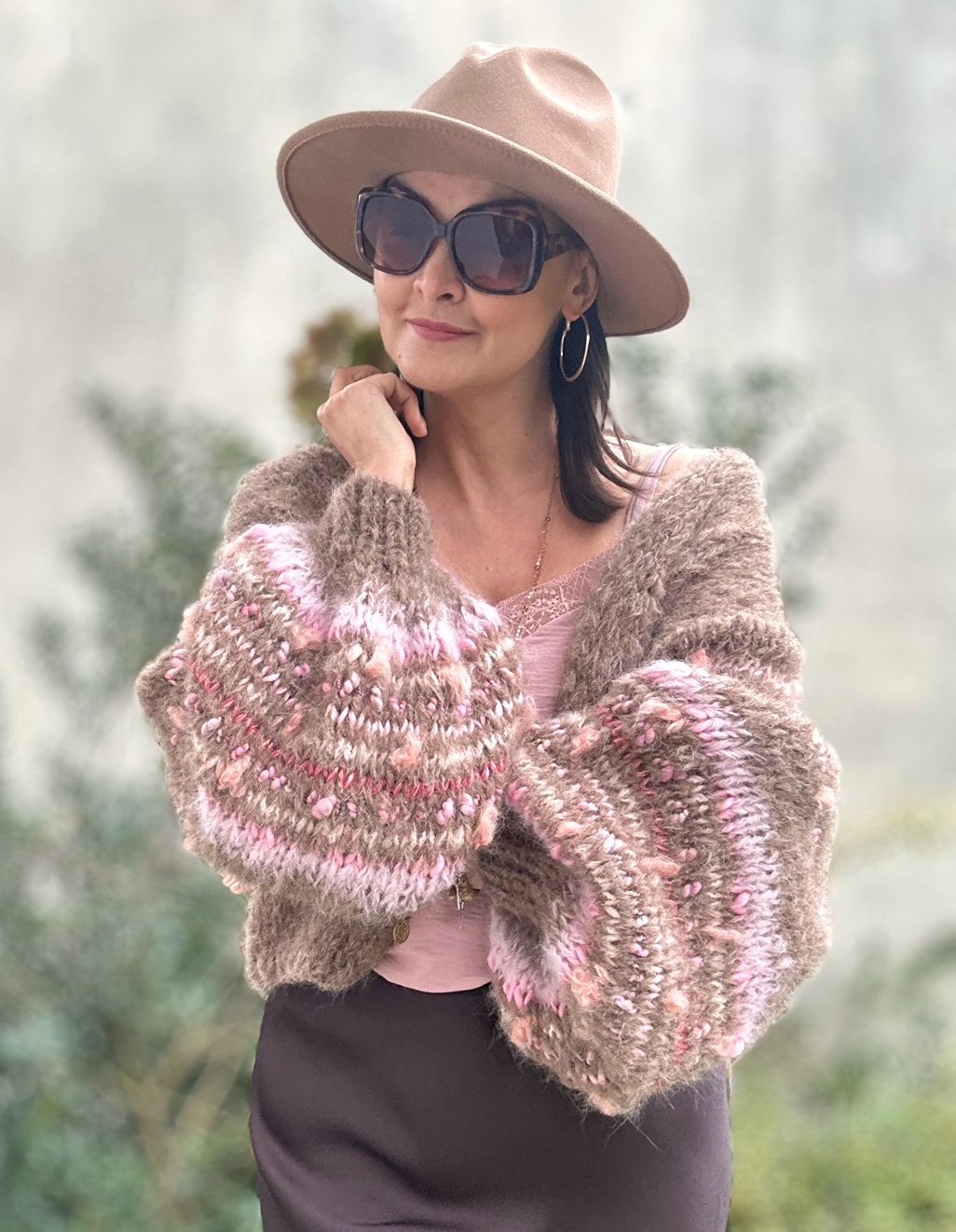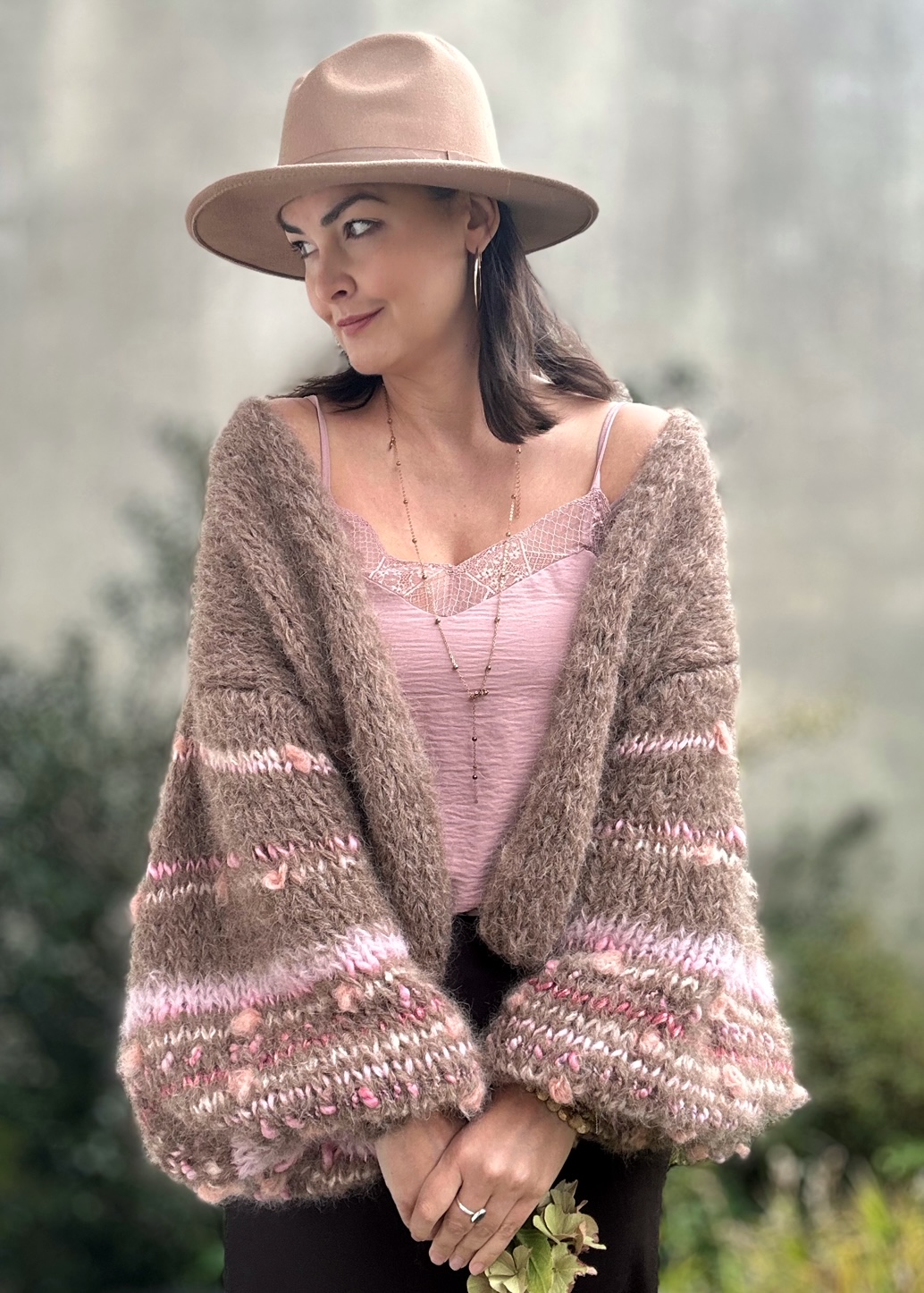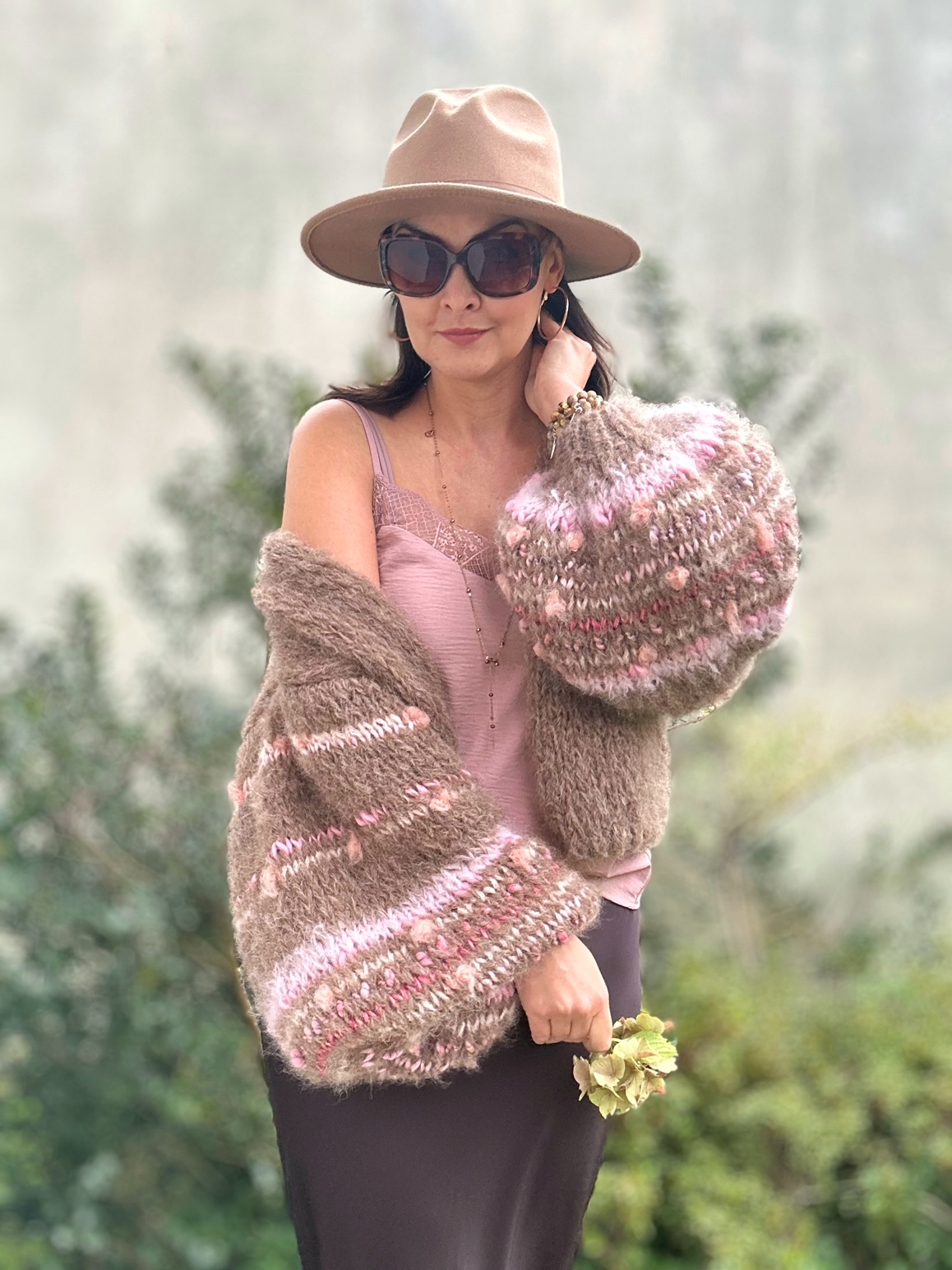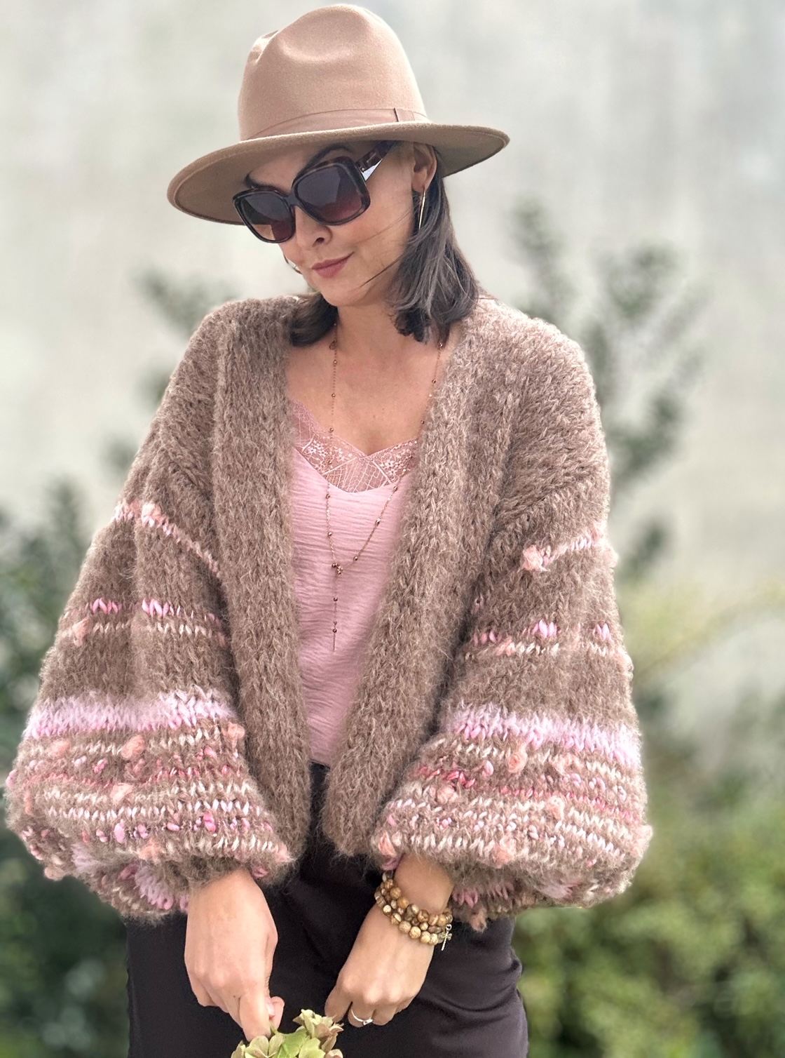 Jedyny, niepowtarzalny , całoroczny kardigan spleciony ręcznie na drutach z podwójnej nitki alpaki i wełny z dodatkiem fantazyjnej włóczki wplecionej w szerokie rękawy. Nie gryzie, jest bardzo miękki i puszysty. Idealny do jeansów, spódnic i letnich sukienek. Elegancki i kobiecy, a jednocześnie bardzo efektowny, ale nie krzykliwy. Uwaga: Jego kolor jest ciemniejszy, taki jak na zdjęciu w pomieszczeniu.