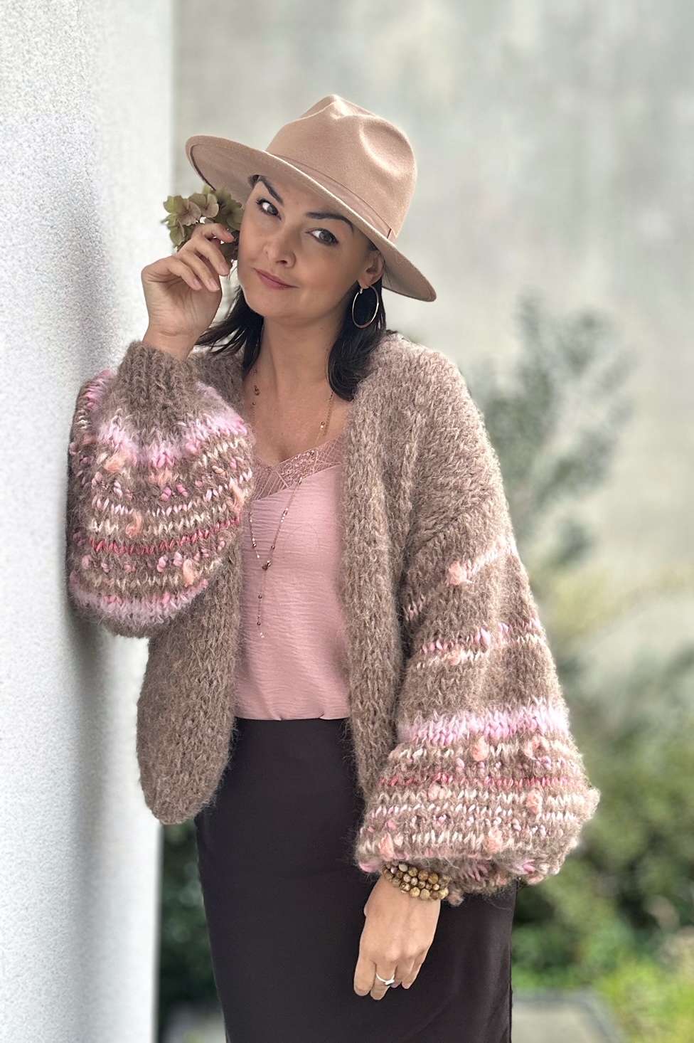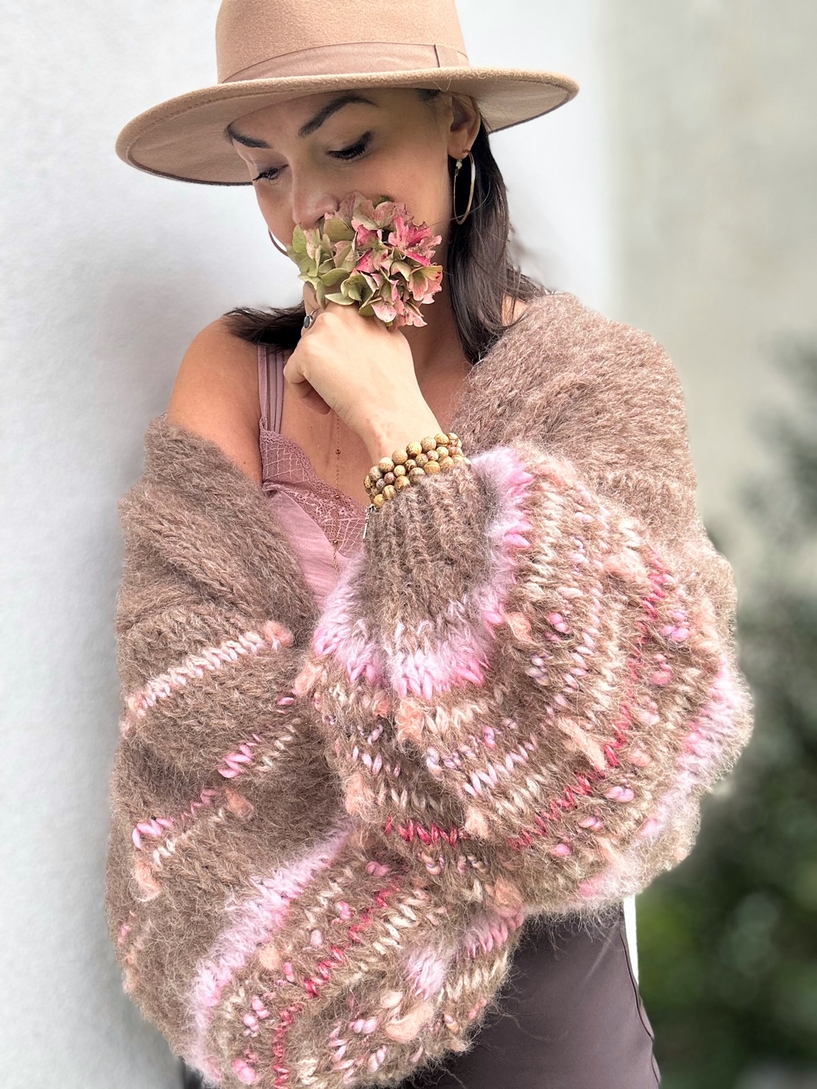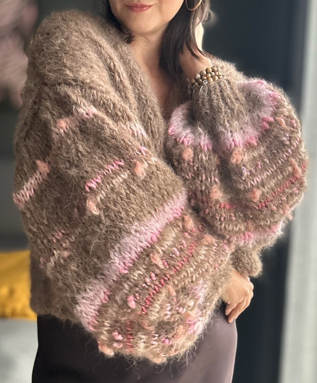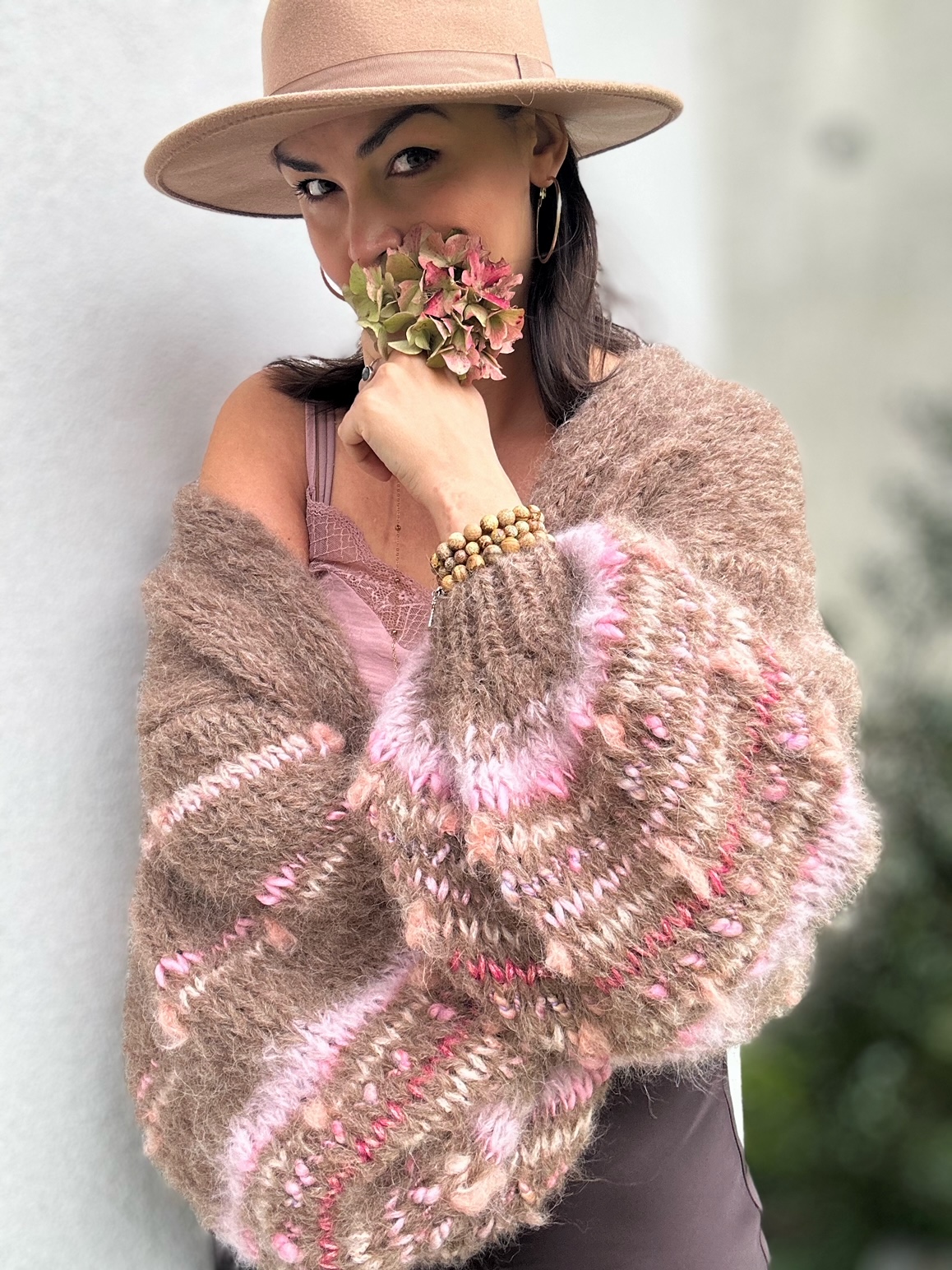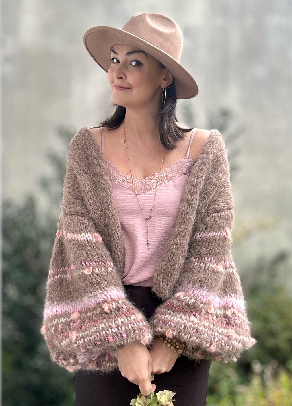 Jedyny, niepowtarzalny , całoroczny kardigan spleciony ręcznie na drutach z podwójnej nitki alpaki i wełny z dodatkiem fantazyjnej włóczki wplecionej w szerokie rękawy. Nie gryzie, jest bardzo miękki i puszysty. Idealny do jeansów, spódnic i letnich sukienek. Elegancki i kobiecy, a jednocześnie bardzo efektowny, ale nie krzykliwy. Uwaga: Jego kolor jest ciemniejszy, taki jak na zdjęciu w pomieszczeniu.