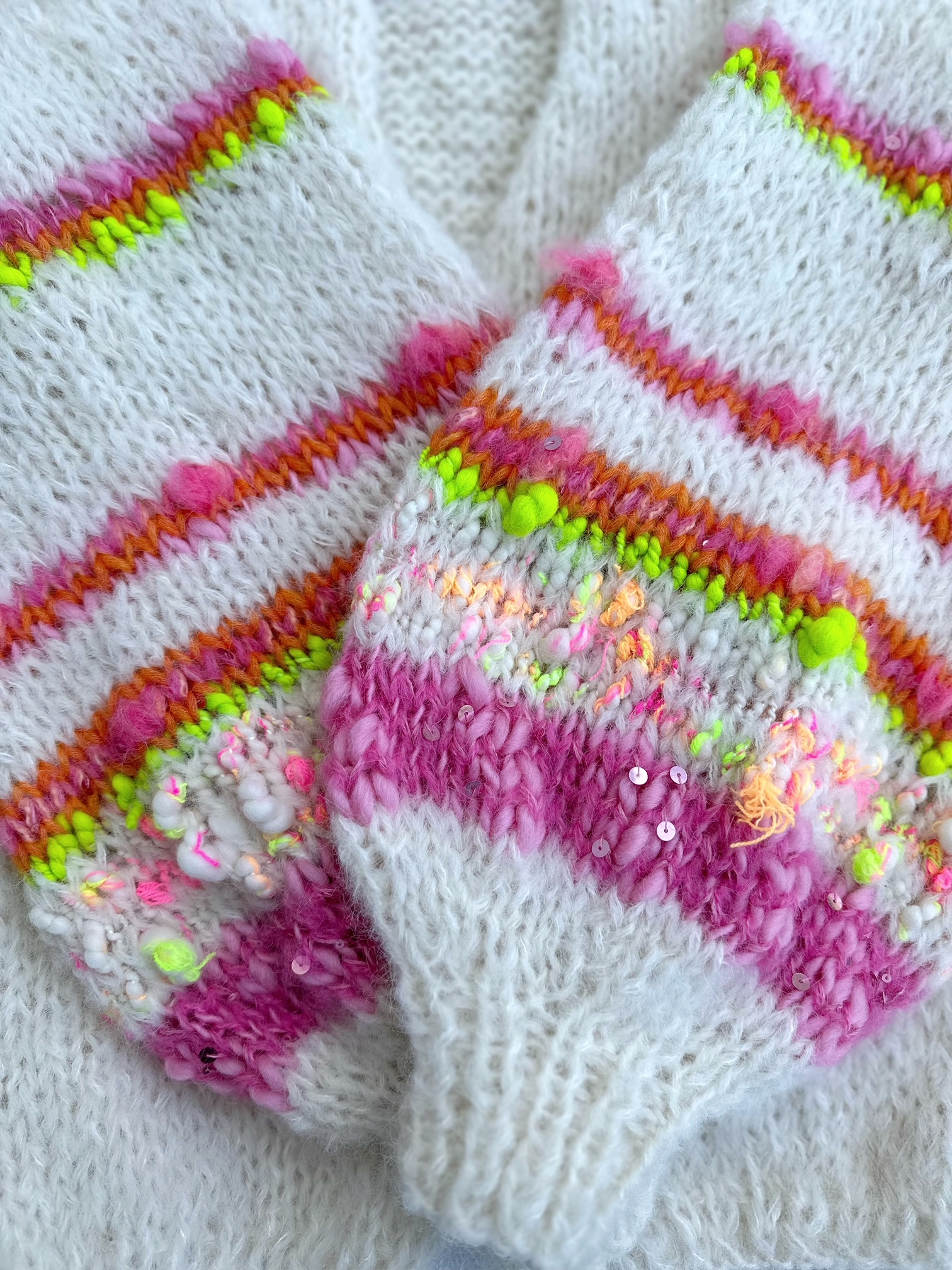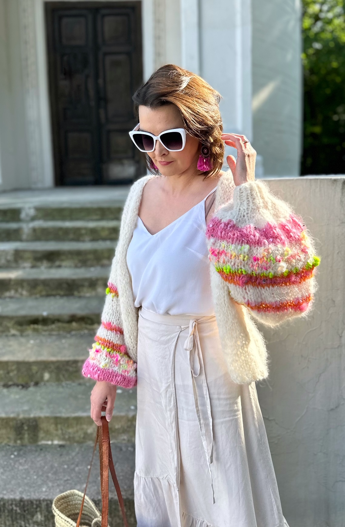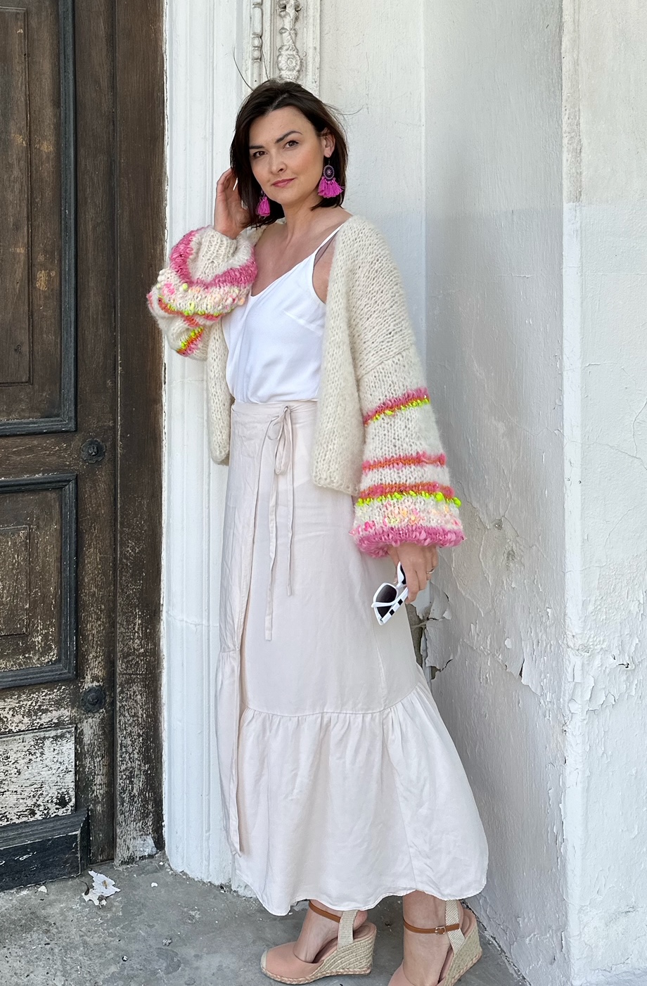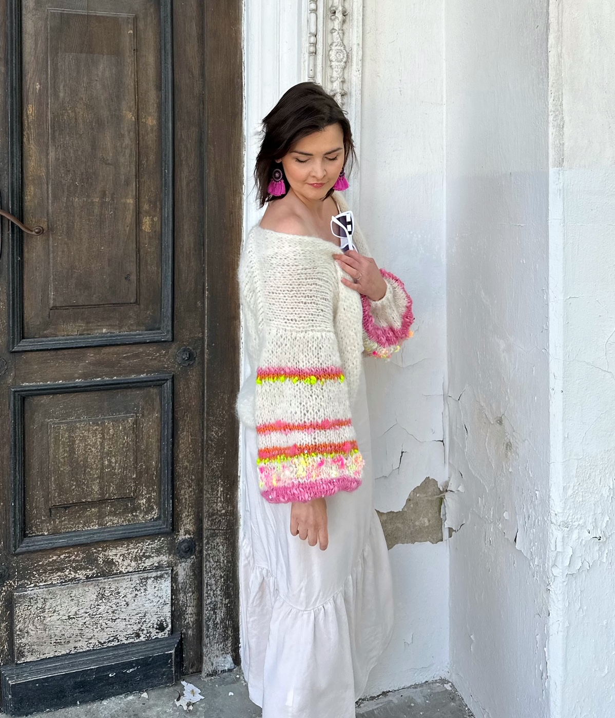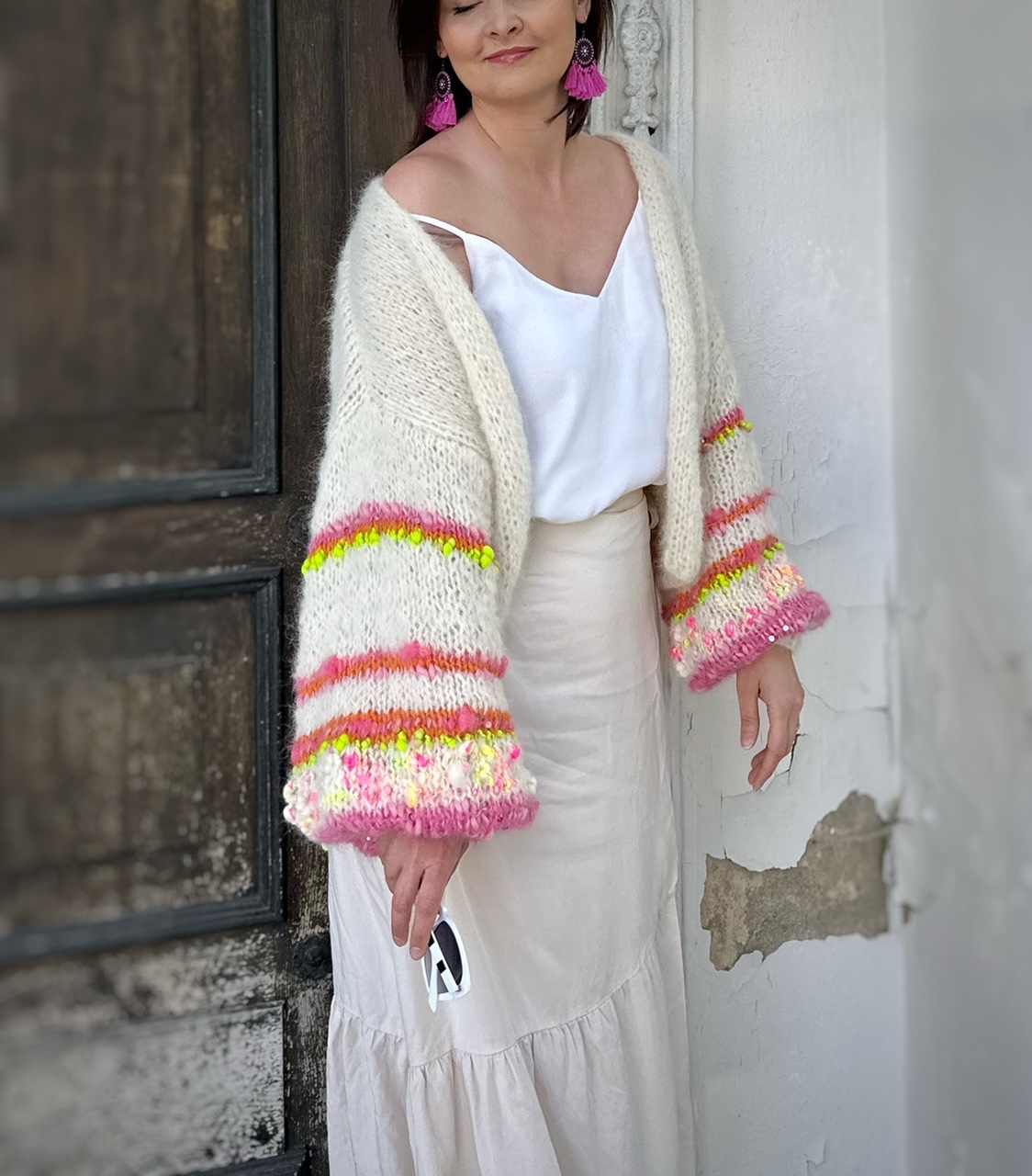 Kardigan Orange Flower z szerokimi rękawami, spleciony na drutach z dwóch niteczek: alpaki, merino i jedwabiu , z dodatkiem fantazyjnej włóczki na rękawach oraz włoczki z delikatnymi cekinami, które mienią się w słońcu. Modny, efektowny, naturalny. Kolorem bazowym jest złamana biel. Idealny do wielu stylizacji i do wielu kolorów bazowych Twojej stylizacji. Jest miękkie, lekki , przewiewny. Nie jest gruby, idealny na chłodne letnie wieczory, rześkie poranki, wietrzne plaże, spotkania i eleganckie przyjęcia.
