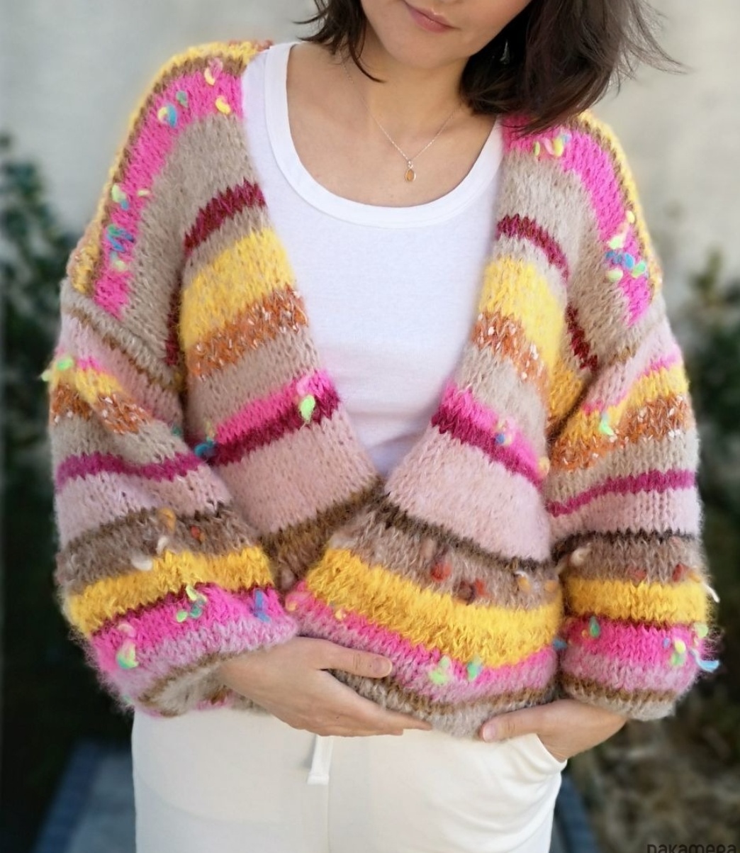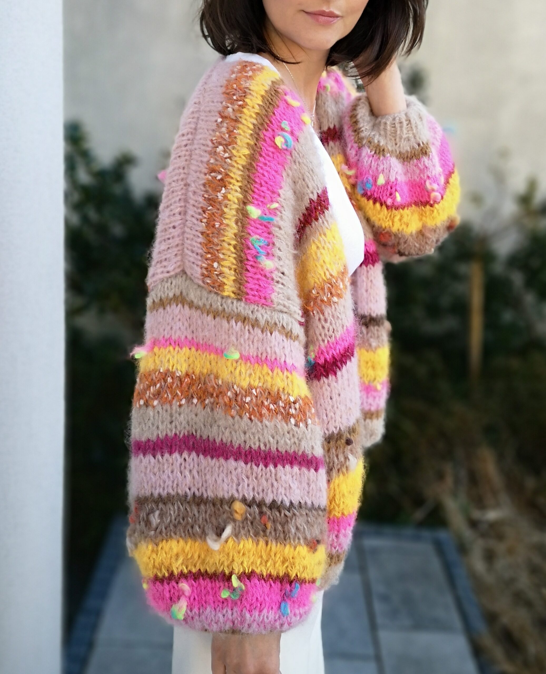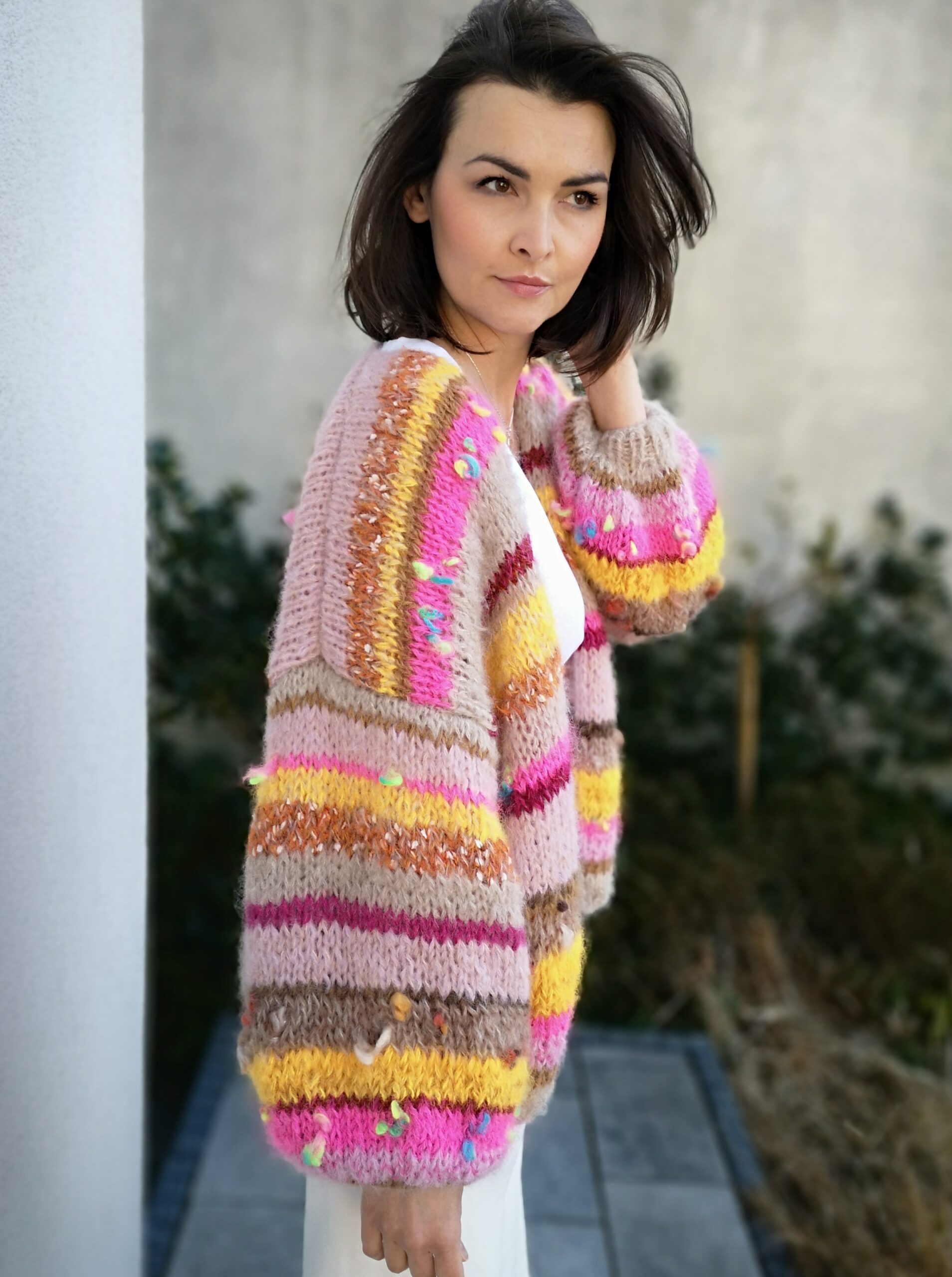 Wielobarwny, energetyczny, kobiecy. Spleciony ręcznie na drutach z włóczkek :alpaki, merino, jedwabiu, moheru i wlóczek fantazyjnych.