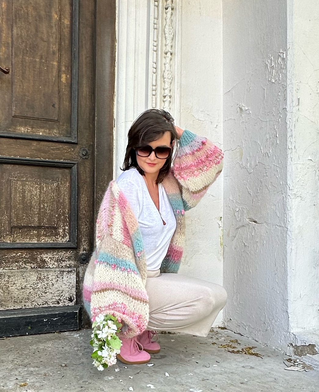 Kardigan Perla spleciony ręcznie na drutach z mieszanki włóczek alpaki, merino, jedwabiu urozmaicony przepiękną włóczką fantazyjną.