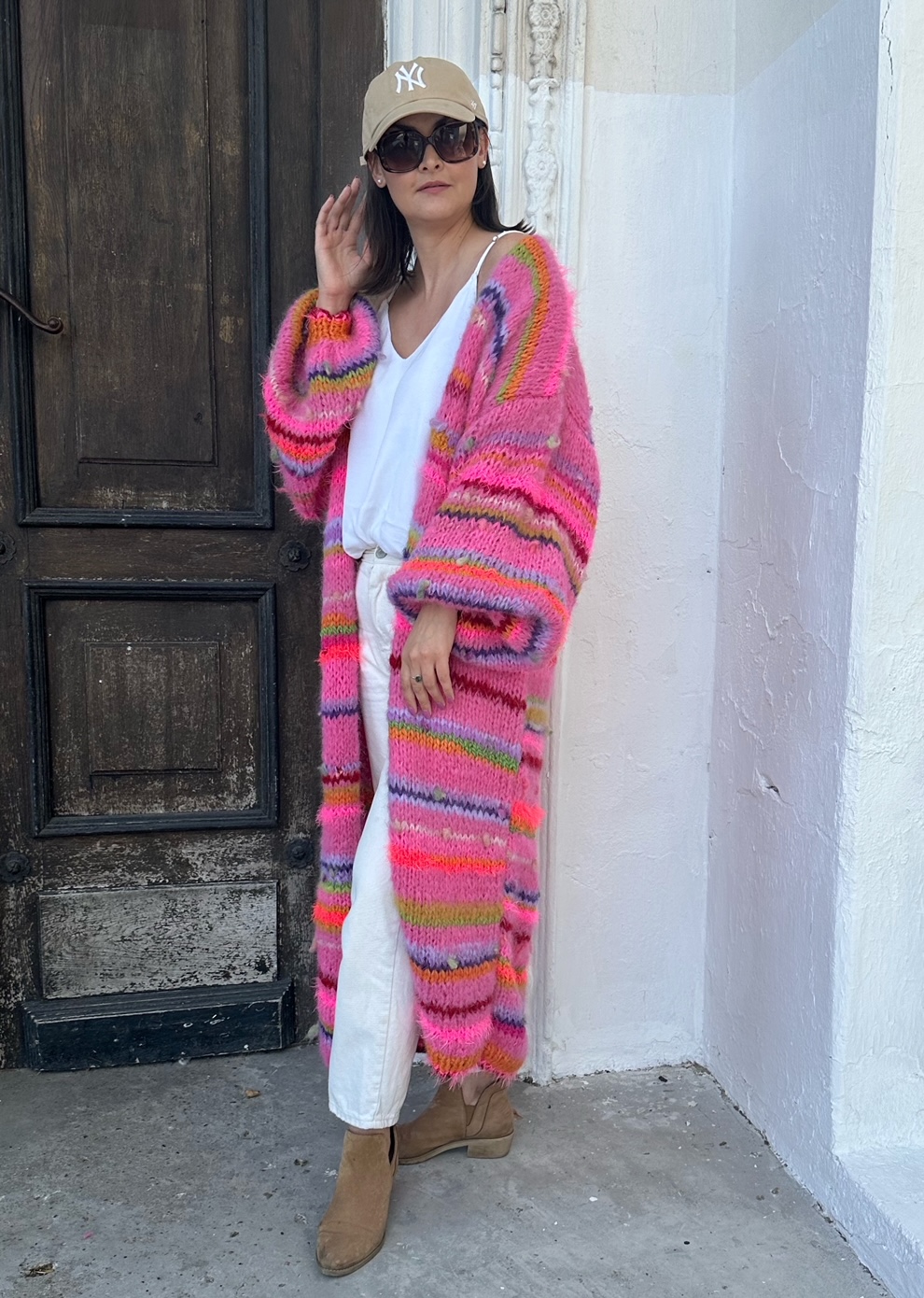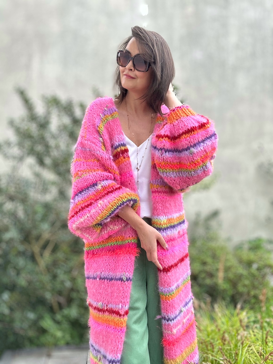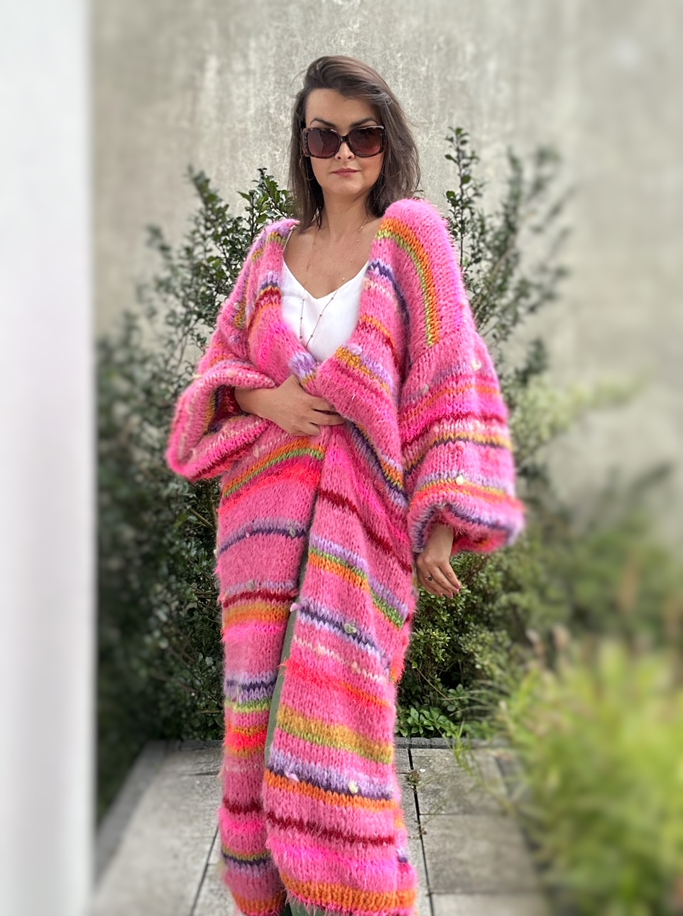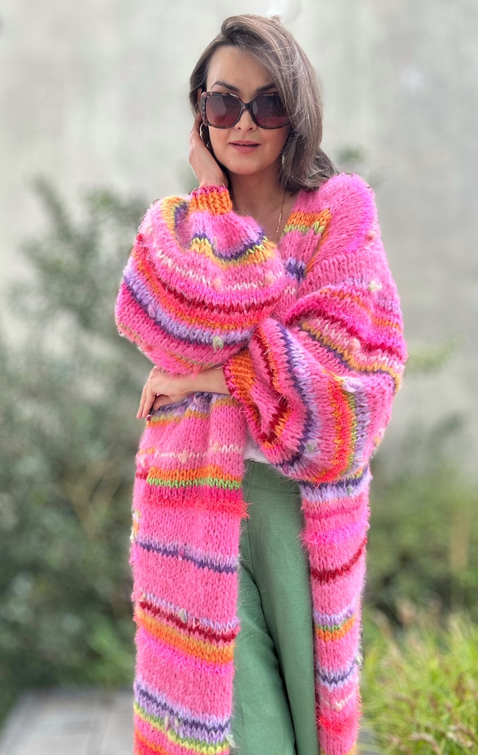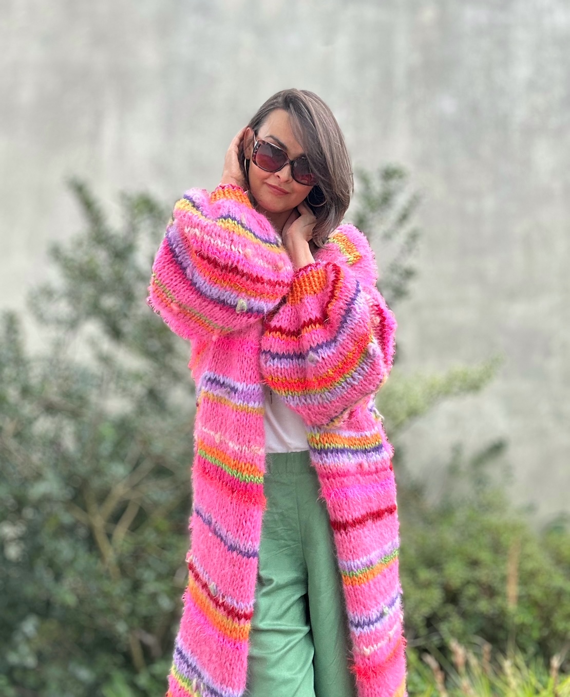 Kardigan Pink Butterfly to energetyczne połączenie włóczek: alpaki, merino, jedwabiu , moheru z minimalną domieszką akrylu. Fantazyjne włóczki z kolorowymi nopkami dodają mu charakteru i oryginalności.Kardigan jest niezwykle kolorowy (w przewagą intensywnego różu), puszysty i cudownie miękki. To całoroczny model , dla kobiet które lubią naturalne materiały, wygodę i uwielbiają być zauważone. Kolor kardiganu może odrobinę różnić się , w zależności od ustawień monitora. To intensywny róż ( aczkolwiek nie test to neonowy róż, na co mogą wskazywać niektóre zdjęcia).