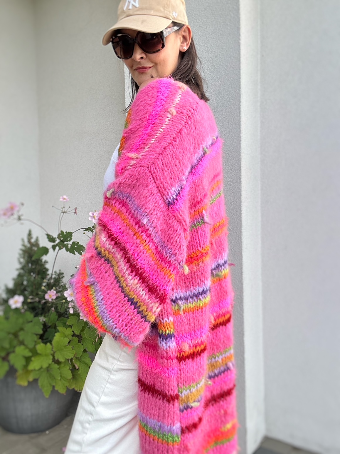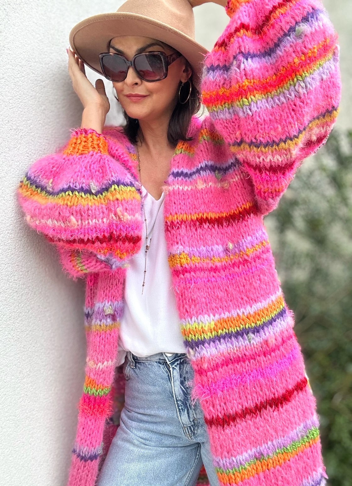 Uwaga. Kolor bazowy róż to kilka połączonych odcieni. Niektóre z nich mogą zostać wymienione na inne, co nie wpłynie znacząco na wygląd kardiganu. Inne elementy czyli np. włóczki fantazyjne bez zmian i paski.