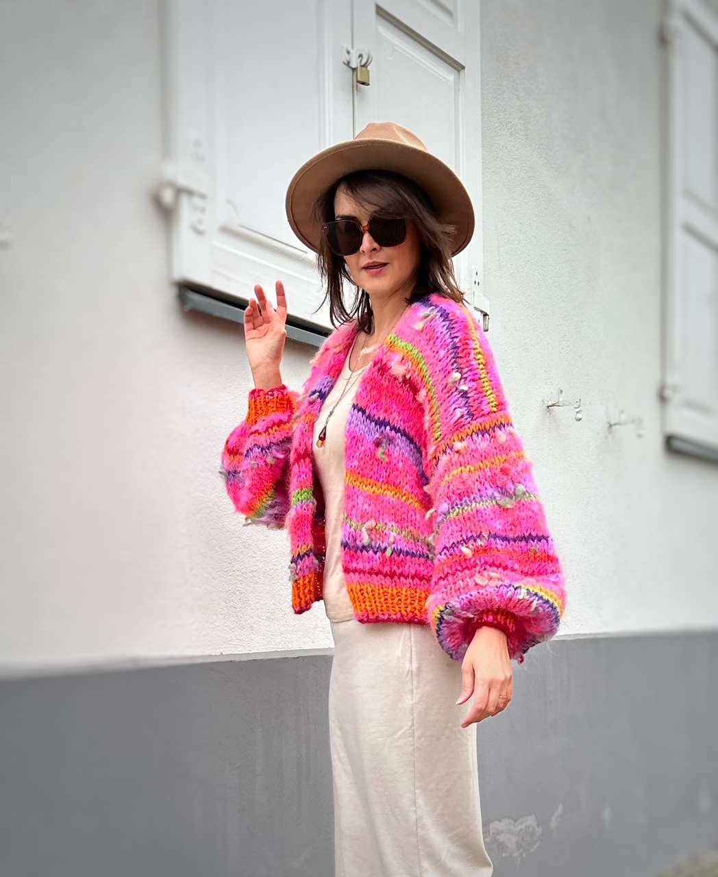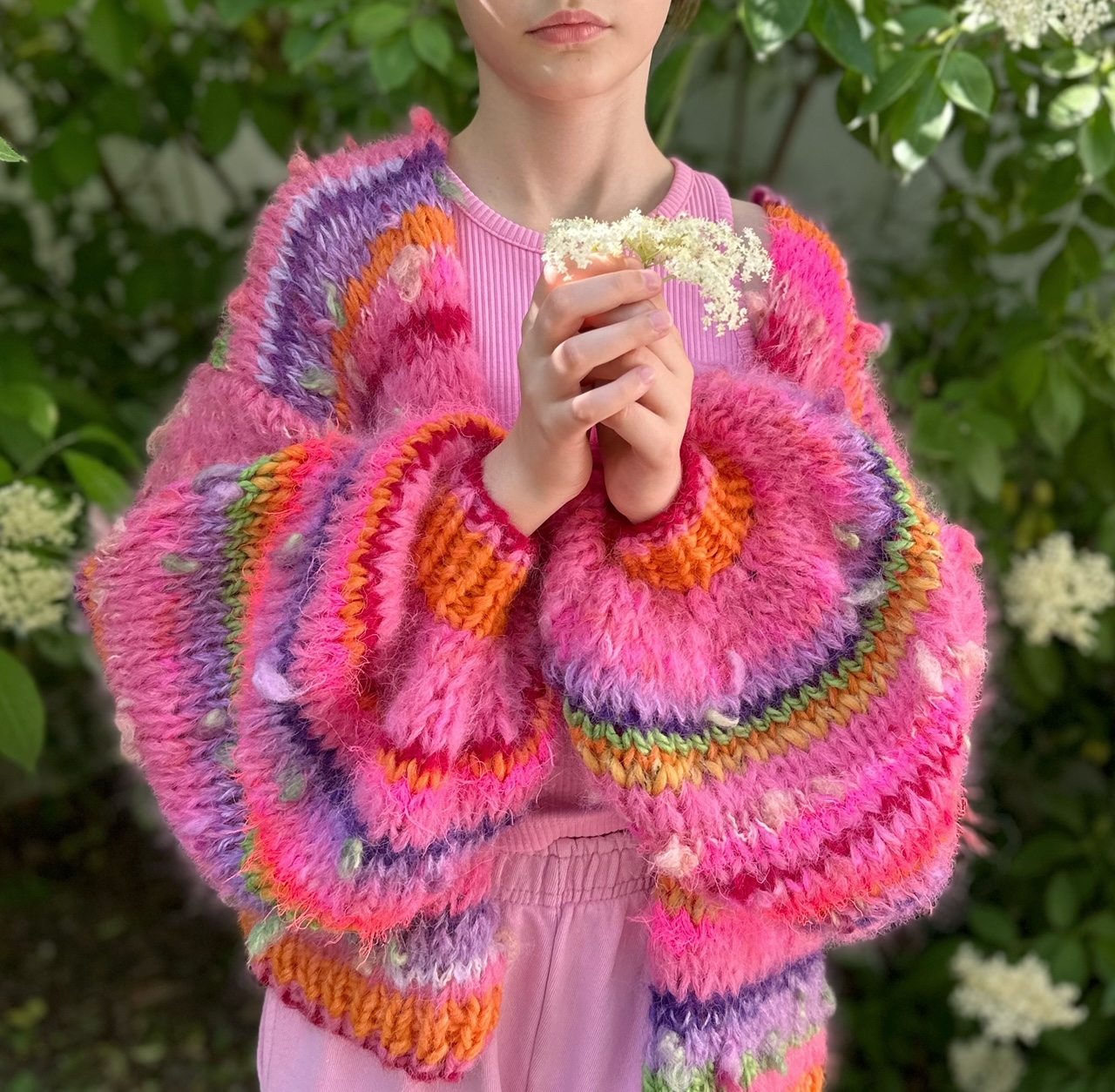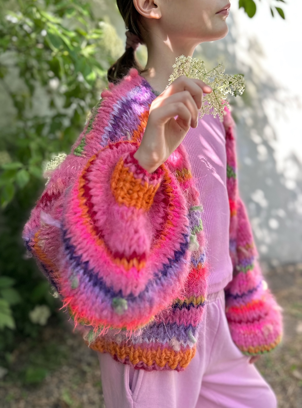 Kardigan Pink Butterfly to energetyczne połączenie włóczek: alpaki, merino, jedwabiu , moheru z minimalną domieszką akrylu. Fantazyjne włóczki z kolorowymi nopkami dodają mu charakteru i oryginalności.Kardigan jest niezwykle kolorowy (w przewagą intensywnego różu), puszysty i cudownie  miękki. To całoroczny model , dla kobiet które lubią naturalne materiały, wygodę i uwielbiają być zauważone. Kolor kardiganu może odrobinę różnić się , w zależności od ustawień monitora. To intensywny róż ( aczkolwiek nie test to neonowy róż, na co mogą wskazywać niektóre zdjęcia).