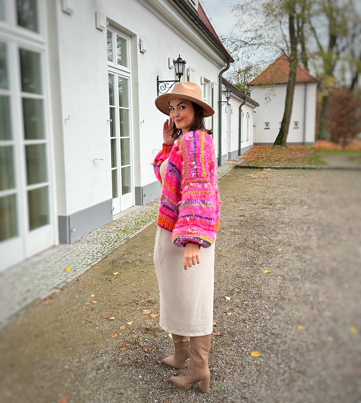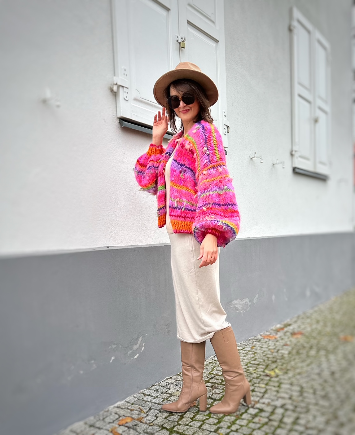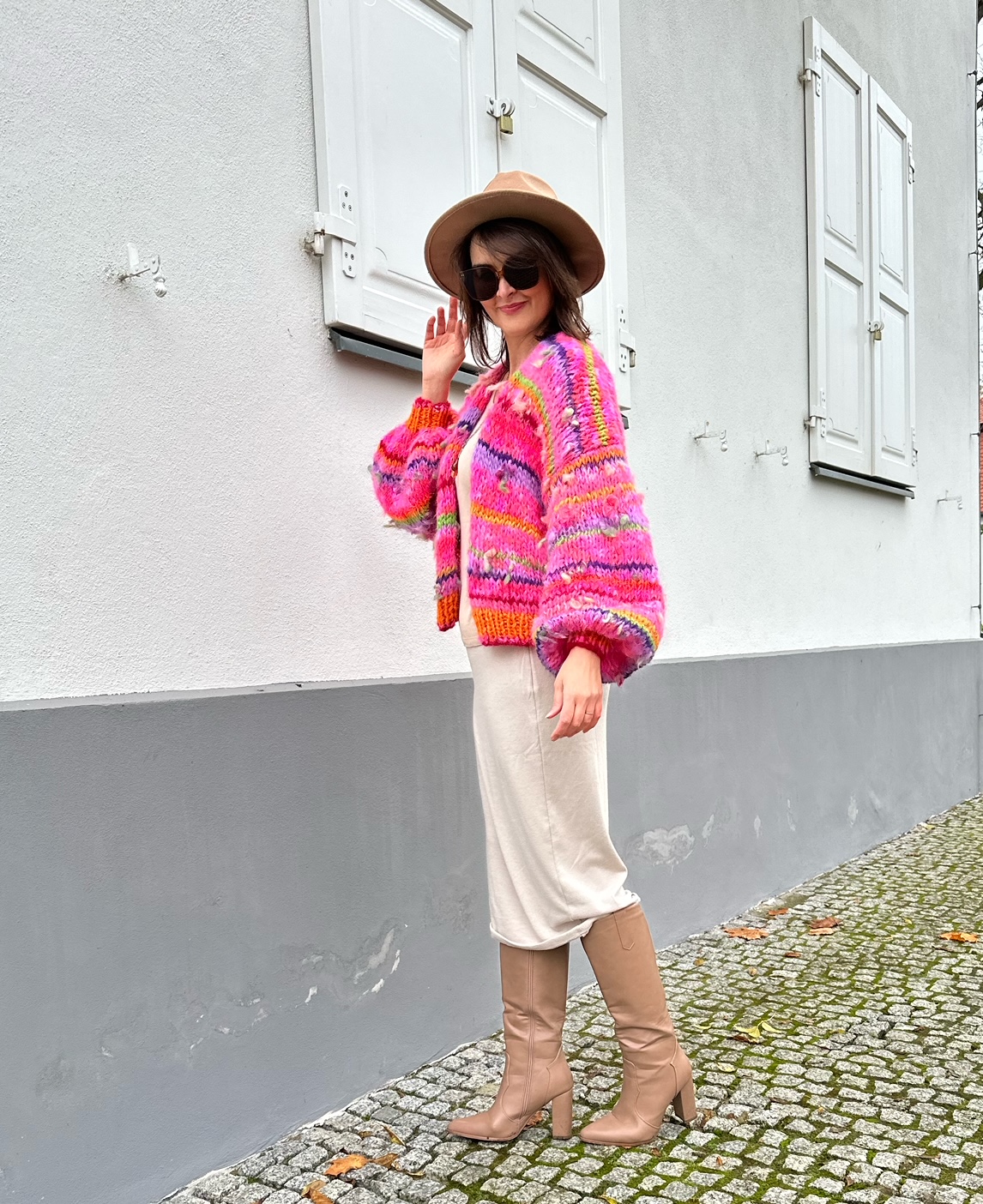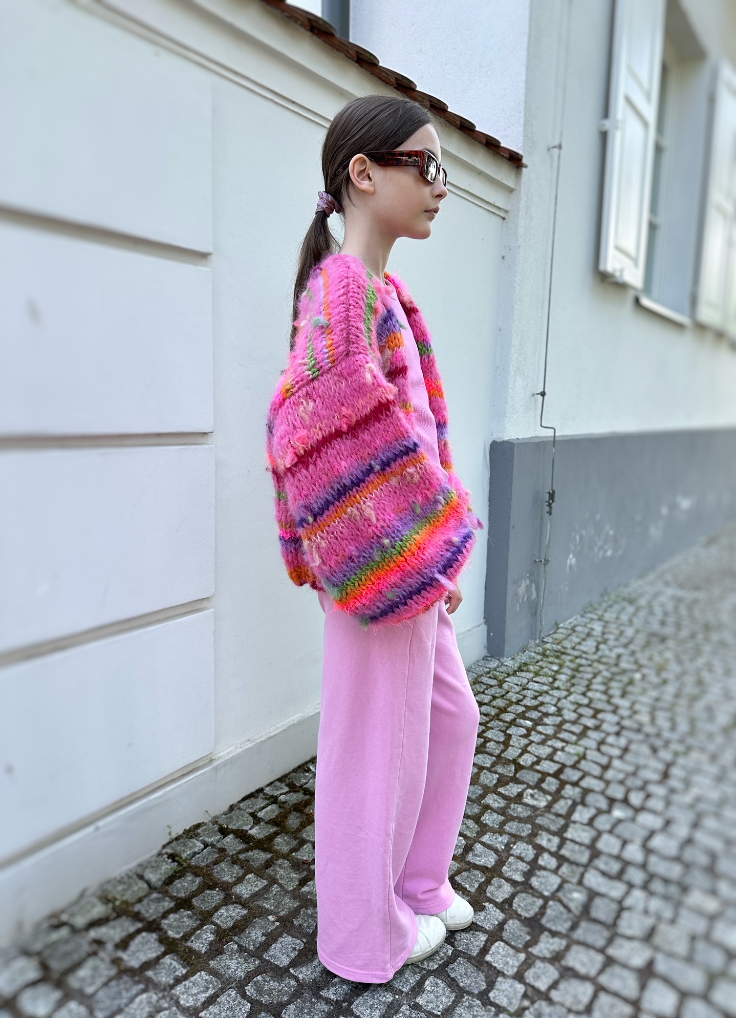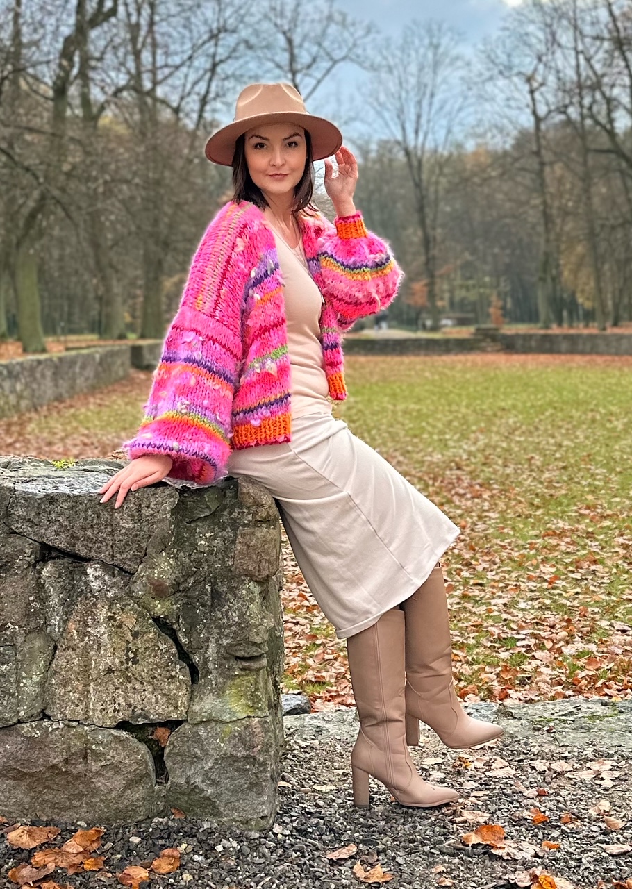 Uwaga. Kolor bazowy róż to kilka połączonych odcieni. Niektóre z nich mogą zostać wymienione na inne, co nie wpłynie znacząco na wygląd kardiganu. Inne elementy czyli np. włóczki fantazyjne bez zmian i paski.