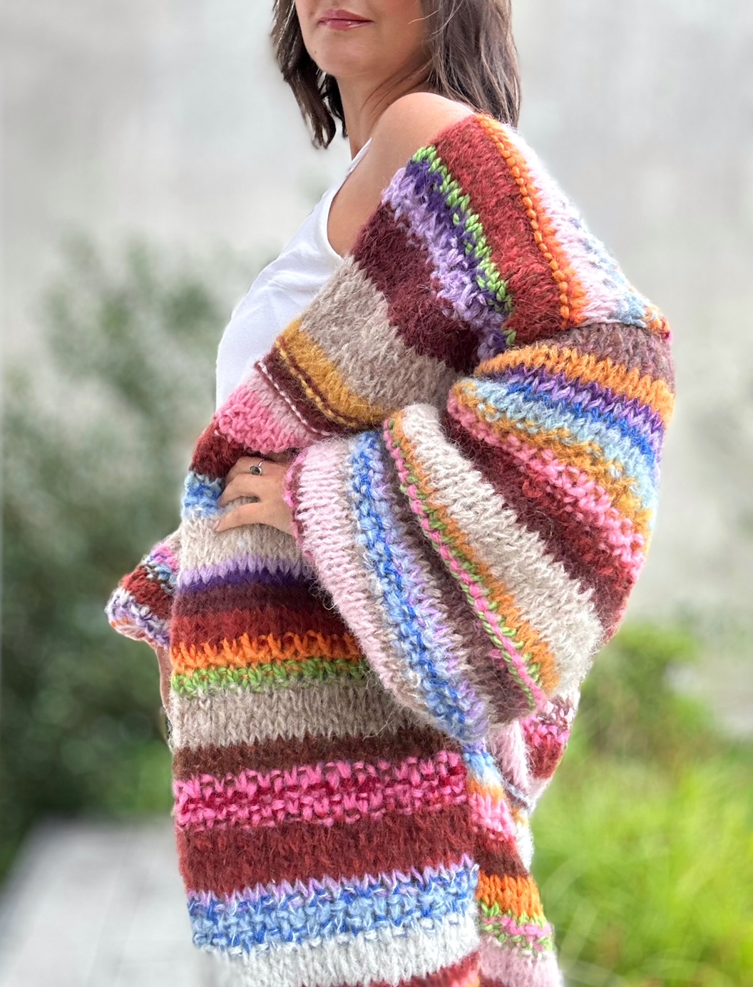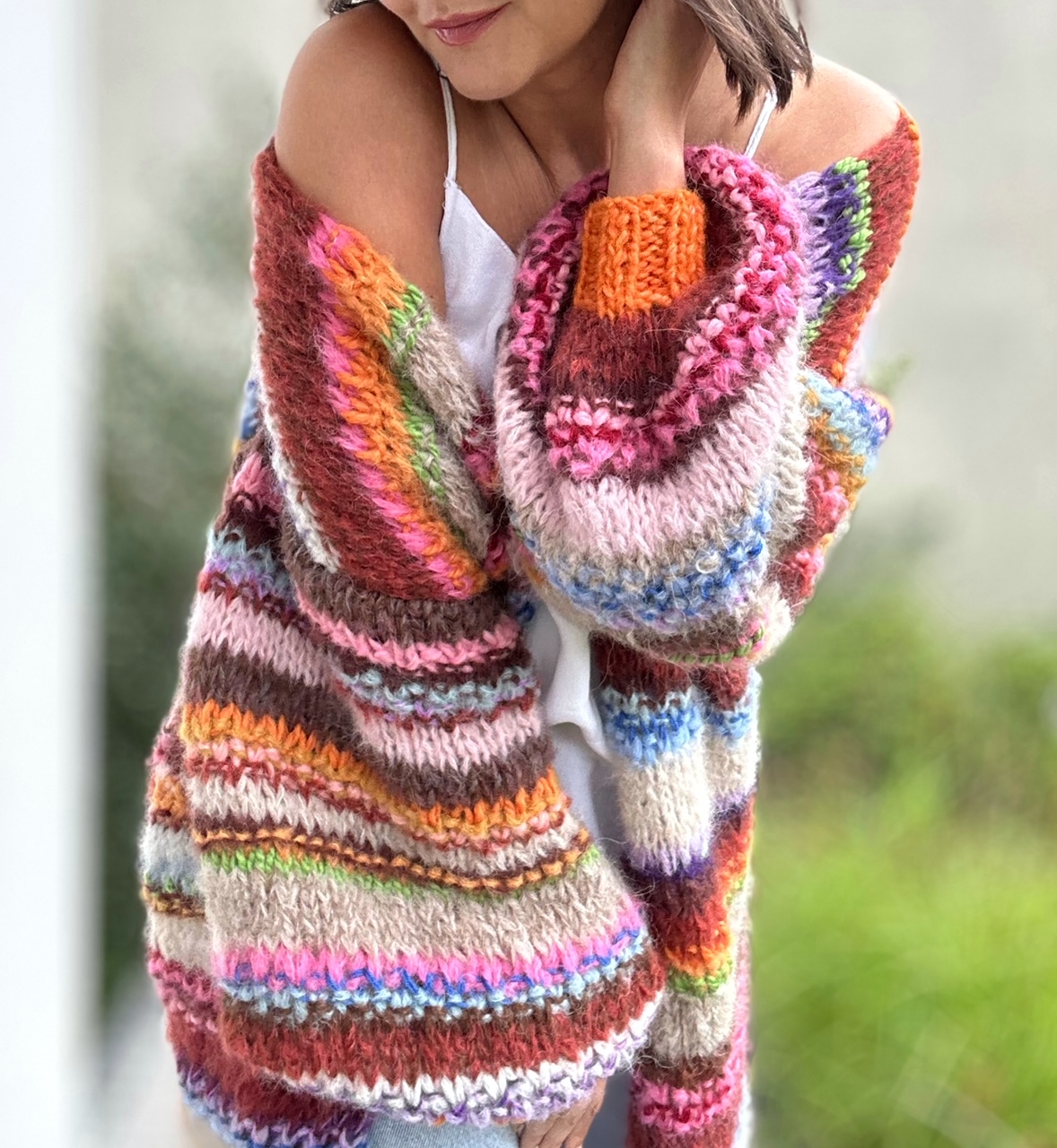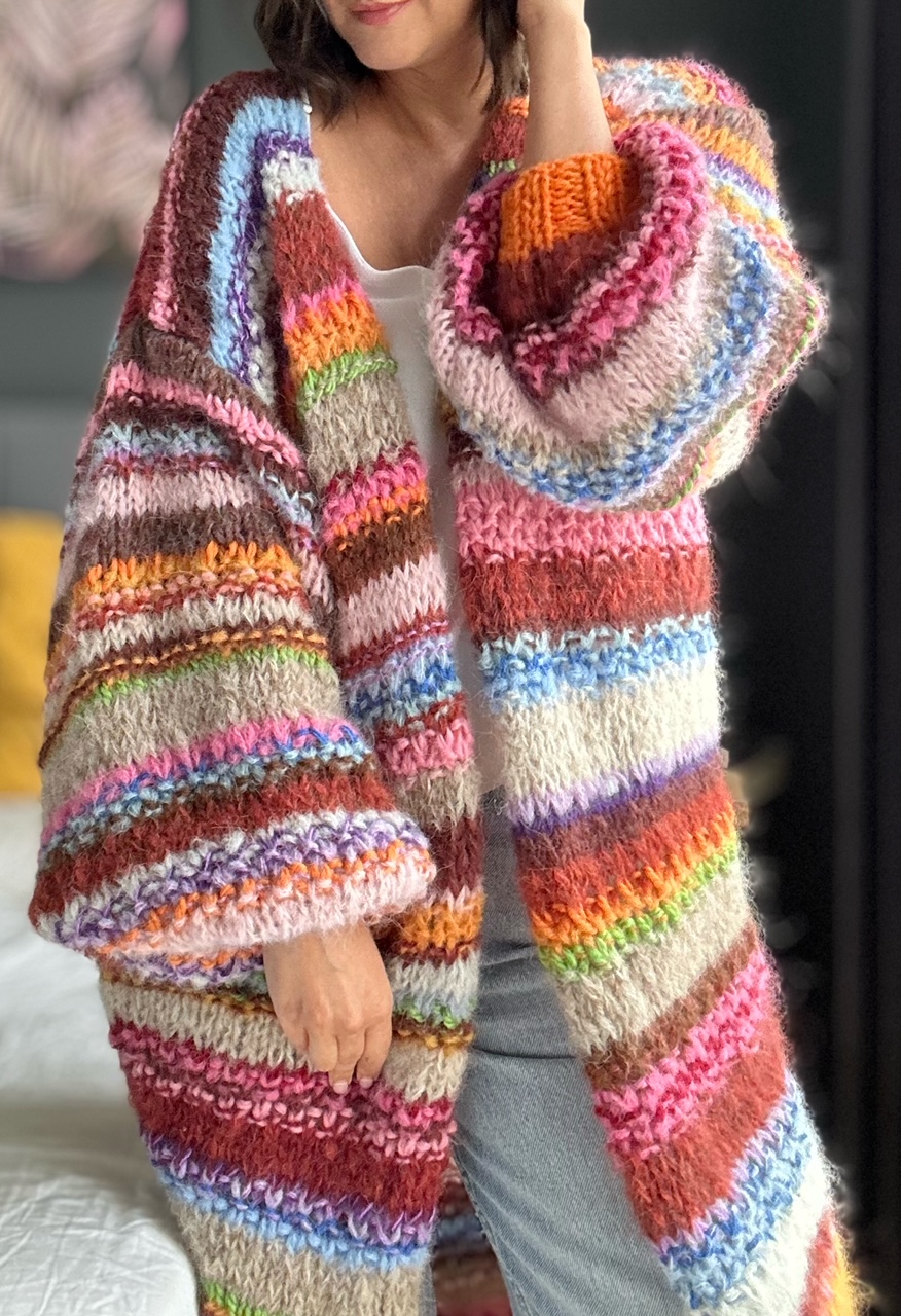 SHE is nature to kolejny kardigan z kolekcji SHE. Ta kolekcja to naturalne włóczki (alpaka, merino, jedwab , moher z niewielką domieszką akrylu),piękne kolory i ich niebanalne połączenia, szerokie rękawy, strukturalny splot. Dla Ciebie, byś czuła się kobieco i komfortowo, byś przyciągała spojrzenia.