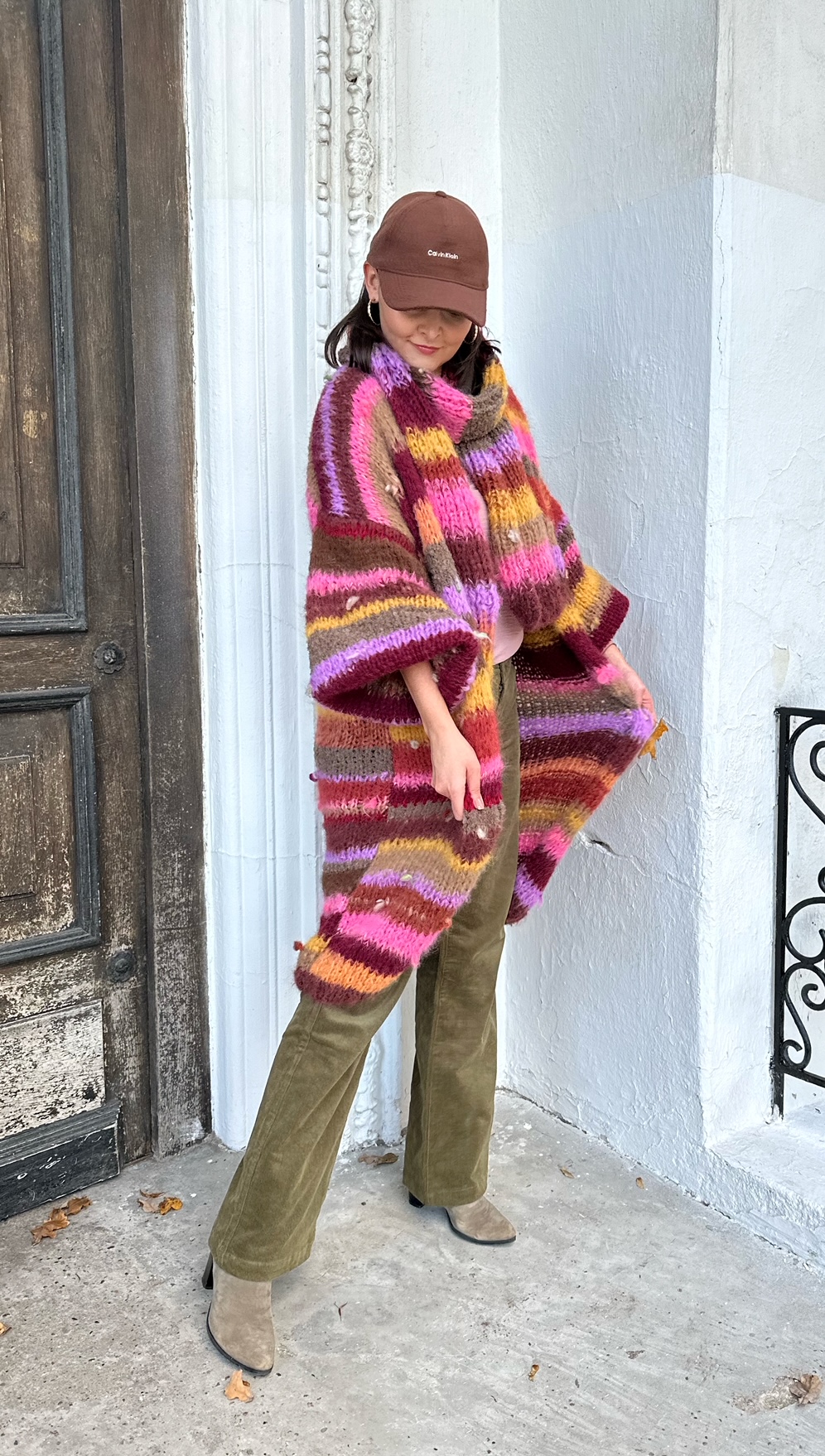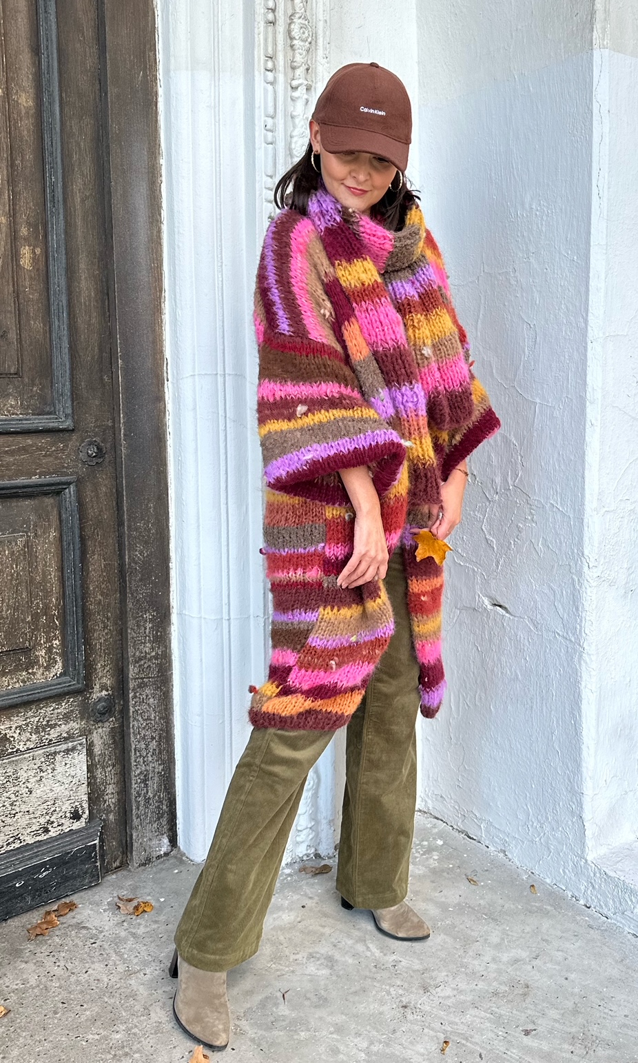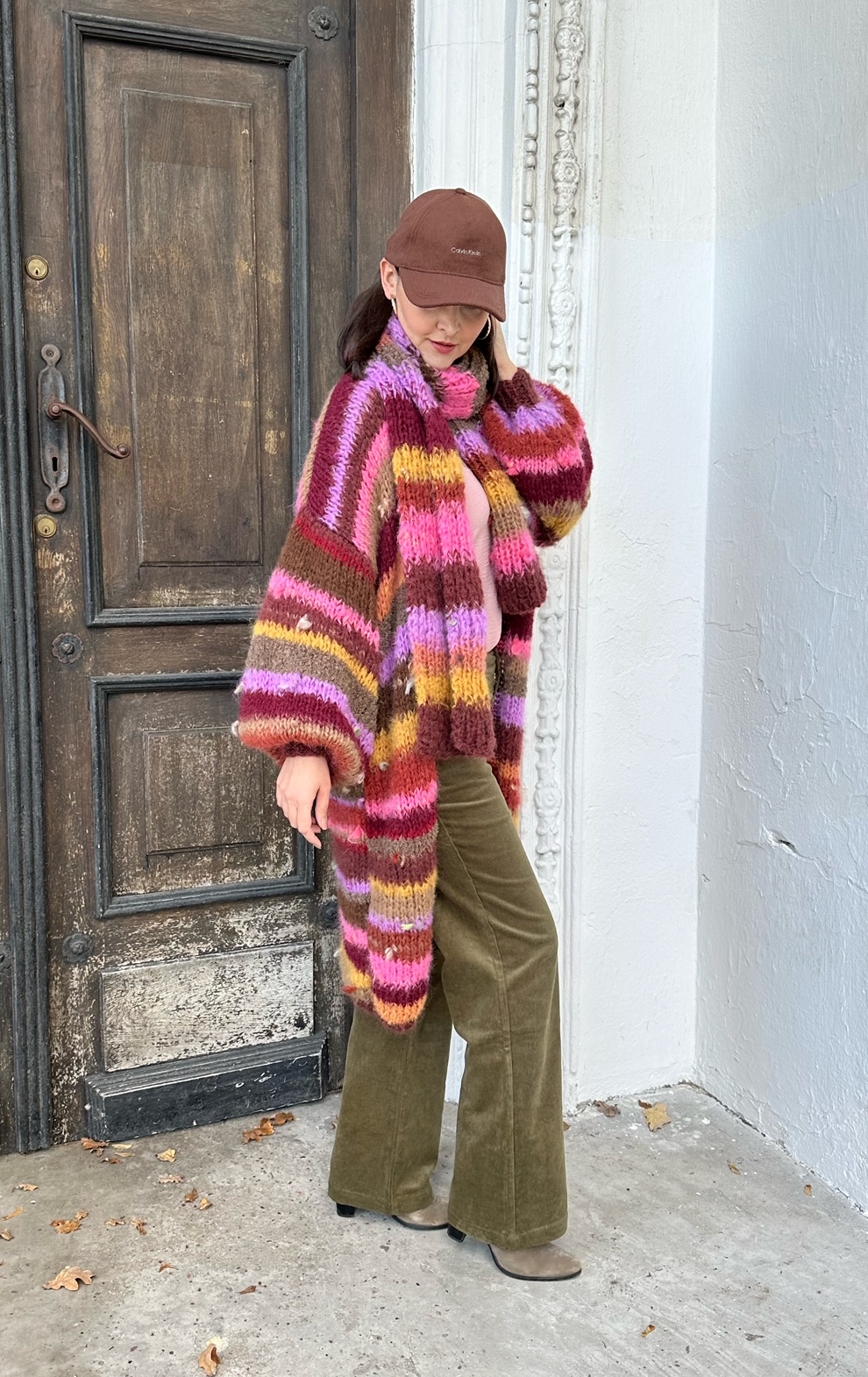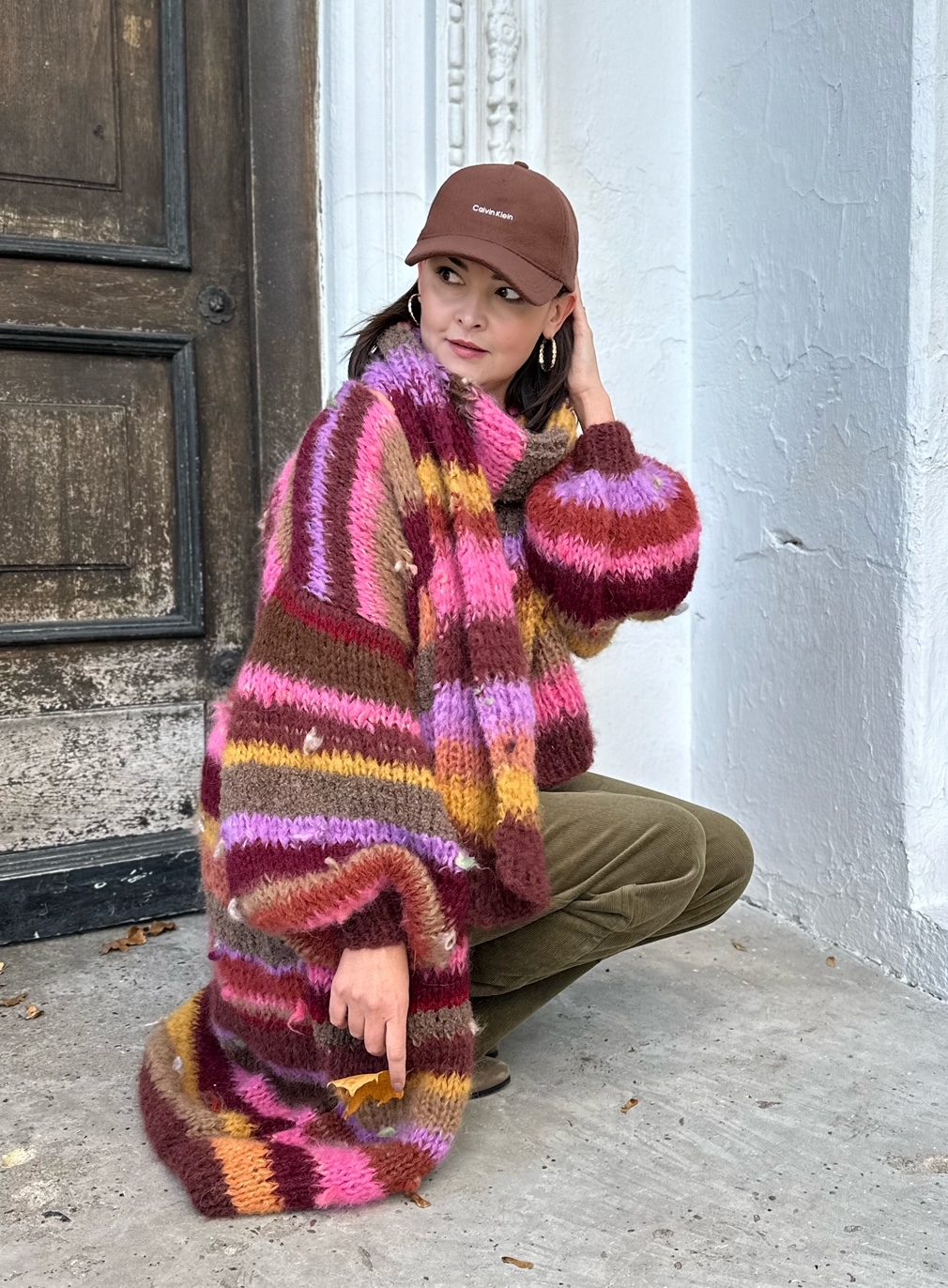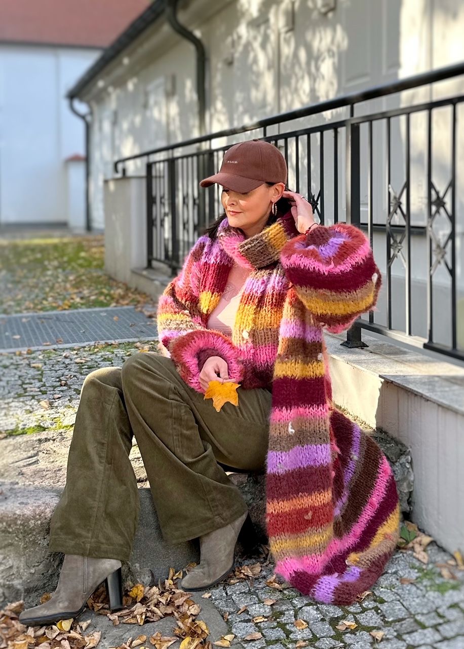Kardian Silvia to dłuższy model spleciony ręcznie na drutach z naturalnych włóczek takich jak : alpaka, merino, jedwab moher (z niewielką ilością akrylu) z dodatkiem włóczek fantazyjnych, w pięknych odcieniach soczystych burgungów, brązów i miodowych odcieni . Kardi ma szerokie , modne rękawy.Pasuje do wielu stylizacji.
