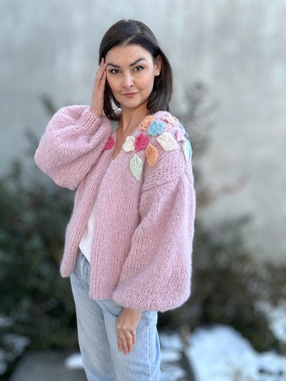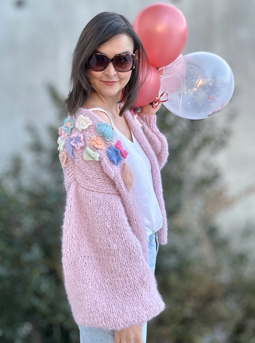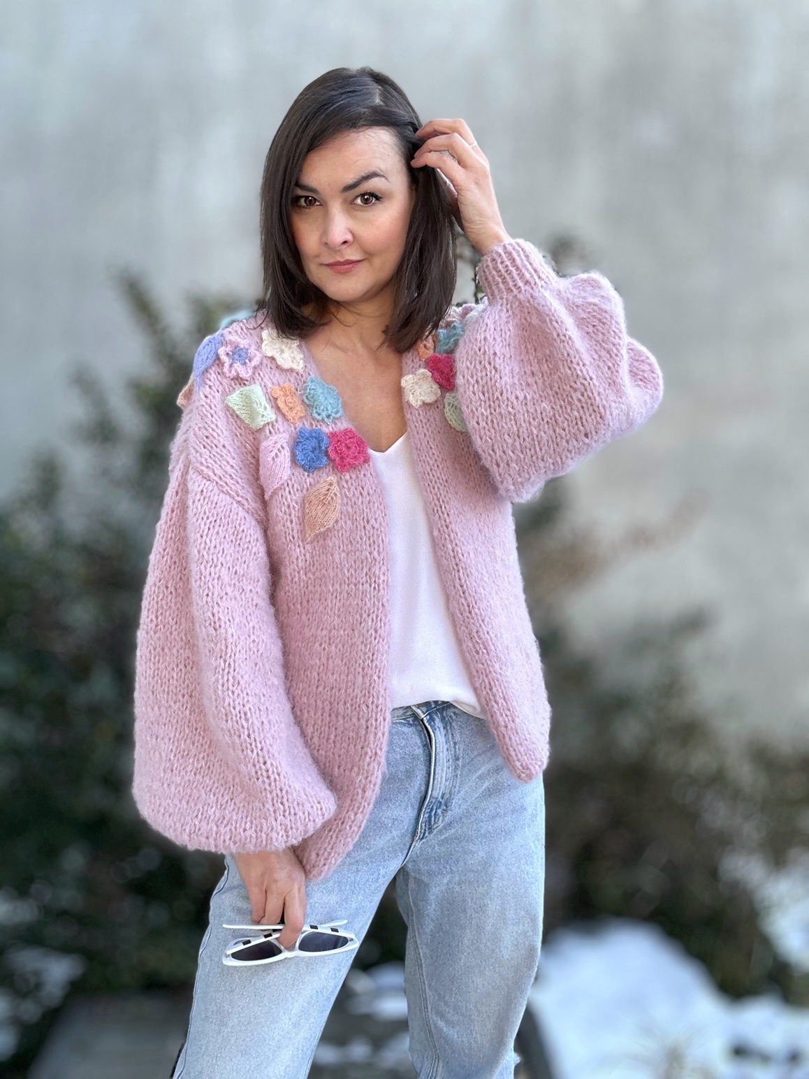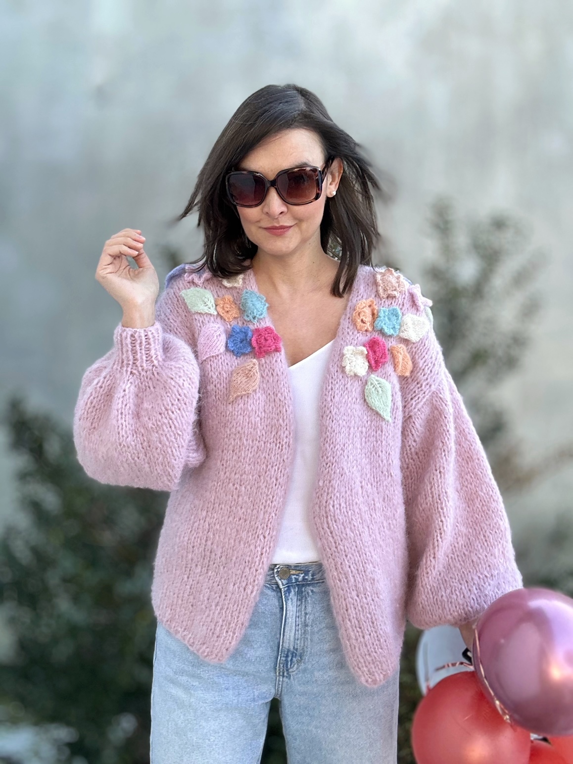 Kardigan Spring Love spleciony ręcznie na drutach z naturalnych włóczek (pierwsza to 77% Alpaka, 23% Jedwab, druga to:71% Alpaka, 25% Wełna, 4% Poliamid)Kobiecy i efektowny, ale nie krzykliwy. Uroku dodają mu kolorowe kwiatki wykonane na szydełku Kardigan jest miękki , puszysty i efektowny. Pasuje do wielu stylizacji.