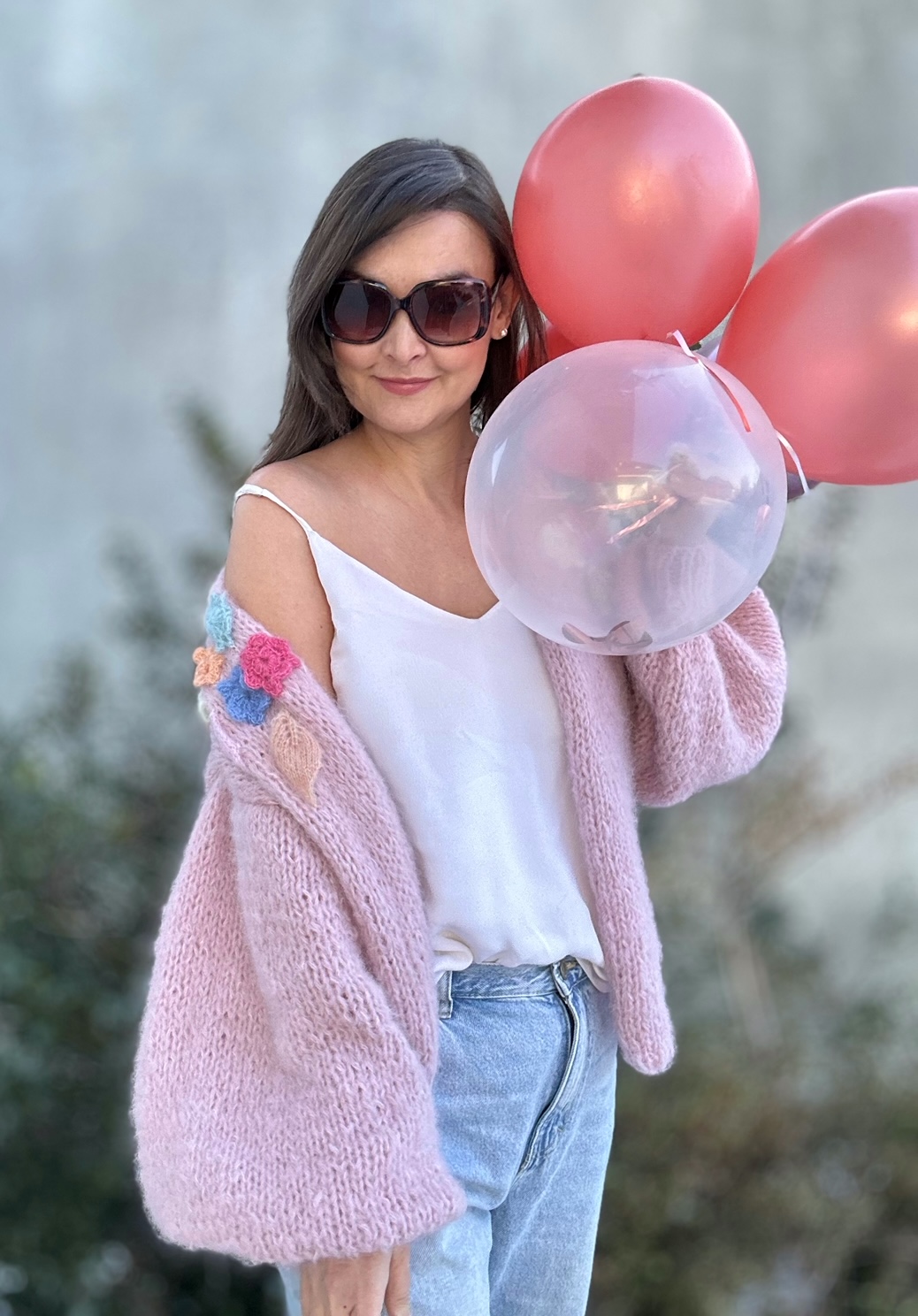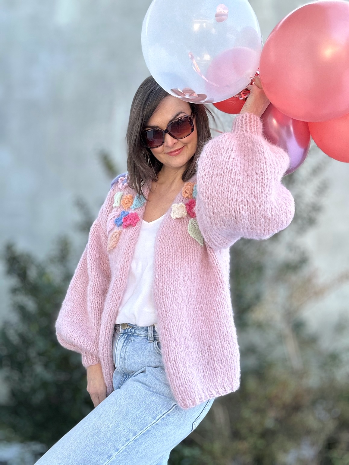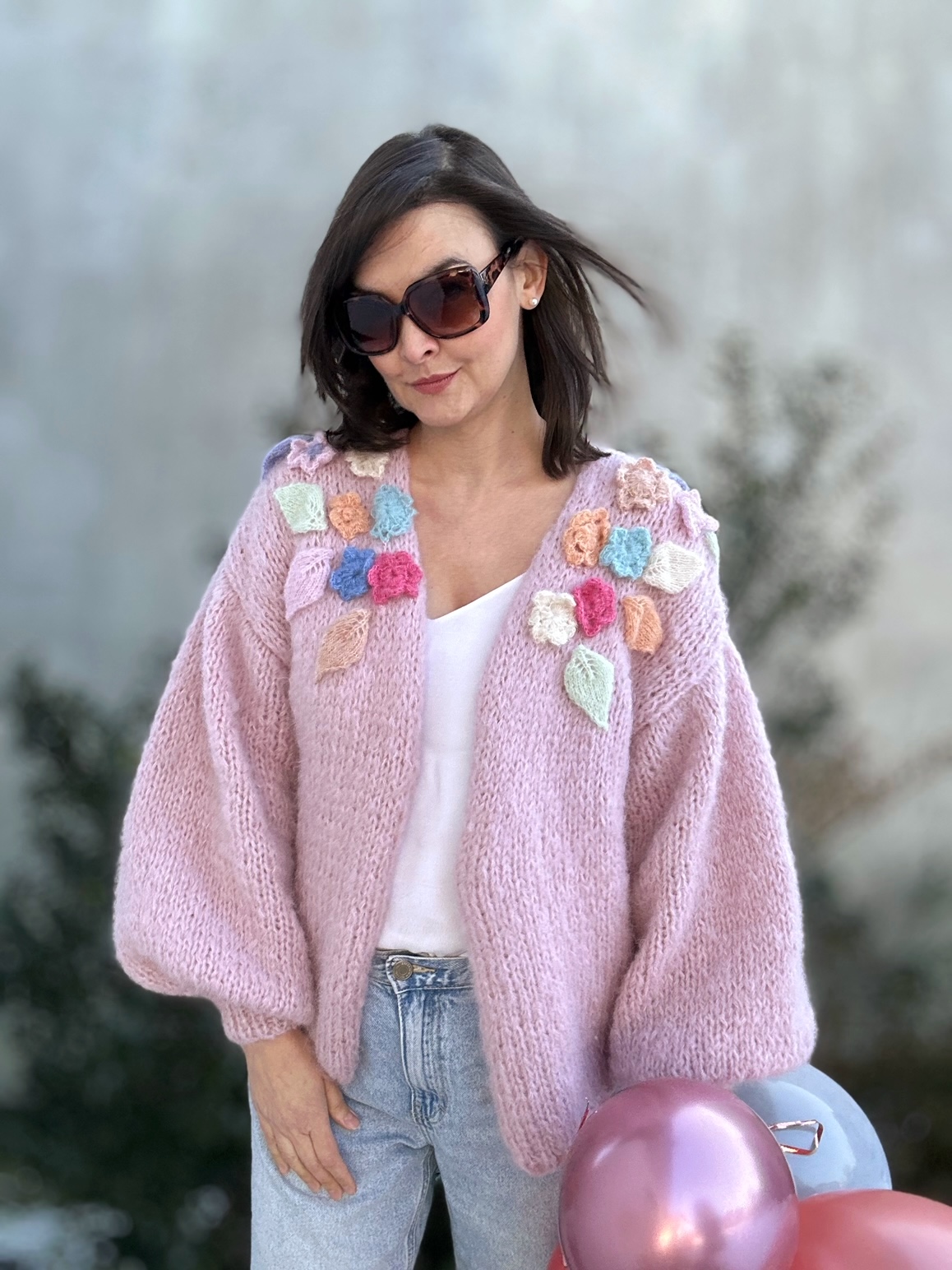 Kardigan Spring Love spleciony ręcznie na drutach z naturalnych włóczek (pierwsza to 77% Alpaka, 23% Jedwab, druga to:71% Alpaka, 25% Wełna, 4% Poliamid)Kobiecy i efektowny, ale nie krzykliwy. Uroku dodają mu kolorowe kwiatki wykonane na szydełku Kardigan jest miękki , puszysty i efektowny. Pasuje do wielu stylizacji.