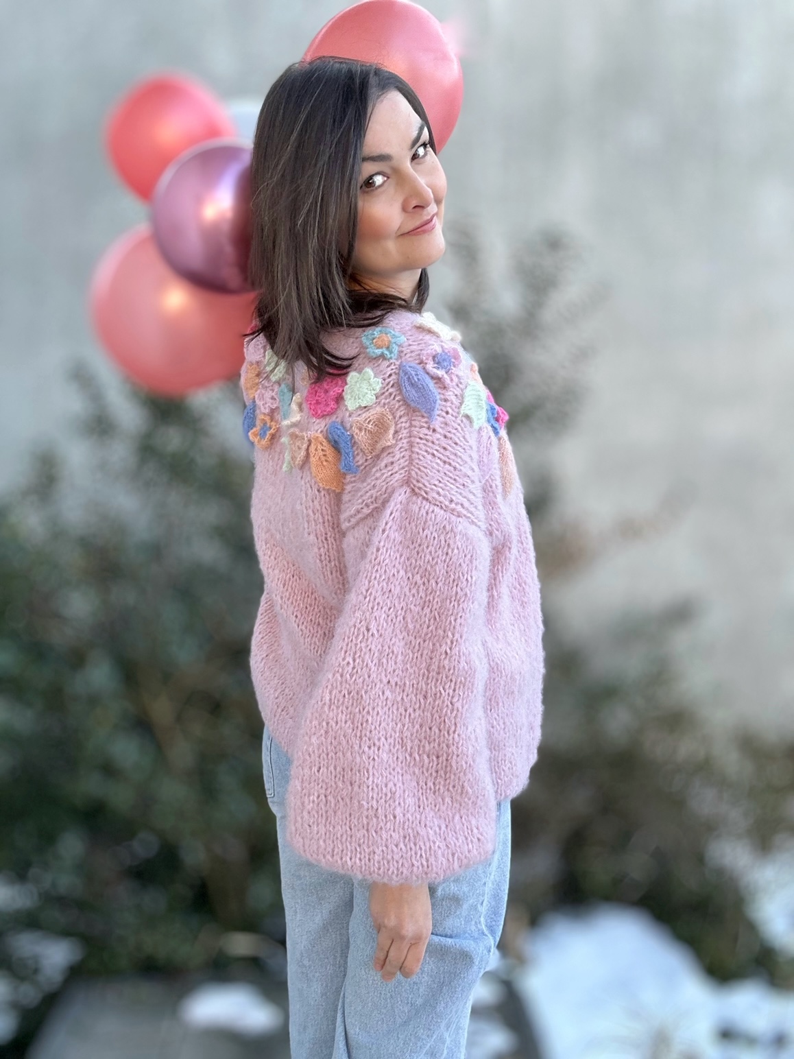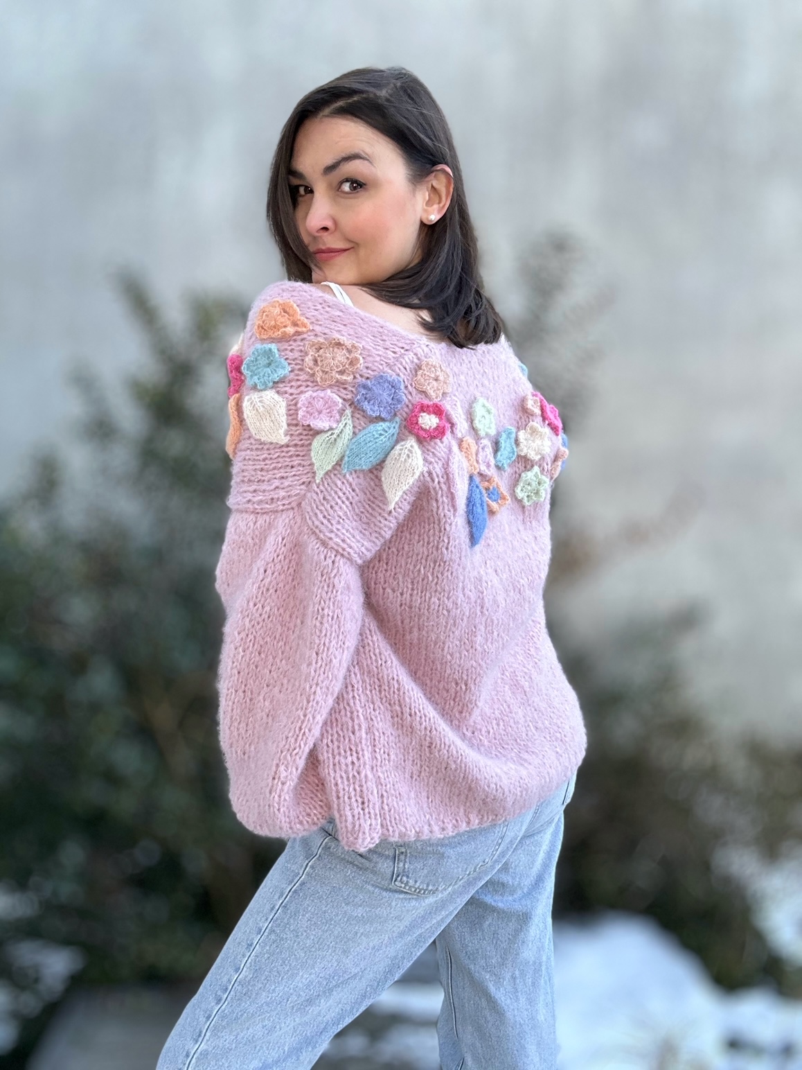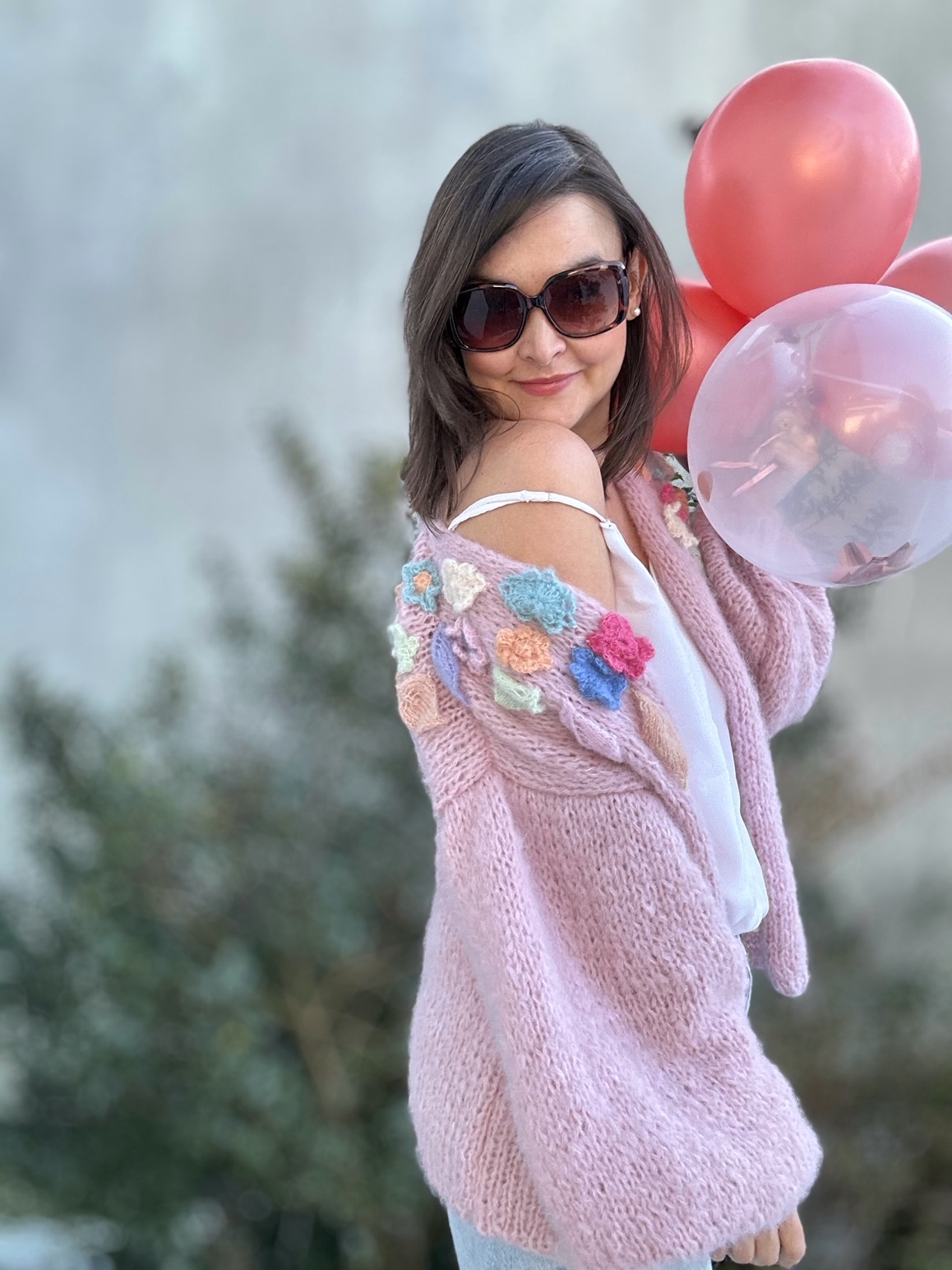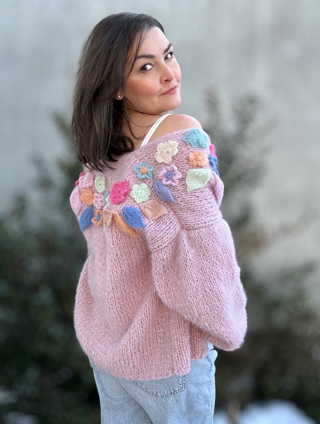 Kardigan Spring Love spleciony ręcznie na drutach z naturalnych włóczek (pierwsza to 77% Alpaka, 23% Jedwab, druga to:71% Alpaka, 25% Wełna, 4% Poliamid)Kobiecy i efektowny, ale nie krzykliwy. Uroku dodają mu kolorowe kwiatki wykonane na szydełku Kardigan jest miękki , puszysty i efektowny. Pasuje do wielu stylizacji.