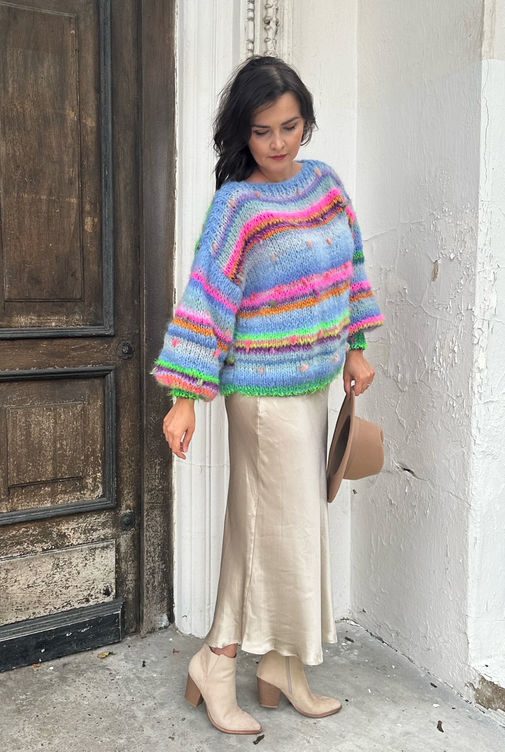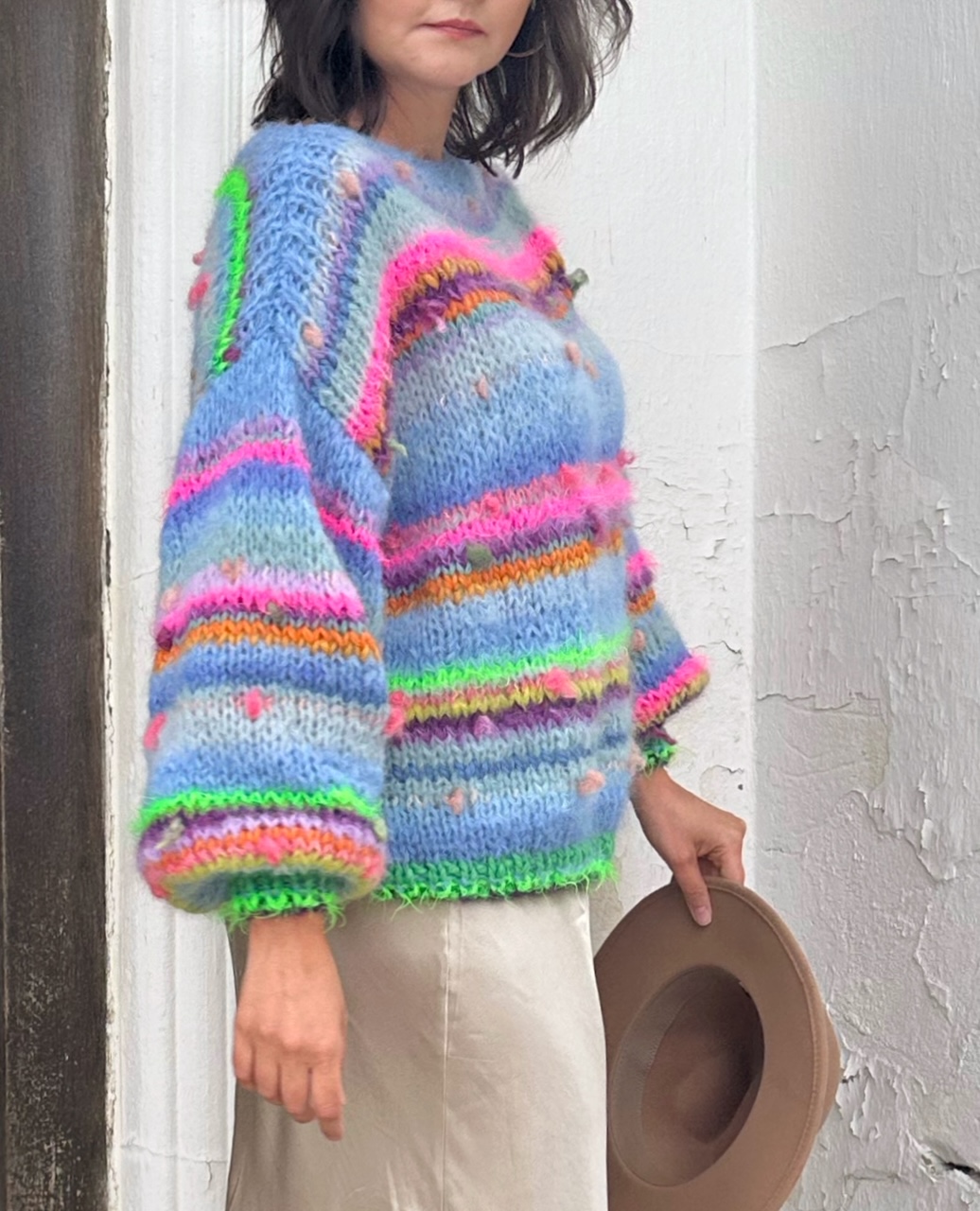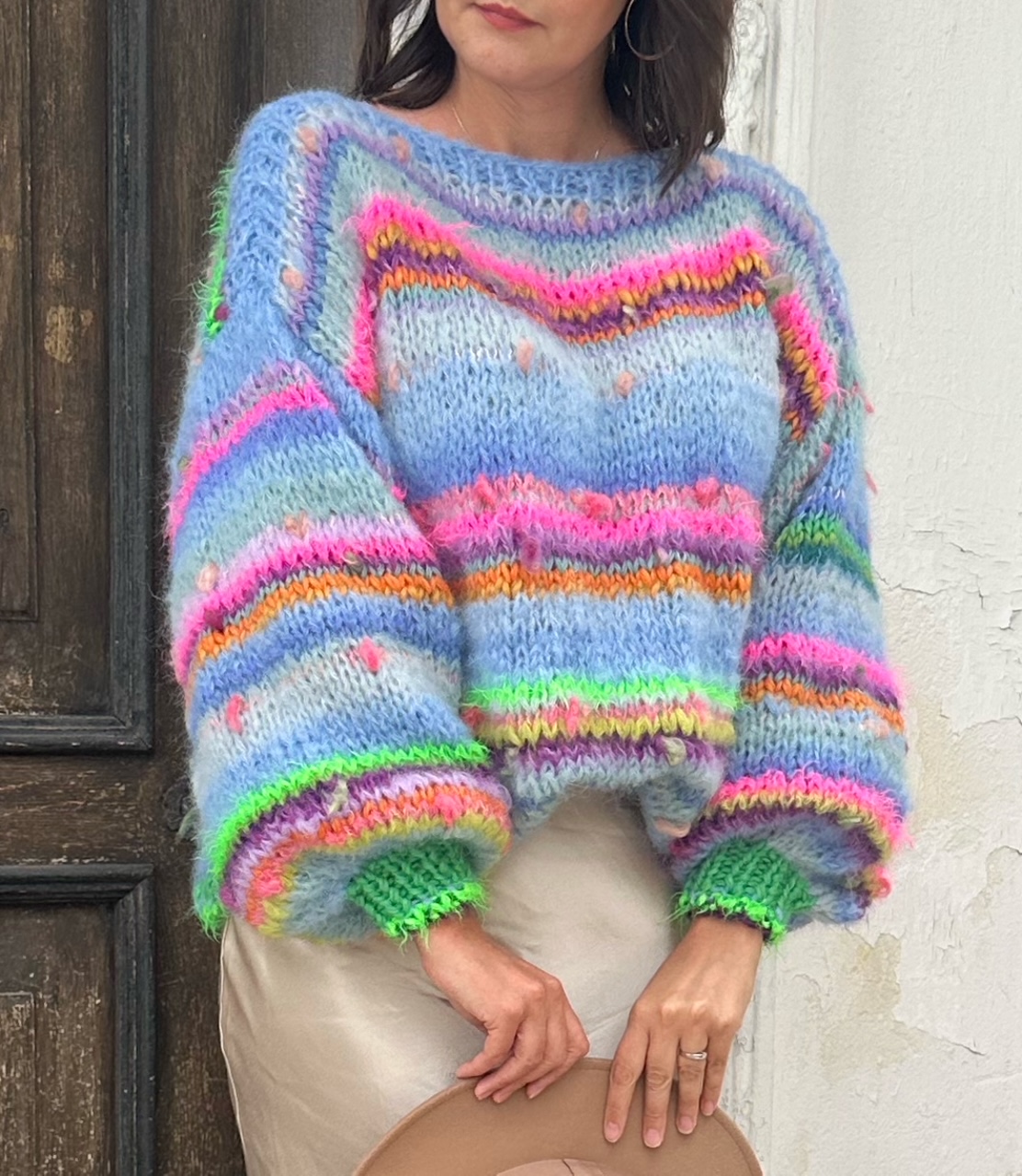 Sweter Blue Butterfly to energetyczne połączenie włóczek: alpaki, merino, jedwabiu , moheru z minimalną domieszką akrylu. Fantazyjne włóczki z kolorowymi nopkami dodają mu charakteru i oryginalności.Kardigan jest niezwykle kolorowy (w przewagą odcieni niebieskiego), puszysty i cudownie  miękki. To całoroczny model , dla kobiet które lubią naturalne materiały, wygodę i uwielbiają być zauważone.