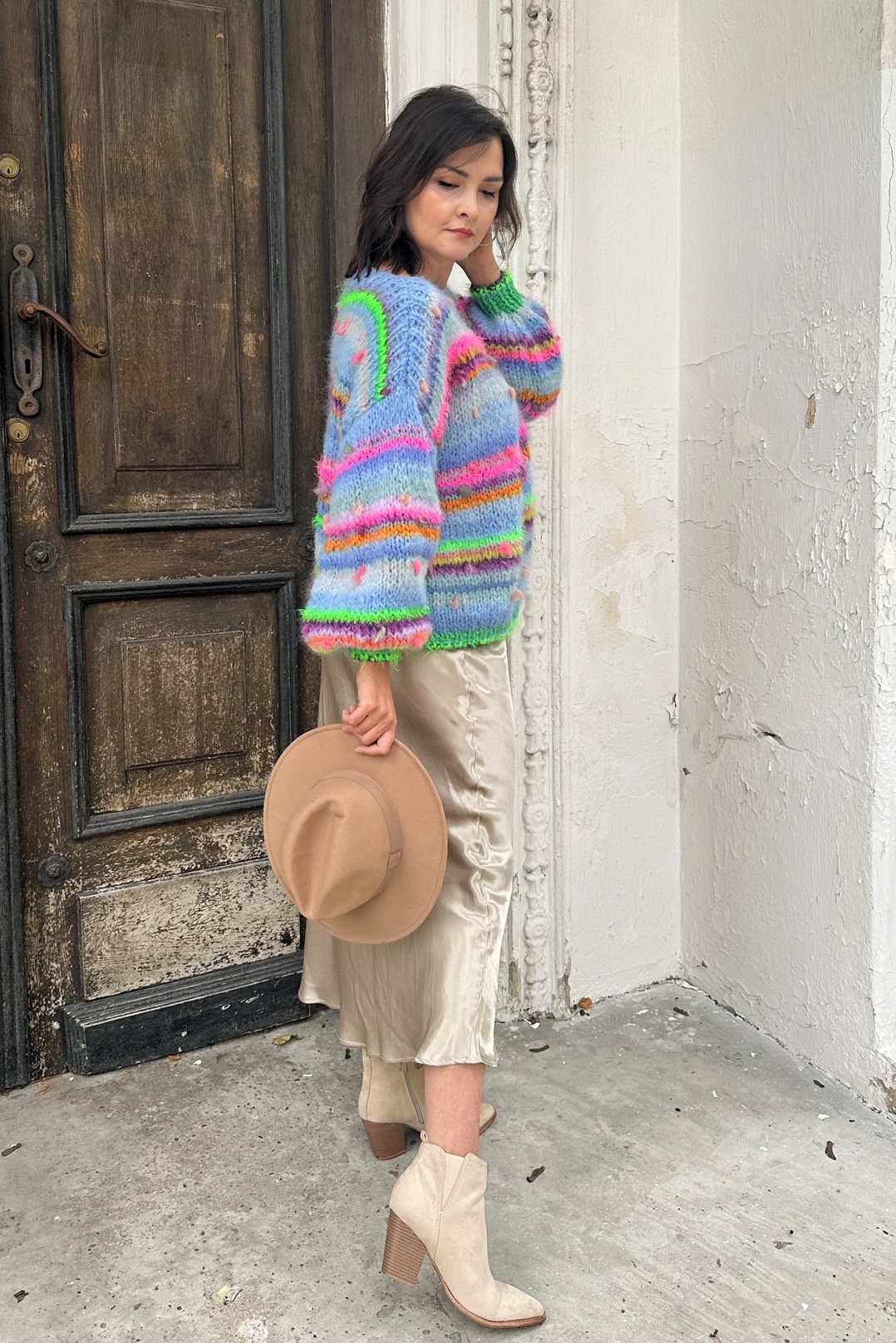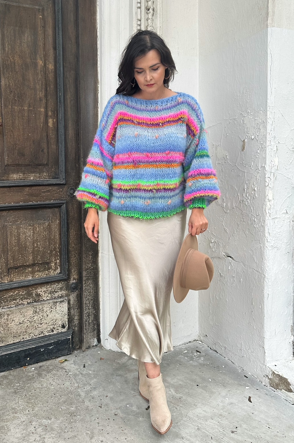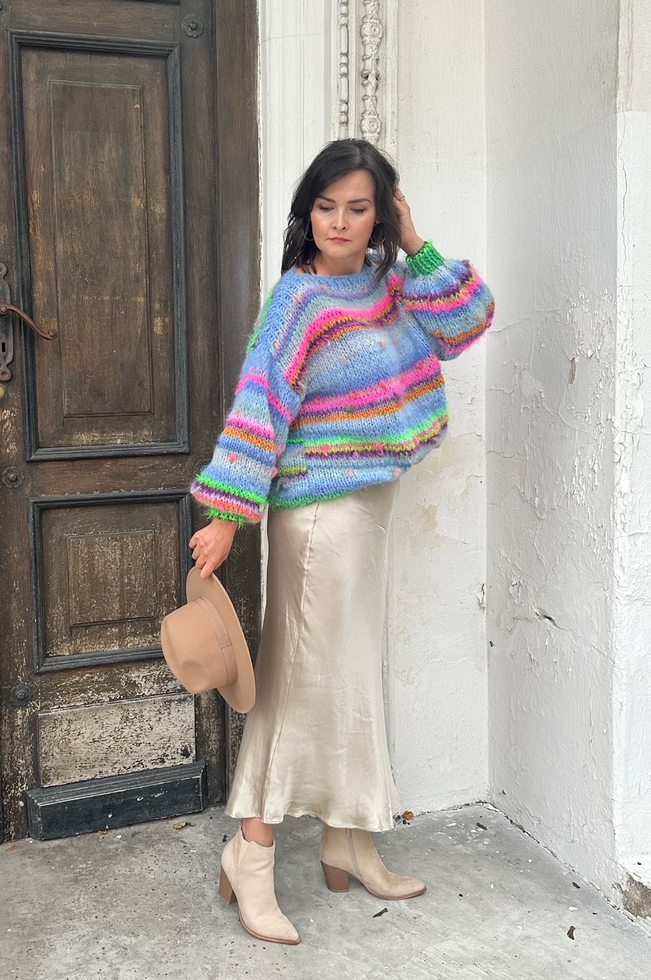 Sweter Blue Butterfly to energetyczne połączenie włóczek: alpaki, merino, jedwabiu , moheru z minimalną domieszką akrylu. Fantazyjne włóczki z kolorowymi nopkami dodają mu charakteru i oryginalności.Kardigan jest niezwykle kolorowy (w przewagą odcieni niebieskiego), puszysty i cudownie  miękki. To całoroczny model , dla kobiet które lubią naturalne materiały, wygodę i uwielbiają być zauważone.