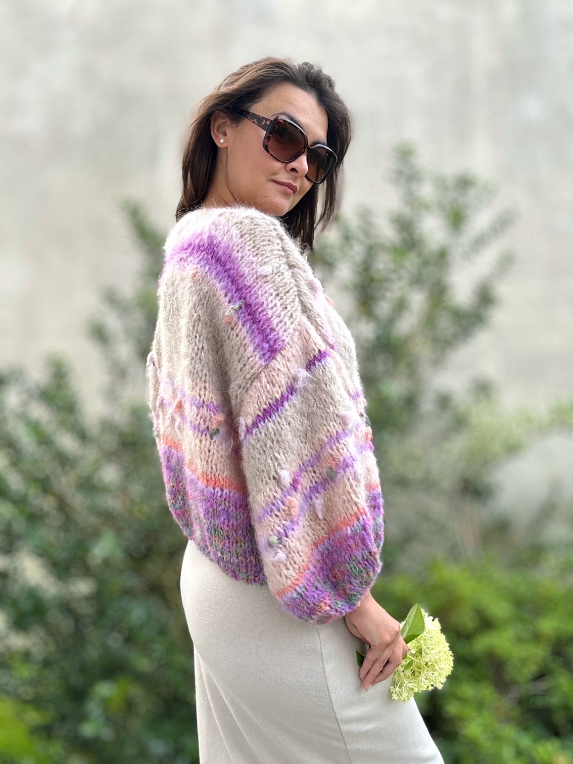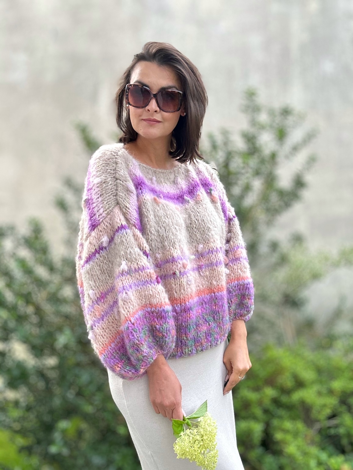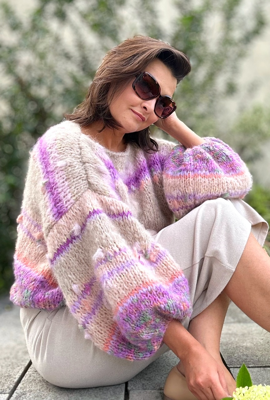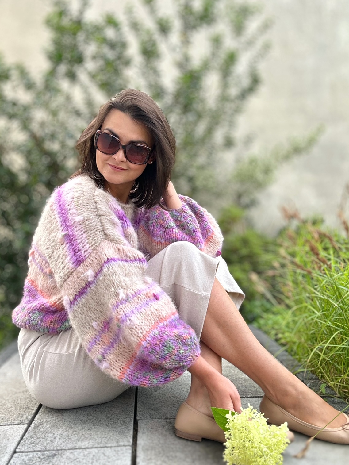Sweterek Emma jest lekki, przewiewny , efektowny. Spleciony ręcznie na drutach z naturalnych włoczek (głównie alpaka, merino, jedwab) z niewielką domieszką włókien sztucznych i włóczek fantazyjnych . Szerokie rękawy są bardzo wygodne i efektowne, a sam sweterek lekko oversizowy dla romiaru M.
